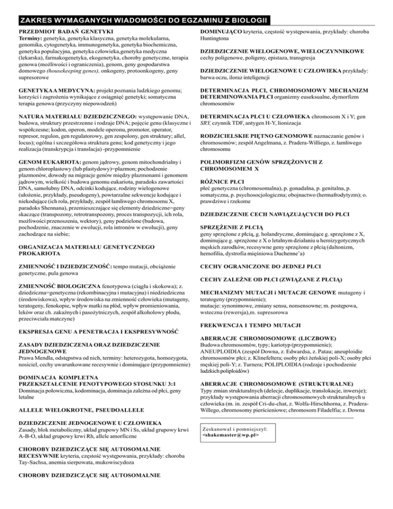 ZAKRES WYMAGANYCH WIADOMOŚCI DO EGZAMINU Z BIOLOGII PRZEDMIOT BADAŃ GENETYKI Terminy: genetyka, genetyka klasyczna, genetyka molekularna, genomika, cytogenetyka, immunogenetyka, genetyka biochemiczna, genetyka populacyjna, genetyka człowieka,genetyka medyczna (lekarska), farmakogenetyka, ekogenetyka, choroby genetyczne, terapia genowa (możliwości i ograniczenia), genom, geny gospodarstwa domowego (housekeeping genes), onkogeny, protoonkogeny, geny supresorowe DOMINUJĄCO kryteria, częstość występowania, przykłady: choroba Huntingtona GENETYKA A MEDYCYNA: projekt poznania ludzkiego genomu; korzyści i zagrożenia wynikające z osiągnięć genetyki; somatyczna terapia genowa (przyczyny niepowodzeń) DETERMINACJA PŁCI, CHROMOSOMOWY MECHANIZM DETERMINOWANIA PŁCI organizmy euseksualne, dymorfizm chromosomów NATURA MATERIAŁU DZIEDZICZNEGO: występowanie DNA, budowa, struktury przestrzenne i rodzaje DNA; pojęcie genu (klasyczne i współczesne; kodon, operon, modele operonu, promotor, operator, represor, regulon, gen regulatorowy, gen zespolony, gen struktury; allel, locus); ogólna i szczegółowa struktura genu; kod genetyczny i jego realizacja (transkrypcja i translacja) -przypomnienie DETERMINACJA PŁCI U CZŁOWIEKA chromosom X i Y; gen SRY, czynnik TDF, antygen H-Y, lionizacja GENOM EUKARIOTA: genom jądrowy, genom mitochondrialny i genom chloroplastowy (lub plastydowy)=plazmon; pochodzenie plazmonów, dowody na migracje genów między plazmonami i genomem jądrowym, wielkość i budowa genomu eukariota, paradoks zawartości DNA, samolubny DNA, odcinki kodujące, rodziny wielogenowe (ułożenie, przykłady, pseudogeny), powtarzalne sekwencje kodujące i niekodujące (ich rola, przykłady, zespół łamliwego chromosomu X, paradoks Shennana), przemieszczające się elementy dziedziczne=geny skaczące (transpozony, retrotranspozony, proces transpozycji, ich rola, możliwości przenoszenia, wektory), geny podzielone (budowa, pochodzenie, znaczenie w ewolucji, rola intronów w ewolucji), geny zachodzące na siebie; POLIMORFIZM GENÓW SPRZĘŻONYCH Z CHROMOSOMEM X ORGANIZACJA MATERIAŁU GENETYCZNEGO PROKARIOTA ZMIENNOŚĆ I DZIEDZICZNOŚĆ: tempo mutacji, obciążenie genetyczne, pula genowa DZIEDZICZENIE WIELOGENOWE, WIELOCZYNNIKOWE cechy poligenowe, poligeny, epistaza, transgresja DZIEDZICZENIE WIELOGENOWE U CZŁOWIEKA przykłady: barwa oczu, iloraz inteligencji RODZICIELSKIE PIĘTNO GENOMOWE naznaczanie genów i chromosomów; zespół Angelmana, z. Pradera-Williego, z. łamliwego chromosomu RÓŻNICE PŁCI płeć genetyczna (chromosomalna), p. gonadalna, p. genitalna, p. somatyczna, p. psychosocjologiczna; obojnactwo (hermafrodytyzm); o. prawdziwe i rzekome DZIEDZICZENIE CECH NAWIĄZUJĄCYCH DO PŁCI SPRZĘŻENIE Z PŁCIĄ geny sprzężone z płcią, g. holandryczne, dominujące g. sprzężone z X, dominujące g. sprzężone z X o letalnym działaniu u hemizygotycznych męskich zarodków, recesywne geny sprzężone z płcią (daltonizm, hemofilia, dystrofia mięśniowa Duchenne’a) CECHY OGRANICZONE DO JEDNEJ PŁCI CECHY ZALEŻNE OD PŁCI (ZWIĄZANE Z PŁCIĄ) ZMIENNOŚĆ BIOLOGICZNA fenotypowa (ciągła i skokowa); z. dziedziczna=genetyczna (rekombinacyjna i mutacyjna) i niedziedziczna (środowiskowa), wpływ środowiska na zmienność człowieka (mutageny, teratogeny, fenokopie, wpływ matki na płód, wpływ promieniowania, leków oraz ch. zakaźnych i pasożytniczych, zespół alkoholowy płodu, przeciwciała matczyne) MECHANIZMY MUTACJI i MUTACJE GENOWE mutageny i teratogeny (przypomnienie); mutacje: synonimowe, zmiany sensu, nonsensowne; m. postępowa, wsteczna (rewersja),m. supresorowa FREKWENCJA I TEMPO MUTACJI EKSPRESJA GENU A PENETRACJA I EKSPRESYWNOŚĆ ZASADY DZIEDZICZENIA ORAZ DZIEDZICZENIE JEDNOGENOWE Prawa Mendla, odstępstwa od nich, terminy: heterozygota, homozygota, nosiciel, cechy uwarunkowane recesywnie i dominujące (przypomnienie) DOMINACJA KOMPLETNA PRZEKSZTAŁCENIE FENOTYPOWEGO STOSUNKU 3:1 Dominacja połowiczna, kodominacja, dominacja zależna od płci, geny letalne ALLELE WIELOKROTNE, PSEUDOALLELE DZIEDZICZENIE JEDNOGENOWE U CZŁOWIEKA Zasady, blok metaboliczny, układ grupowy MN i Ss, układ grupowy krwi A-B-O, układ grupowy krwi Rh, allele amorficzne CHOROBY DZIEDZICZĄCE SIĘ AUTOSOMALNIE RECESYWNIE kryteria, częstość występowania, przykłady: choroba Tay-Sachsa, anemia sierpowata, mukowiscydoza CHOROBY DZIEDZICZĄCE SIĘ AUTOSOMALNIE ABERRACJE CHROMOSOMOWE (LICZBOWE) Budowa chromosomów, typy; kariotyp (przypomnienie); ANEUPLOIDIA (zespół Downa, z. Edwardsa, z. Patau; aneuploidie chromosomów płci; z. Klinefeltera; osoby płci żeńskiej poli-X; osoby płci męskiej poli-Y; z. Turnera; POLIPLOIDIA (rodzaje i pochodzenie ludzkich poliploidów) ABERRACJE CHROMOSOMOWE (STRUKTURALNE) Typy zmian strukturalnych (delecje, duplikacje, translokacje, inwersje); przykłady występowania aberracji chromosomowych strukturalnych u człowieka (m. in. zespół Cri-du-chat, z. Wolfa-Hirschhorna, z. PraderaWillego, chromosomy pierścieniowe; chromosom Filadelfia; z. Downa Zeskanowal i pomniejszyl: <[email protected]>