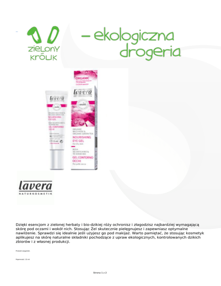 Dzięki esencjom z zielonej herbaty i bio-dzikiej róży ochronisz i złagodzisz najbardziej wymagającą skórę pod oczami i wokół nich. Stosując Żel skutecznie pielęgnujesz i zapewniasz optymalne nawilżenie. Sprawdzi się idealnie jeśli użyjesz go pod makijaż. Warto pamiętać, że stosując kosmetyk aplikujesz na skórę naturalne składniki pochodzące z upraw ekologicznych, kontrolowanych dzikich zbiorów i z własnej produkcji. Produkt wegański. Pojemność: 15 ml Strona 1 z 2 Składniki: wodno-alkoholowy wyciąg z dzikiej róży*, olej glicerynowy, roślinna gliceryna, olej z oliwek*, czerwone algi, masło shea*, olej z orzechów macadamia*, squalan, witamina E, hartowany olej kokosowy, naturalne substancje żelujące, kwas hialuronowy, ekstrakt z kwiatu dzikiego bzu*, substancja z korzenia lukrecji, lecytyna, ekstrakt z zielonej herbaty, olej migdałowy*, olej z jojoby*, olej z kwiatu słonecznika, sterole roślinne, witamina C, ksantan, mieszanka olejków eterycznych *składniki pochodzące z upraw ekologicznych Strona 2 z 2