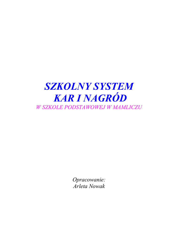SZKOLNY SYSTEM KAR I NAGRÓD W SZKOLE PODSTAWOWEJ W MAMLICZU Opracowanie: Arleta Nowak Wychowanie dziecka jest sztuką, z której nie wszyscy zdajemy sobie sprawę. Dopiero kiedy pojawią się wyraźne trudności, gorączkowo szukamy odpowiedzi na pytanie: dlaczego postępuje ono nie tak jak pragniemy? Pierwszym środowiskiem, które uczy dziecko w naturalny sposób form zachowania jest rodzina. Jeżeli rodzice akceptują siebie i swoje dzieci, wówczas tworzy się pełna, ciepła atmosfera, w której dzieci wzrastają bez skrzywień i wypaczeń. W korzystnym układzie wszystkich elementów systemu rodzinnego można prawidłowo wychować dziecko bez kar, a także nagród w postaci świadczeń na jego rzecz za poprawne wypełnianie powinności. Nagrody i kary nie są najważniejszą formą oddziaływania. Natomiast jeżeli coś się nie uda w wychowaniu, jeżeli zostanie ono zakłócone przez popełnione błędy, wówczas wyłania się potrzeba stosowania środków zaradczych w postaci nagradzania i karania. W tym zakresie rodzice i opiekunowie popełniają, często nie uświadomione błędy. Dlatego też skoncentrowanie uwagi na tej dziedzinie wychowania może być owocne. Warto zwrócić uwagę na etap życia, przez który każdy z nas musi przejść – dzieciństwo. Dzieciństwo to okres dokumentowania siebie – skuteczności i sprawstwa. W tym czasie można nauczyć dzieci skutecznych sposobów radzenia sobie z zadaniami, co wprost generuje szanse na powodzenie w nauce szkolnej opartej głównie na różnych zadaniach. W tym okresie można człowieka przekonać, że: - potrafi, bo jest mądry, ciekawy ,potrafi takim być jeśli chce; - może osiągnąć sukces, jeśli zechce, posłucha, nauczy się, podejmie wysiłek włączenia się w działania; - możliwe są także porażki, niepowodzenia, straty, ponieważ wielu rzeczy jeszcze się nie rozpoznało, nie zrozumiało; - może się nauczyć, ale i także musi oduczyć nieskutecznych sposobów działania. Można niestety dziecku również zakomunikować, że: - niewiele znaczy - niewielu obchodzi - niewiele od niego zależy - niewiele może osiągnąć. Dzieciństwo wyposaża człowieka w ważny dla budowania struktur szans życiowych obraz społeczeństwa wraz z podstawowymi mechanizmami nim kierującymi. Instytucje edukacyjne natomiast (przedszkola, szkoły) są pierwszymi, poza rodziną, które te mechanizmy wytwarzają. Rola bodźców pozytywnych w zapewnianiu dziecku równowagi psychicznej. Nagradzanie i karanie jest uzależnione od systemu wychowania. Dorośli patrzą na dziecko z perspektywy swoich dorosłych doświadczeń, a dziecko, jak uważał Janusz Korczak powinno być tym, kim jest – dzieckiem. Dziecko powinno mieć prawo do dnia dzisiejszego. Nie można go traktować jedynie z punktu widzenia przyszłości, w którą wejdzie. Ma prawo do swojego dziecięcego świata, z którego musi stopniowo wyrastać, podejmując coraz trudniejsze zadania. Szacunek dla jego trudności i kłopotów wymaga od nas umiejętności wnikania w przeżycia dziecka i zdolności do udzielania mu pomocy. W wychowaniu rzadko stosuje się przemyślany system nagród. Rodzice czy opiekunowie na ogół zastanawiają się nad tym, jak ograniczyć swobody dziecka, jak zmusić je do posłuszeństwa, do uczenia się, jak karać za przewinienia, chociaż zdarza się często, że stosują kary bez żadnego zastanowienia, w zależności od humoru. Sprawianie dziecku przyjemności ( nagroda ) towarzyszy zwykle uroczystościom rodzinnym, świętom, imieninom czy urodzinom. Jednakże otrzymywanie prezentów nie jest nagrodą. Nagrodę uzyskuje się za coś konkretnego, za dodatkowy trud, za wysiłek nie związany z wypełnianiem codziennych obowiązków. Jeśli premiuje się za prace należące do obowiązków dziecka, to tylko wówczas, kiedy są one wykonane wyjątkowo starannie, z dużym nakładem dodatkowego wysiłku. Nagroda ma być bodźcem wzmacniającym postępowanie pozytywne, zachęcającym do solidnej pracy lub nauki, do zachowań znajdujących wysokie uznanie w rodzinie i innych grupach społecznych. Tak zrozumiana nagroda spełnia następujące funkcje: a) umacnia w dziecku wiarę we własne możliwości b) realizuje potrzebę uznania i sukcesu c) zachęca do podejmowania coraz trudniejszych zadań d) dostarcza dodatnich uczuć: radości i dobrego samopoczucia e) wzmacnia więzi uczuciowe z osobami nagradzającymi f) działa dodatnio na tych, którzy są świadkami nagradzania. Przy rygorystycznych wymaganiach przekraczających możliwości dziecka, i przy braku bodźców zachęcających do wysiłku, może ono nabrać przekonania o swej niepełnej wartości, co ogromnie utrudni mu prawidłowy rozwój i pełne wykorzystanie własnych zdolności. Podobnie groźne w skutkach są wymagania minimalne. Wyręczanie we wszystkim, przesadna pomoc gasi inicjatywę i zdobywanie samodzielności. Wiele kłopotów powoduje przesadne chwalenie. Rodzi to w dziecku egoizm, dziecko może być nie lubiane, odtrącane i skazane na samotność. Z wiarą we własne siły wiąże się potrzeba uznania i sukcesu. Człowiek dorosły czuje się źle, jest nieszczęśliwy, gdy jego praca nie znajduje należytej aprobaty, kiedy nic mu się nie udaje, Dziecko jako mniej pewne siebie i mające mniej doświadczeń silnie reaguje na niepowodzenia. Dziecko rozsądnie nagradzane próbuje własnych sił w pracy – dziecko dorasta do coraz bardziej skomplikowanych zadań i staje się odpowiedzialne za to, co robi. Wartość nagrody polega również na tym, że dostarcza nagrodzonemu pozytywnych przeżyć uczuciowych, które korzystnie wpływają na osobowość. Dobre samopoczucie i radość życia muszą wypełniać całe dzieciństwo. W takiej atmosferze łatwiej znosi się kłopoty, jakie niesie ze sobą codzienne życie, nie ulega się przedwczesnemu zgorzknieniu i pesymizmowi. Radosne dziecko to w przyszłości pełen optymizmu i radości życia człowiek dorosły. Nagroda 