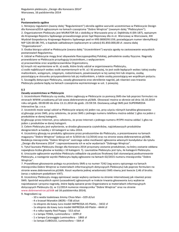 Regulamin plebiscytu „Design dla Konesera 2014” Warszawa, 16 października 2014 §1 Postanowienia ogólne 1. Niniejszy regulamin (zwany dalej "Regulaminem") określa ogólne warunki uczestnictwa w Plebiscycie Design dla Konesera2014 ogłoszonym na łamach czasopisma "Dobre Wnętrze" (zwanym dalej "Plebiscytem"). 2. Organizatorem Plebiscytu jest MURATOR SA z siedzibą w Warszawie przy ul. Dęblińska 6 (04-187), wpisanym do Krajowego Rejestru Sądowego prowadzonego przez Sąd Rejonowy dla m.st. Warszawy w Warszawie, XIII Wydział Gospodarczy Krajowego Rejestru Sądowego pod nr KRS 0000291159; posiadającym numer identyfikacji NIP 526-00-08-745, o kapitale zakładowym (opłaconym w całości) 81.850.000,00 zł. zwana dalej "Organizatorem". 3. Osoba biorąca udział w Plebiscycie (zwana dalej "Uczestnikiem") wyraża zgodę na zastosowanie wszystkich postanowień Regulaminu. 4. Udział w Plebiscycie mogą brać obywatele Rzeczypospolitej Polskiej, pełnoletnie osoby fizyczne. Nagrody przewidziane w Plebiscycie przysługują Uczestnikom, z wyłączeniem: a) pracowników oraz współpracowników Organizatora, b) innych niż wymienione w lit. a) osób, które brały udział w organizowaniu Plebiscytu, c) osób najbliższych wobec osób wymienionych w lit. a) i b) powyżej, to jest osób będących wobec takiej osoby małżonkiem, wstępnym, zstępnym, rodzeństwem, powinowatym w tej samej linii lub stopniu, osobą pozostającą w stosunku przysposobienia lub jej małżonkiem, a także osobą pozostającą we wspólnym pożyciu. 5. Szczegóły dotyczące Plebiscytu, zasady głosowania oraz określenie nagród, jak również czas trwania Plebiscytu podane będą na łamach czasopisma wymienionego w ust. 1 powyżej. §2 Zasady uczestnictwa w Plebiscycie 1. Uczestnikami Plebiscytu są osoby, które zagłosują w Plebiscycie za pomocą SMS-ów lub poprzez formularz na stronach WWW.urzadzamy.pl lub www.dobrewnetrze.pl/ddk. Głosować można w okresie od dnia 16.10.2014 roku od godz. 00:00:00 do dnia 13.11.2014 do godz. 23:59:59. Dostawcą usługi SMS jest SUPERMEDIA Interactive Sp. z o.o. 2. Uczestnik może wziąć udział w Plebiscycie więcej niż jeden raz, przy użyciu różnych kanałów głosowania: a) głosując przez SMS, przy założeniu, że przez SMS z jednego numeru telefonu można oddać 1 głos na jeden z produktów w danej kategorii, b) głosując przez Internet, przy założeniu, że przez Internet z jednego numeru IP/IPX można oddać 1 głos na jeden z produktów w danej kategorii. 3. Celem Plebiscytu jest wyłonienie, w drodze głosowania czytelników, najciekawszych produktów designerskich w każdej z 10 kategorii w roku 2014. 4. Uczestnicy głosują na produkty zgłoszone przez producentów do Plebiscytu, a prezentowane na łamach magazynu "Dobre Wnętrze" (edycja od nr 3/2014 do 11/2014) oraz na stronie www.dobrewnetrze.pl/ddk. Redakcja miesięcznika "Dobre Wnętrze" zastrzega sobie możliwość zgłoszenia własnych kandydatur do tytułu „Design dla Konesera 2014” i zaprezentowania ich w w/w wydaniach "Dobrego Wnętrza". 5. Tytuł laureata Plebiscytu Design dla Konesera 2014 przyznany zostanie produktowi, na który zostanie oddana największa liczba głosów w każdej z 10 kategorii. Tj. Laureatów Plebiscytu jest tylu, ile kategorii Plebiscytu. 6. Uroczyste ogłoszenie wyników Plebiscytu odbędzie się podczas finałowej Gali stanowiącej podsumowanie Plebiscytu, a następnie wyniki Plebiscytu będą ogłoszone na łamach 02/2015 numeru miesięcznika "Dobre Wnętrze". 7. Prawidłowe głosowanie polega na przesłaniu SMS-a na numer 7242 (wg wzoru opisanego na łamach miesięcznika Dobre Wnętrze w materiałach informacyjnych dotyczących Plebiscytu) lub poprzez formularz na stronie www.dobrewnetrze.pl/ddk. Koszt wysłania jednej wiadomości SMS równy jest kwocie 2,46 zł brutto. (wraz z należnym podatkiem VAT). 8. Uczestnicy Plebiscytu mogą opiniować swoje wybory zarówno na stronie internetowej jak również przez SMS. Spośród wszystkich opinii (uzasadnień) zgłoszonych w trakcie trwania głosowania Jury wybierze najciekawsze i przyzna nagrody, które będą opisane przez Organizatora w materiałach informacyjnych dotyczących Plebiscytu (tj. w 11/2014 numerze miesięcznika "Dobre Wnętrze" oraz na stronie www.dobrewnetrze.pl/ddk od 16 października 2014). 9. Nagrodami są: - 10 x woda toaletowa Jimmy Choo Man –329 zł/szt - 4 x krzeseł Manekin (IKER) –738 zł/szt - 1x ekspres do kawy Jura model IMPRESSA A5 Platin, - 3432 zł - 1x ekspres do kawy Jura model IMPRESSA A9 Platin - 4444 zł - 4 x rolka tapety Red Poppy - 553 zł/szt - 1 x lampa TEMA, Luminosfera – 1699 zł - 1 x lampa Caravaggio Luminosfera - 1865 zł - 1x lampa CUBOLED, Luminosfera – 564 zł - 3 x voucher na romantyczną kolację dla 2 osób – 300 zł/szt - 1 x słuchawki BEOPLAY H6 - 1476 zł - 10 x komplet do whisky CLUB – 49 zł/szt. - 10 x komplet kawowy KOKO – 48 zł/szt. - 10 x zestaw do wina – 75 zł/szt. - 5 x lampa Capri – 439 zł/szt. - 1 x stół BUFFAL – 1790 zł - 3 x zestaw młynków elektrycznych (Westwing) – 200 zł/kpl. - 5 x zestaw pojemników JULES (Westwing) – 50 zł/kpl. - 5 x komplet poduszek KUDDAR (Westwing) – 110 zł/kpl. - 3 x komplet poduszek Paris (Westwing) – 60 zł/kpl. - 1 x czajnik-zaparzacz (Westwing) – 240 zł 10. Osoby uprawnione do odbioru nagród zostaną powiadomione o tym fakcie przez Organizatora telefonicznie (za pośrednictwem numeru telefonu komórkowego, z którego uczestnik wysłał SMS-a/ numeru podanego w formularzu internetowym) w terminie 30 dni od dnia opublikowania wyników. Przedstawiciel Organizatora będzie dzwonił do laureatów w dniach roboczych, w godzinach 9.00-17.00. Próba uzyskania połączenia z laureatem podejmowana będzie trzykrotnie, przy czym za każdym razem oczekiwanie na połączenie obejmowało będzie minimum 5 sygnałów. 11. W przypadku nieodebrania telefonu lub rezygnacji z nagrody, nagroda 