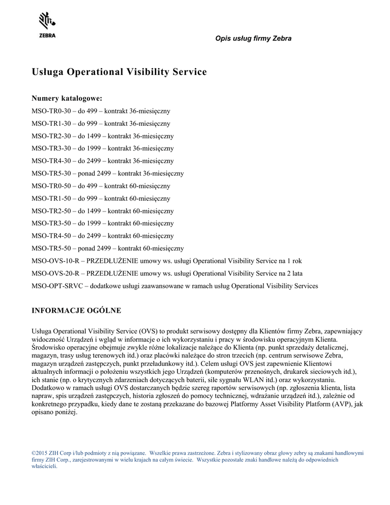 Opis usług firmy Zebra Usługa Operational Visibility Service Numery katalogowe: MSO-TR0-30 – do 499 – kontrakt 36-miesięczny MSO-TR1-30 – do 999 – kontrakt 36-miesięczny MSO-TR2-30 – do 1499 – kontrakt 36-miesięczny MSO-TR3-30 – do 1999 – kontrakt 36-miesięczny MSO-TR4-30 – do 2499 – kontrakt 36-miesięczny MSO-TR5-30 – ponad 2499 – kontrakt 36-miesięczny MSO-TR0-50 – do 499 – kontrakt 60-miesięczny MSO-TR1-50 – do 999 – kontrakt 60-miesięczny MSO-TR2-50 – do 1499 – kontrakt 60-miesięczny MSO-TR3-50 – do 1999 – kontrakt 60-miesięczny MSO-TR4-50 – do 2499 – kontrakt 60-miesięczny MSO-TR5-50 – ponad 2499 – kontrakt 60-miesięczny MSO-OVS-10-R – PRZEDŁUŻENIE umowy ws. usługi Operational Visibility Service na 1 rok MSO-OVS-20-R – PRZEDŁUŻENIE umowy ws. usługi Operational Visibility Service na 2 lata MSO-OPT-SRVC – dodatkowe usługi zaawansowane w ramach usług Operational Visibility Services INFORMACJE OGÓLNE Usługa Operational Visibility Service (OVS) to produkt serwisowy dostępny dla Klientów firmy Zebra, zapewniający widoczność Urządzeń i wgląd w informacje o ich wykorzystaniu i pracy w środowisku operacyjnym Klienta. Środowisko operacyjne obejmuje zwykle różne lokalizacje należące do Klienta (np. punkt sprzedaży detalicznej, magazyn, trasy usług terenowych itd.) oraz placówki należące do stron trzecich (np. centrum serwisowe Zebra, magazyn urządzeń zastępczych, punkt przeładunkowy itd.). Celem usługi OVS jest zapewnienie Klientowi aktualnych informacji o położeniu wszystkich jego Urządzeń (komputerów przenośnych, drukarek sieciowych itd.), ich stanie (np. o krytycznych zdarzeniach dotyczących baterii, sile sygnału WLAN itd.) oraz wykorzystaniu. Dodatkowo w ramach usługi OVS dostarczanych będzie szereg raportów serwisowych (np. zgłoszenia klienta, lista napraw, spis urządzeń zastępczych, historia zgłoszeń do pomocy technicznej, wdrażanie urządzeń itd.), zależnie od konkretnego przypadku, kiedy dane te zostaną przekazane do bazowej Platformy Asset Visibility Platform (AVP), jak opisano poniżej. ©2015 ZIH Corp i/lub podmioty z nią powiązane. Wszelkie prawa zastrzeżone. Zebra i stylizowany obraz głowy zebry są znakami handlowymi firmy ZIH Corp., zarejestrowanymi w wielu krajach na całym świecie. Wszystkie pozostałe znaki handlowe należą do odpowiednich właścicieli. Opis usług firmy Zebra Usługa OVS jest świadczona z wykorzystaniem Platformy AVP, która obejmuje oparte na chmurze narzędzie do zarządzania urządzeniami mobilnymi (Narzędzie MDM), portal serwisowy (Portal OVS) oraz różne połączenia do przekazywania danych do Zebry. Opcjonalnie usługa OVS może także być podłączona do systemów obsługi zaplecza Klienta. Wykorzystywanym Narzędziem MDM jest SOTI MobiControl, a OVS obejmuje dostęp upoważnionych użytkowników do Narzędzia MDM. ©2015 ZIH Corp i/lub podmioty z nią powiązane. Wszelkie prawa zastrzeżone. Zebra i stylizowany obraz głowy zebry są znakami handlowymi firmy ZIH Corp., zarejestrowanymi w wielu krajach na całym świecie. Wszystkie pozostałe znaki handlowe należą do odpowiednich właścicieli. Opis usług firmy Zebra Korzyści Wielkość rozwiązania Kod produktu • 250-2500+ Urządzeń OVS Stan zasobów, trendy wykorzystania, lokalizacja, statystyki i raporty dotyczące urządzeń Pulpit operacyjny, konfigurowaln e widoki i progi Raporty i statystyki oparte na danych ze środowiska operacyjnego Kompleksowa usługa oparta na chmurze, w tym konsola MDM • • • Widoczność całej floty urządzeń Zebra w firmie i nie tylko Uzyskanie dogłębnych informacji operacyjnych Możliwość identyfikacji i lokalizacji urządzeń i drukarek przenośnych w firmie oraz dostęp do informacji o ich stanie Korzystanie z usługi zarządzanej na bazie platformy wzrostu, współpracy, najlepszych praktyk i skalowalności doświadczenia ze wsparciem ze strony Zebra Technologies. MSO-TR0- 30/50 – 499 MSO-TR130/50 – 999 MSO-TR230/50 – 1499 MSO-TR3- 30/50 – 1999 MSO-TR4 30/50– 2499 MSO-TR5- 30/50 – 2499 MSO-OVS-10- R– PRZEDŁUŻE NIE na 1 rok MSO-OVS-20R– PRZEDŁUŻE NIE na 2 lata MSO-OPTSRVC – dodatkowe usługi zaawansowane 1. Opis Wprowadzenie do infrastruktury Oparta na chmurze platforma zarządzania i integracji, zapewniająca widoczność i znacznie ulepszoną kontrolę Rozwiązanie opracowane specjalnie z myślą o zasobach o krytycznym znaczeniu dla firmy w wybranych branżach Opracowane dla mobilnych urządzeń komputerowych i drukarek przenośnych Zebra Zakres usług: od podstawowej widoczności zasobów po transformacyjne, głęboko zintegrowane usługi zdefiniowane na podstawie umowy SLA i zapewniające określone wyniki biznesowe • Obejmuje wprowadzenie pulpitu operacyjnego i platformy MDM oraz podstawowej konfiguracji MDM. • Docelowe ramy czasowe to 4 tygodnie od finalizacji zamówienia do przygotowania narzędzia MDM i portalu do działania. Termin „finalizacja zamówienia” oznacza, że otrzymano zlecenie, formularz zamówienia klienta został wypełniony i złożony, formularz (szablon) konfiguracji MDM został wypełniony i zatwierdzony przez firmę Zebra. OPIS PODSTAWOWYCH USŁUG Usługi OVS firmy Zebra 1. Zarządzany hosting Narzędzia MDM i Portalu OVS: ©2015 ZIH Corp i/lub podmioty z nią powiązane. Wszelkie prawa zastrzeżone. Zebra i stylizowany obraz głowy zebry są znakami handlowymi firmy ZIH Corp., zarejestrowanymi w wielu krajach na całym świecie. Wszystkie pozostałe znaki handlowe należą do odpowiednich właścicieli. Opis usług firmy Zebra Konfiguracją Narzędzia MDM zajmie się Zebra i jest to włączone w cenę OVS. Klient musi jednak podać dane w obowiązującym Formularzu Informacji MDM, aby Zebra mogła przeprowadzić konfigurację. Zadania firmy Zebra: • • • • • • • • • • Utworzenie grup Urządzeń (struktura folderów). Klient odpowiada za utw