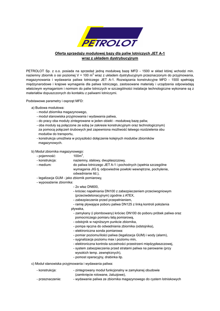 Oferta sprzedaży modułowej bazy dla paliw lotniczych JET A-1 wraz z układem dystrybucyjnym PETROLOT Sp. z o.o. posiada na sprzedaż jedną modułową bazę MFD - 1500 w skład której wchodzi min. 3 naziemny zbiornik o osi poziomej V = 100 m wraz z układem dystrybucyjnym przeznaczonym do przyjmowania, magazynowania i wydawania paliwa lotniczego JET A-1. Rozwiązania konstrukcyjne MFD - 1500 spełniają międzynarodowe i krajowe wymagania dla paliwa lotniczego, zastosowane materiały i urządzenia odpowiadają właściwym wymaganiom i normom do paliw lotniczych w szczególności instalacje technologiczne wykonane są z materiałów dopuszczonych do kontaktu z paliwami lotniczymi. Podstawowe parametry i osprzęt MFD: a) Budowa modułowa: - moduł zbiornika magazynowego, - moduł stanowiska przyjmowania i wydawania paliwa, - do pracy oba moduły zintegrowane w jeden obiekt - modułową bazę paliw, - oba moduły są połączone ze sobą (w zakresie konstrukcyjnym oraz technologicznym) za pomocą połączeń śrubowych jest zapewniona możliwość łatwego rozdzielenia obu modułów do transportu, - konstrukcja umożliwia w przyszłości dołączenie kolejnych modułów zbiorników magazynowych. b) Moduł zbiornika magazynowego: 3 - pojemność: 100m , - konstrukcja: naziemny, stalowy, dwupłaszczowy, - medium: do paliwa lotniczego JET A-1 i pochodnych (spełnia szczególne wymagania JIG tj. odpowiednie powłoki wewnętrzne, pochylenie, odwadnianie itd.), - legalizacja GUM - jako zbiornik pomiarowy, - wyposażenie zbiornika: - 2x właz DN600, - króciec napełniania DN100 z zabezpieczeniem przeciwogniowym (przeciwdetonacyjnym) zgodnie z ATEX, - zabezpieczenie przed przepełnieniem, - ramię pływające poboru paliwa DN125 z linką kontroli położenia pływaka, - zamykany (i plombowany) króciec DN100 do poboru próbek paliwa oraz pomocniczego pomiaru łatą pomiarową, - odstojnik w najniższym punkcie zbiornika, - pompa ręczna do odwadniania zbiornika (odstojnika), - elektroniczna sonda pomiarowa: - pomiar poziomu/ilości paliwa (legalizacja GUM) i wody (alarm), - sygnalizacja poziomu max i poziomu min, - elektroniczna kontrola szczelności przestrzeni międzypłaszczowej, - system zabezpieczenia przed stratami paliwa na parowanie (przy wysokich temp. zewnętrznych), - pomost operacyjny, drabinka itp. c) Moduł stanowiska przyjmowania i wydawania paliwa: - konstrukcja: - przeznaczenie: - zintegrowany moduł funkcjonalny w zamykanej obudowie (zamknięcie rolowane, żaluzjowe), - wydawanie paliwa ze zbiornika magazynowego do cystern lotniskowych - przyjmowanie paliwa z drogowych cystern transportowych do zbiornika magazynowego 3 - wydajność: 1000 - 1500 dm /min (przyjmowanie i wydawanie), - panel operatorski: - schemat technologiczny z wykazem elementów, - tabela ustawienia elementów manipulacyjnych dla poszczególnych funkcji, - manometr różnicowy, - manometr tłoczenia pompy, - mano-vakuometr podciśnienia ssania pompy, - manometr ciśnienia tankowania, - manometr ciśnienia fazy gazowej w zbiorniku magazynowym, - wszystkie manometry ze złączami do ich okresowego sprawdzania, - sygnalizacja przecieków przestrzeni międzypłaszczowej, - wyświetlacz ilości/poziomu paliwa i wody w zbiorniku, - włączniki START/ STOP itp. - filtracja paliwa lotniczego zgodnie z API 1581 edycja 5 podczas przyjmowania i wydawania, - filtr koalescencyjno-separacyjny – poziomy, - zapewniony dogodny dostęp do wymiany wkładów filtracyjnych, 3 - Qmin=1500 dm /min, - manometr różnicowy z funkcją kontroli sprawności, - zawór automatycznego odgazowania, - zawór bezpieczeństwa - 1MPa, - złącze poboru próbek, - zawór spustu odstoju, - wziernik odstojnika, - ogrzewanie odstojnika - skuteczność do - 25°C, automatyczna termoregulacja. - zespół pompowy: - 2x zespół pompowy (1 pompa pracuje, druga stanowi rezerwę): 3 - Q=1500 dm /min, - Prob. = wg. dostawcy, max. 6 bar, - napęd elektryczny 3x400V, - moc silnika elektrycznego, max. 18,5 kW, - obie pompy mogą pracować w pełni zamiennie poprzez przełączenie odpowiednich zaworów bez żadnych prac montażowych, instalacyjnych, - pompy samozasysające z głębokości min. 6m sł.c., - pompy zabezpieczone przed pracą na kawitacji/powietrzu, - filtr ochronny pompy, - przyjmowanie paliwa z cysterny transportowej: - szybkozłączem DN 100, - kontrola przed przepełnieniem zbiornika magazynowego, - uziemienie cysterny transportowej, - wąż ze złączem do hermetyzacji fazy gazowej, - układ odpowietrzania węża do przyjmowania, - wydawanie paliwa do cysterny lotniskowej: - wąż DN 65, - L= 5÷6 mb na samozwijającym zwijadle, 1 - szybkozłącze 2 /2” , - złącze awaryjnego rozłączania, - kpl. podlega odbiorowi TDT, - instalacja pomiarowa - podlega legalizacji GUM, - pomiar licznikiem elektronicznym z przeliczaniem objętości do V15, - nastawnik dawki, - miernik natężenia przepływu, - kontrola uziemienia cysterny, - zabezpieczenie przed przepełnieniem, - system Deadman zgodny z JIG, - hermetyzacja fazy gazowej jak na przyjmowaniu, d) Inne: - oświetlenie elektryczne do pracy w nocy, 3 - zbiornik zlewek i odstojów Vmin= 20 dm , - szafka na przybory podręczne, próbki itp. - kompletna dokumentacja (instrukcje stanowiskowe, instrukcje rozruchowe). Rysunek poglądowy modułowej bazy MFD stanowi załącznik nr 1 Osoba do kontaktu: Grzegorz Zwoliński tel. 695 672 649, Stanisław Podbielski tel. 601 326 343. Oferty zakupu należy kierować na adres: [email protected] [email protected]