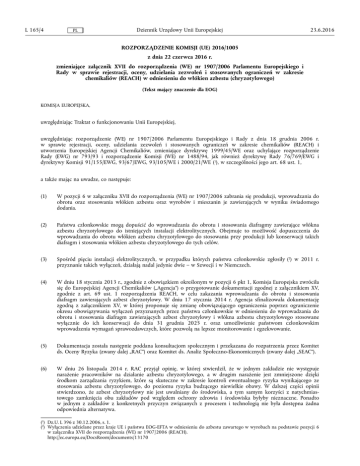 L 165/4 Dziennik Urzędowy Unii Europejskiej PL 23.6.2016 ROZPORZĄDZENIE KOMISJI (UE) 2016/1005 z dnia 22 czerwca 2016 r. zmieniające załącznik XVII do rozporządzenia (WE) nr 1907/2006 Parlamentu Europejskiego i Rady w sprawie rejestracji, oceny, udzielania zezwoleń i stosowanych ograniczeń w zakresie chemikaliów (REACH) w odniesieniu do włókien azbestu (chryzotylowego) (Tekst mający znaczenie dla EOG) KOMISJA EUROPEJSKA, uwzględniając Traktat o funkcjonowaniu Unii Europejskiej, uwzględniając rozporządzenie (WE) nr 1907/2006 Parlamentu Europejskiego i Rady z dnia 18 grudnia 2006 r. w sprawie rejestracji, oceny, udzielania zezwoleń i stosowanych ograniczeń w zakresie chemikaliów (REACH) i utworzenia Europejskiej Agencji Chemikaliów, zmieniające dyrektywę 1999/45/WE oraz uchylające rozporządzenie Rady (EWG) nr 793/93 i rozporządzenie Komisji (WE) nr 1488/94, jak również dyrektywę Rady 76/769/EWG i dyrektywy Komisji 91/155/EWG, 93/67/EWG, 93/105/WE i 2000/21/WE (1), w szczególności jego art. 68 ust. 1, a także mając na uwadze, co następuje: (1) W pozycji 6 w załączniku XVII do rozporządzenia (WE) nr 1907/2006 zabrania się produkcji, wprowadzania do obrotu oraz stosowania włókien azbestu oraz wyrobów i mieszanin je zawierających w wyniku świadomego dodania. (2) Państwa członkowskie mogą dopuścić do wprowadzania do obrotu i stosowania diafragmy zawierające włókna azbestu chryzotylowego do istniejących instalacji elektrolitycznych. Obejmuje to możliwość dopuszczenia do wprowadzania do obrotu włókien azbestu chryzotylowego do stosowania przy produkcji lub konserwacji takich diafragm i stosowania włókien azbestu chryzotylowego do tych celów. (3) Spośród pięciu instalacji elektrolitycznych, w przypadku których państwa członkowskie zgłosiły (2) w 2011 r. przyznanie takich wyłączeń, działają nadal jedynie dwie – w Szwecji i w Niemczech. (4) W dniu 18 stycznia 2013 r., zgodnie z obowiązkiem określonym w pozycji 6 pkt 1, Komisja Europejska zwróciła się do Europejskiej Agencji Chemikaliów („Agencja”) o przygotowanie dokumentacji zgodnej z załącznikiem XV, zgodnie z art. 69 ust. 1 rozporządzenia REACH, w celu zakazania wprowadzania do obrotu i stosowania diafragm zawierających azbest chryzotylowy. W dniu 17 stycznia 2014 r. Agencja sfinalizowała dokumentację zgodną z załącznikiem XV, w której proponuje się zmianę obowiązującego ograniczenia poprzez ograniczenie okresu obowiązywania wyłączeń przyznanych przez państwa członkowskie w odniesieniu do wprowadzania do obrotu i stosowania diafragm zawierających azbest chryzotylowy i włókna azbestu chryzotylowego stosowane wyłącznie do ich konserwacji do dnia 31 grudnia 2025 r. oraz umożliwienie państwom członkowskim wprowadzenia wymagań sprawozdawczych, które pozwolą na lepsze monitorowanie i egzekwowanie. (5) Dokumentacja została następnie poddana konsultacjom społecznym i przekazana do rozpatrzenia przez Komitet ds. Oceny Ryzyka (zwany dalej „RAC”) oraz Komitet ds. Analiz Społeczno-Ekonomicznych (zwany dalej „SEAC”). (6) W dniu 26 listopada 2014 r. RAC przyjął opinię, w której stwierdził, że w jednym zakładzie nie występuje narażenie pracowników na działanie azbestu chryzotylowego, a w drugim narażenie jest zmniejszone dzięki środkom zarządzania ryzykiem, które są skuteczne w zakresie kontroli ewentualnego ryzyka wynikającego ze stosowania azbestu chryzotylowego, do poziomu ryzyka budzącego niewielkie obawy. W dalszej części opinii stwierdzono, że azbest chryzotylowy nie jest uwalniany do środowiska, a tym samym korzyści z natychmias towego zamknięcia obu zakładów pod względem ochrony zdrowia i środowiska byłyby nieznaczne. Ponadto w jednym z zakładów z konkretnych przyczyn związanych z procesem i technologią nie była dostępna żadna odpowiednia alternatywa. (1) Dz.U. L 396 z 30.12.2006, s. 1. (2) Wyłączenia udzielane przez kraje UE i państwa EOG-EFTA w odniesieniu do azbestu zawartego w wyrobach na podstawie pozycji 6 w załączniku XVII do rozporządzenia (WE) nr 1907/2006 (REACH). http://ec.europa.eu/DocsRoom/documents/13170 23.6.2016 PL Dziennik Urzędowy Unii Europejskiej L 165/5 (7) Aby wspierać stopniowe odchodzenie od stosowania azbestu chryzotylowego w UE oraz zwiększyć jasność i przejrzystość obowiązującego wyłączenia, RAC zgodził się na proponowaną zmianę przedstawioną w dokumentacji zgodnej z załącznikiem XV. W opinii zawarto wniosek, że niezbędne jest działanie w skali całej Unii. (8) W dniu 9 marca 2015 r. SEAC przyjął opinię, w której zauważył, że w jednym zakładzie istniejące komórki zawierające azbest zostaną zlikwidowane do 2025 r., a w drugim operator stwierdził, że obecne testy na poziomie produkcji z wykorzystaniem diafragm pozbawionych azbestu chryzotylowego w obecnej instalacji doprowadzi do pełnego zastąpienia diafragm zawierających azbest chryzotylowy najpóźniej do 2025 r. SEAC stwierdził także, że natychmiastowe zamknięcie tego zakładu spowodowałoby koszty w postaci utraty wartości dodanej i miejsc pracy, oraz przyjął do wiadomości zobowiązanie operatora tego drugiego zakładu do zaprzestania przywozu azbestu chryzotylowego przed końcem 2017 r. Biorąc pod uwagę ogólny cel, jakim jest stopniowe wycofywanie stosowania azbestu chryzotylowego w UE, oraz w celu zwiększenia jasności i przejrzystości obowiązującego wyłączenia SEAC stwierdził, że okres obowiązywania wyłączeń przyznanych przez państwa członkowskie w odniesieniu do wprowadzania do obrotu diafragm i włókien powinien zostać ograniczony do końca 2017 r., i podsumował, że proponowana zmiana istniejącego ograniczenia, w wersji zmodyfikowanej przez SEAC, jest najwłaściwszym ogólnounijnym środkiem. (9) Decyzja wykonawcza Komisji 2013/732/UE (1) ustanawiająca konkluzje dotyczące najlepszych dostępnych technik (BAT) zgodnie z dyrektywą P