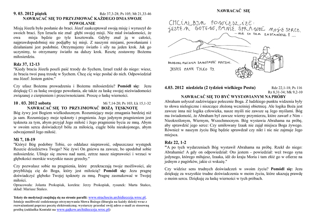 9. 03. 2012 piątek NAWRACAĆ SIĘ Rdz 37,3-28; Ps 105; Mt 21,33-46 NAWRACAĆ SIĘ TO PRZYJMOWAĆ KAŻDEGO DNIA SWOJE POWOŁANIE Misją Józefa było posłanie do braci. Józef zaakceptował swoją misję i wyruszył do swoich braci. Syn Izraela nie znał głębi swojej misji. Nie miał świadomości, że owa misja będzie go tyle kosztowała. Gdyby znał ją w całości, najprawdopodobniej nie podjąłby tej misji. Z naszymi misjami, powołaniami i działaniami jest podobnie. Otrzymujemy światło i siły na jeden krok. Jak go uczynimy, to otrzymamy światło na dalszy krok. Resztę zostawmy Bożemu miłosierdziu. Rdz 37, 12-13 "Kiedy bracia Józefa poszli paść trzody do Sychem, Izrael rzekł do niego: wiesz, że bracia twoi pasą trzodę w Sychem. Chcę cię więc posłać do nich. Odpowiedział mu Józef: Jestem gotów." Czy ufasz Bożemu prowadzeniu i Bożemu miłosierdziu? Pomódl się: Jezu dziękuję Ci za łaskę swojego powołania, ale także za łaskę swojej nieświadomości związanej z cierpieniem i przeciwnościami. Proszę o łaskę wierności. 10 . 03. 2012 sobota Mi 7,14-20; Ps 103; Łk 15,1-32 NAWRACAĆ SIĘ TO PRZYJMOWAĆ BOŻĄ TĘSKNOTĘ Bóg żywy jest Bogiem wielkodusznym. Rozumiejący moje zmagania bardziej niż ja sam. Rozumiejący moje tęsknoty i pragnienia. Jego jedynym pragnieniem jest tęsknota za tym, abym przyjął Jego miłość i Jego pragnienie bycia ze mną. Abym w swoim sercu doświadczył bólu za miłością, ciągle bólu nieukojonego, abym odwzajemnił Jego miłość. Mi 7, 18-19 "Któryż Bóg podobny Tobie, co oddalasz nieprawość, odpuszczasz występek Reszcie dziedzictwa Twego? Nie żywi On gniewu na zawsze, bo upodobał sobie miłosierdzie. Ulituje się znowu nad nami, zetrze nasze nieprawości i wrzuci w głębokości morskie wszystkie nasze grzechy." Czy pozwalasz sobie na pragnienia, które przekraczają twoje możliwości, ale przybliżają cię do Boga, który jest miłością? Pomódl się: Jezu pragnę doświadczyć głęboko Twojej tęsknoty za mną. Pragnę zasmakować w Twojej miłości. Opracowała: Jolanta Prokopiuk, korekta: Jerzy Prokopiuk, rysunek: Marta Stańco, skład: Mariusz Stańco. Teksty do medytacji znajdują się na stronie parafii: www.strachocin.archidiecezja.wroc.pl. Istnieje możliwość codziennego otrzymywania Słowa Bożego (liturgia na każdy dzień) wraz z rozważaniami poprzez pocztę elektroniczną; wystarczy przesłać swój adres e-mail ze stosowną prośbą (zakładka Kontakt na www.gajkow.archidiecezja.wroc.pl) 4.03. 2012 niedziela (2 tydzień wielkiego Postu) Rdz 22,1-18; Ps 116 Rz 8,31-34; Mk 9,2-10 NAWRACAĆ SIĘ TO BYĆ WYSTAWIANYM NA PRÓBY Abraham usłyszał zadziwiające polecenie Boga. Z ludzkiego punktu widzenia były to słowa nielogiczne i niszczące złożoną wcześniej obietnicę. Ale logika Boża jest zawsze inna niż logika człowieka, nasze myśli nie zawsze są Jego myślami. Bóg ma świadomość, że Abraham był zawsze wierny przymierzu, które zawarł z Nim Nieokreślonym, Wiernym, Wszechmocnym. Bóg wystawia Abrahama na próbę, aby sprawdzić jego serce: Czy umiłowany Izaak nie zajął miejsca Boga żywego. Również w naszym życiu Bóg będzie sprawdzał czy nikt i nic nie zajmuje Jego miejsca. Rdz 22, 1-2 "A po tych wydarzeniach Bóg wystawił Abrahama na próbę. Rzekł do niego: Abrahamie! A gdy on odpowiedział: Oto jestem - powiedział: weź twego syna jedynego, którego miłujesz, Izaaka, idź do kraju Moria i tam złóż go w ofierze na jednym z pagórków, jakie ci wskażę." Czy widzisz sens trudnych doświadczeń w swoim życiu? Pomódl się: Jezu dziękuję za wszystkie trudne doświadczenia w moim życiu, które ukazują prawdę o moim sercu. Dziękuję za łaskę wierności w tych próbach. 5.03. 2012 poniedziałek Dn 9, 4-10; Ps 79; Łk 6,36-38 NAWRACAĆ SIĘ TO UZNAĆ I WYZNAĆ SWÓJ GRZECH Nawrócenie w naszym życiu domaga się ujrzenia swojego grzechu i przyznania się do niego. Taki właśnie charakter ma sakrament pojednania. Bez uznania swojego grzechu nie możliwości nawrócenia i uzdrowienia. Grzech zawsze niszczy relacje z Bogiem, ale także niszczy nas i wszystkich tych, których kochamy. Grzech rodzi grzech, a zapłatą za grzech jest śmierć w postaci pretensji, złej atmosfery, kłamstwa, zdrady, obmowy, chorób fizycznych i psychicznych. Dn 9,5 "Zgrzeszyliśmy, zbłądziliśmy, popełniliśmy nieprawość i zbuntowaliśmy się, odstąpiliśmy od Twoich przykazań. Nie byliśmy posłuszni Twoim sługom, prorokom, którzy przemawiali w Twoim imieniu do naszych królów, do naszych przywódców, do naszych przodków o do całego narodu kraju." Czy widzisz swój grzech przystępując do sakramentu pojednania? Czy widzisz korzenie tego grzechu? Pomódl się: Dziękuję Panie za sakrament pojednania w moim życiu. Proszę Cię o łaskę widzenia swojego grzechu i jego korzeni. Proszę o łaskę nawracania się. 6. 03. 2012 wtorek Iz 1,10-20; Ps 50; Mt 23,1-12 NAWRACAĆ SIĘ TO BYĆ SZCZERYM PRZED BOGIEM Bóg nie jest zainteresowany tym, aby człowiek był Jego niewolnikiem. Bóg pragnie jego serca i jego miłości. Pozwala człowiekowi toczyć spór, zwyczajnie się z Nim wykłócać po to, aby człowiek kochał Go z całego serca, myśli i z całej woli. Dla Boga ważne jest szczere serce. Dla Boga ważne są pragnienia i tęsknoty człowieka. Iz 1, 18 "Chodźcie i spór ze Mną wiedzcie! - mówi Pan. Choćby wasze grzechy były jak szkarłat, jak śnieg wybieleją; choćby czerwone jak purpura, staną się jak wełna." Czy jesteś szczery przed Bogiem? Czy potrafisz z Bogiem toczyć spór? Pomódl się: Jezu dziękuję, że ważne jest dla Ciebie to, co myślę, czego pragnę i za czym tęsknię. Dziękuję, że mam możliwość toczenia z Tobą sporu. Dziękuję, że jesteś całkowicie dla Mnie. 7. 03. 2012 środa Jr 18,18-20; Ps 31; Mt 20,17-28 NAWRACAĆ SIĘ TO DOŚWIADCZAĆ PRZECIWNOŚCI Tym, kto nie jest zainteresowany naszym nawróceniem, je
