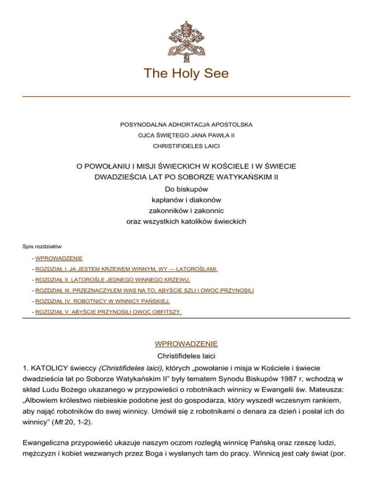 The Holy See POSYNODALNA ADHORTACJA APOSTOLSKA OJCA ŚWIĘTEGO JANA PAWŁA II CHRISTIFIDELES LAICI O POWOŁANIU I MISJI ŚWIECKICH W KOŚCIELE I W ŚWIECIE DWADZIEŚCIA LAT PO SOBORZE WATYKAŃSKIM II Do biskupów kapłanów i diakonów zakonników i zakonnic oraz wszystkich katolików świeckich Spis rozdziałów - WPROWADZENIE - ROZDZIAŁ I. JA JESTEM KRZEWEM WINNYM, WY — LATOROŚLAMI. - ROZDZIAŁ II. LATOROŚLE JEDNEGO WINNEGO KRZEWU. - ROZDZIAŁ III. PRZEZNACZYŁEM WAS NA TO, ABYŚCIE SZLI I OWOC PRZYNOSILI - ROZDZIAŁ IV. ROBOTNICY W WINNICY PAŃSKIEJ. - ROZDZIAŁ V. ABYŚCIE PRZYNOSILI OWOC OBFITSZY. WPROWADZENIE Christifideles laici 1. KATOLICY świeccy (Christifideles laici), których „powołanie i misja w Kościele i świecie dwadzieścia lat po Soborze Watykańskim II” były tematem Synodu Biskupów 1987 r, wchodzą w skład Ludu Bożego ukazanego w przypowieści o robotnikach winnicy w Ewangelii św. Mateusza: „Albowiem królestwo niebieskie podobne jest do gospodarza, który wyszedł wczesnym rankiem, aby nająć robotników do swej winnicy. Umówił się z robotnikami o denara za dzień i posłał ich do winnicy” (Mt 20, 1-2). Ewangeliczna przypowieść ukazuje naszym oczom rozległą winnicę Pańską oraz rzeszę ludzi, mężczyzn i kobiet wezwanych przez Boga i wysłanych tam do pracy. Winnicą jest cały świat (por. 2 Mt 13, 38), który winien zostać przemieniony zgodnie z Bożym planem w perspektywie ostatecznego przyjścia Królestwa Bożego. IDŹCIE I WY DO MOJEJ WINNICY 2. „Gdy wyszedł około godziny trzeciej, zobaczył innych, stojących na rynku bezczynnie, i rzekł do nich: «Idźcie i wy do mojej winnicy»” (Mt 20, 3-4). „Idźcie i wy do mojej winnicy” — od owego dnia to wezwanie Pana Jezusa nie przestaje rozbrzmiewać w dziejach: skierowane jest do każdego człowieka, który przychodzi na świat. W naszych czasach, które wraz z Soborem Watykańskim II otrzymały nowe tchnienie Ducha Pięćdziesiątnicy, Kościół osiągnął bardziej żywą świadomość swojej misyjnej natury i raz jeszcze wsłuchał się w głos Pana, który posyła go na świat jako „powszechny sakrament zbawienia”1. Idźcie i wy. To wezwanie dotyczy nie tylko biskupów, kapłanów, zakonników i zakonnic, ale wszystkich, także świeckich, których Bóg wzywa osobiście, powierzając im do spełnienia misję w Kościele i w świecie. Św. Grzegorz Wielki przypomina o tym w kazaniu komentującym przypowieść o robotnikach winnicy: „Popatrzcie, najmilsi bracia, jak żyjecie, i sprawdźcie, czy już jesteście robotnikami Pana. Niech każdy oceni to, co czyni i osądzi, czy pracuje w winnicy Pańskiej”2. Szczególnie wspaniałe wypowiedzi na temat natury, godności, duchowości, misji i odpowiedzialności świeckich zawierają się w przebogatej spuściźnie doktrynalnej, duchowej i pasterskiej Soboru. Ojcowie soborowi, podejmując apel Chrystusa, wezwali wszystkich świeckich, mężczyzn i kobiety, do pracy w Jego winnicy: „Święty Sobór wzywa więc usilnie w imię Pana wszystkich świeckich, by chętnie, wielkodusznie i skwapliwie odpowiedzieli na wołanie Chrystusa, który w tej godzinie natarczywiej ich zaprasza, i na natchnienie Ducha Świętego. Młodzi niech uważają to wezwanie za skierowane szczególnie do siebie i niech je przyjmą z zapałem i wielkodusznie. Sam bowiem Pan przez ten Sobór święty zaprasza ponownie wszystkich świeckich, by z każdym dniem coraz ściślej się z Nim jednoczyli, a uważając Jego sprawę za swoją własną (por. Flp 2, 5), zespalali się w Jego zbawczym posłannictwie; wysyła On ich znowu do każdego miasta i miejscowości, dokąd sam ma przyjść (por. Łk 10, 1)”3. Idźcie i wy do mojej winnicy. Te słowa odezwały się raz jeszcze duchowym echem podczas Synodu Biskupów, który odbywał się w Rzymie od 1 do 30 października 1987 roku. Idąc drogą wytyczoną przez Sobór Ojcowie Synodu, otwarci na światło doświadczeń osobistych i wspólnotowych całego Kościoła oraz ubogaceni przez Synody poprzednie, podjęli szczegółową i szeroko zakrojoną refleksję nad powołaniem i misją świeckich w Kościele i świecie dwadzieścia lat po Soborze Watykańskim II. Wśród uczestników Synodu nie zabrakło kompetentnych przedstawicieli laikatu, mężczyzn i 3 kobiet, którzy wnieśli swój cenny wkład w jego prace, co zostało oficjalnie uznane w homilii wygłoszonej na zakończenie obrad: „Dziękujemy za to, że w czasie Synodu mogliśmy nie tylko cieszyć się obecnością świeckich (auditores i auditrices), ale także słuchać w czasie synodalnej dyskusji zaproszonych przedstawicieli laikatu, pochodzących ze wszystkich stron świata, z różnych krajów. Pozwoliło nam to skorzystać z ich doświadczeń, ich rad oraz sugestii zrodzonych z umiłowania wspólnej sprawy”4. Spoglądając na okres posoborowy Ojcowie synodalni mogli stwierdzić, że Duch Święty nieprzerwanie odnawiał młodość Kościoła, budząc w wielu świeckich nowe energie świętości i uczestnictwa. Świadczą o tym między innymi: nowy styl współpracy między kapłanami, zakonnikami i świeckimi, czynny udział świeckich w liturgii, w głoszeniu Słowa Bożego i w katechezie, powierzanie świeckim wielorakich posług oraz zadań, bujny rozkwit grup, zrzeszeń, ruchów duchowości i zaangażowania świeckich, szerszy i bardziej znaczący udział kobiet w życiu Kościoła i w rozwoju społeczeństwa. Równocześnie Synod podkreślił trudności i niebezpieczeństwa, których nie brakło na posoborowej drodze laikatu. Wypada tu przypomnieć przede wszystkim dwie pokusy, którym świeccy nie zawsze umieli stawić czoła: pokusa tak wielkiego angażowania się w posługi i zadania kościelne, że prowadziło to często do zaniedbywania w praktyce specyficznych powinności na polu zawodowym, społecznym, gospodarczym, kulturalnym i politycznym, oraz pokusa usprawiedliwiania niedopuszczalnego oddzielania wiary od życia, przyj