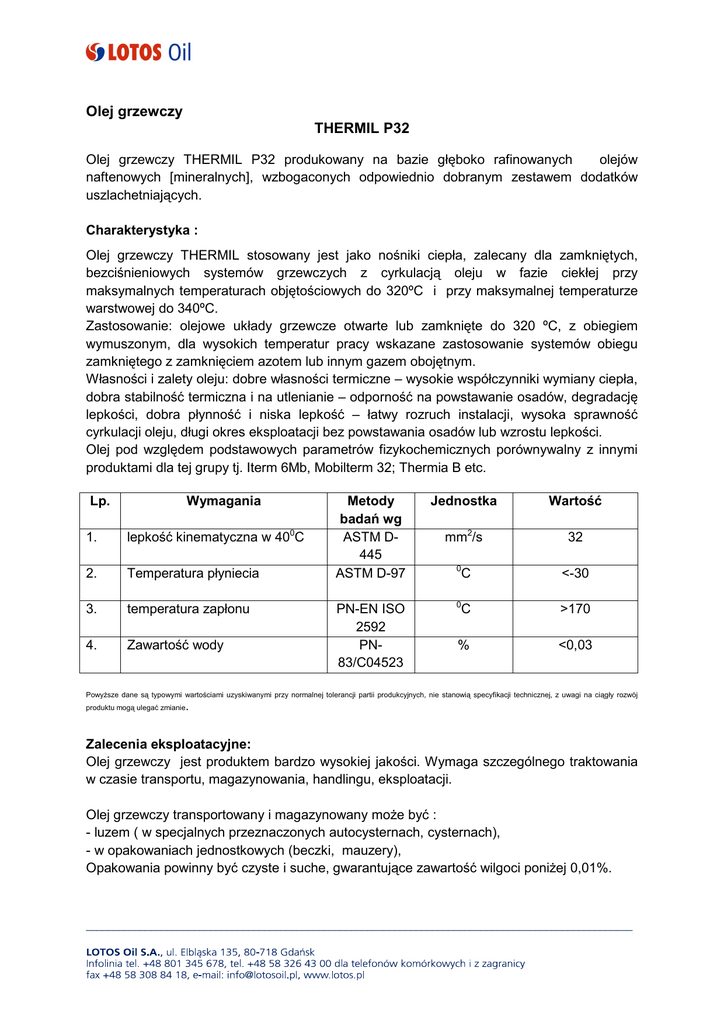Olej grzewczy THERMIL P32 Olej grzewczy THERMIL P32 produkowany na bazie głęboko rafinowanych olejów naftenowych [mineralnych], wzbogaconych odpowiednio dobranym zestawem dodatków uszlachetniających. Charakterystyka : Olej grzewczy THERMIL stosowany jest jako nośniki ciepła, zalecany dla zamkniętych, bezciśnieniowych systemów grzewczych z cyrkulacją oleju w fazie ciekłej przy maksymalnych temperaturach objętościowych do 320ºC i przy maksymalnej temperaturze warstwowej do 340ºC. Zastosowanie: olejowe układy grzewcze otwarte lub zamknięte do 320 ºC, z obiegiem wymuszonym, dla wysokich temperatur pracy wskazane zastosowanie systemów obiegu zamkniętego z zamknięciem azotem lub innym gazem obojętnym. Własności i zalety oleju: dobre własności termiczne – wysokie współczynniki wymiany ciepła, dobra stabilność termiczna i na utlenianie – odporność na powstawanie osadów, degradację lepkości, dobra płynność i niska lepkość – łatwy rozruch instalacji, wysoka sprawność cyrkulacji oleju, długi okres eksploatacji bez powstawania osadów lub wzrostu lepkości. Olej pod względem podstawowych parametrów fizykochemicznych porównywalny z innymi produktami dla tej grupy tj. Iterm 6Mb, Mobilterm 32; Thermia B etc. Lp. Wymagania 1. lepkość kinematyczna w 400C 2. Temperatura płyniecia 3. temperatura zapłonu 4. Zawartość wody Metody badań wg ASTM D445 ASTM D-97 PN-EN ISO 2592 PN83/C04523 Jednostka Wartość mm2/s 32 0 <-30 0 C >170 % <0,03 C Powyższe dane są typowymi wartościami uzyskiwanymi przy normalnej tolerancji partii produkcyjnych, nie stanowią specyfikacji technicznej, z uwagi na ciągły rozwój produktu mogą ulegać zmianie . Zalecenia eksploatacyjne: Olej grzewczy jest produktem bardzo wysokiej jakości. Wymaga szczególnego traktowania w czasie transportu, magazynowania, handlingu, eksploatacji. Olej grzewczy transportowany i magazynowany może być : - luzem ( w specjalnych przeznaczonych autocysternach, cysternach), - w opakowaniach jednostkowych (beczki, mauzery), Opakowania powinny być czyste i suche, gwarantujące zawartość wilgoci poniżej 0,01%. _____________________________________________________________________________________________________ Olej w opakowaniach należy magazynować w suchych zadaszonych pomieszczeniach. Zbiorniki magazynowe powinny zawierać absorbery wilgoci na zamknięciu oddechu zbiornika. Nie zaleca się do transportu i magazynowania oleju grzewczego stosowania opakowań, w których poprzednio były magazynowane lub przewożone inne oleje. Manipulacje olejem grzewczym czyli napełnianie układów, dolewki, wykonywać należy zgodnie z wytycznymi energetycznymi jak i procedurami zalecanymi przez producenta, projektanta, wykonawcę układów grzewczych. Oleju do układów wymiany ciepła nie należy mieszać z innymi olejami ponieważ mogą ulec zmianie ich własności. Utrudni to również interpretację analiz parametrów oleju przeprowadzanych w ramach ich monitoringu. Dla prawidłowej eksploatacji olejów grzewczych zaleca się co 6 miesięcy badanie zmian jakości oleju podczas pracy. W ramach pomiarów sugeruje się wykonywanie takich analiz jak: lepkość, temperatura zapłonu w tyglu zamkniętym i otwartym, liczba kwasowa, koks Conradsona, zawartość osadów. Napełnianie układów wymiany ciepła olejem grzewczym: - układy grzewcze należy napełniać wyłącznie po przeprowadzeniu próby ciśnieniowej szczelności układu, - do pomiarów szczelności układów przed napełnieniem oleju zabrania się stosowania wody, - układy grzewcze przed napełnieniem powinny być przepłukane olejem grzewczym, - napełnienia układów należy dokonywać do objętości nie więcej niż 40% komory rozprężeniowej układu ( tzw. zbiornik wyrównawczy), - w trakcie napełnienia należy odpowietrzać układ wymiany ciepła gdyż powietrze musi być całkowicie usunięte z oleju zanim osiągnie on temperaturę pracy, - ogrzewanie oleju do stanu parametrów podstawowych ruchowych prowadzić etapowo: - do 110°C ogrzewając bardzo wolno układ, - wygrzewać olej przez kilka godzin w temperaturze do 120°C dla odparowania wilgoci i powietrza zaabsorbowanych podczas pełnienia olejem układu grzewczego. - ogrzewanie oleju do temperatury roboczej układu prowadzić stopniowo z kontrolą objętości układu według wytycznych projektanta. *W czasie eksploatacji oleju, w układach cyrkulacyjnych powinien być utrzymywany przepływ turbulentny i różnica temperatur pomiędzy objętością oleju a filmem olejowym otaczającym element grzewczy nie powinna być wyższa niż 15-30°C. Z uwagi na rozszerzalność cieplną olejów mineralnych, przy podgrzewaniu system cyrkulacji oleju powinien zawierać zbiornik wyrównawczy kompensujący zmiany objętości oleju. Jest to jedyne miejsce kontaktu oleju z atmosferą. Pomimo bardzo dobrej odporności na utlenianie, w przypadku temperatury oleju w zbiorniku kompensacyjnym przekraczającej 50ºC, należy podjąć działania minimalizujące kontakt oleju z powietrzem. W tym celu można użyć np: zamknięcia pływającego bądź oddzielić powierzchnię oleju od atmosfery za pomocą zamknięcia gazem obojętnym. Oleje grzewcze jako nośniki ciepła powinny być używane tylko w układach z obiegiem wymuszonym. Układy wykorzystujące tylko konwekcje ciepła nie zapewniają wystarczająco szybkich przepływów dla zapobiegania miejscowego przegrzania i rozkładu oleju. _____________________________________________________________________________________________________ Specyfikacje, klasyfikacje: ISO VG 32 Opakowanie: 180kg Składowanie: Wszelkie opakowania powinny być przechowywane w zadaszonych pomieszczeniach. Jeżeli beczki przechowuje się na otwartej przestrzeni, gdzie mogą być narażone na czynniki atmosferyczne - opady, należy je ustawić w pozycji poziomej, tak aby uniemożliwić dostęp wody oraz zapobiec zniszczeniu oznakowania, najwłaściwiej przykryć brezent
