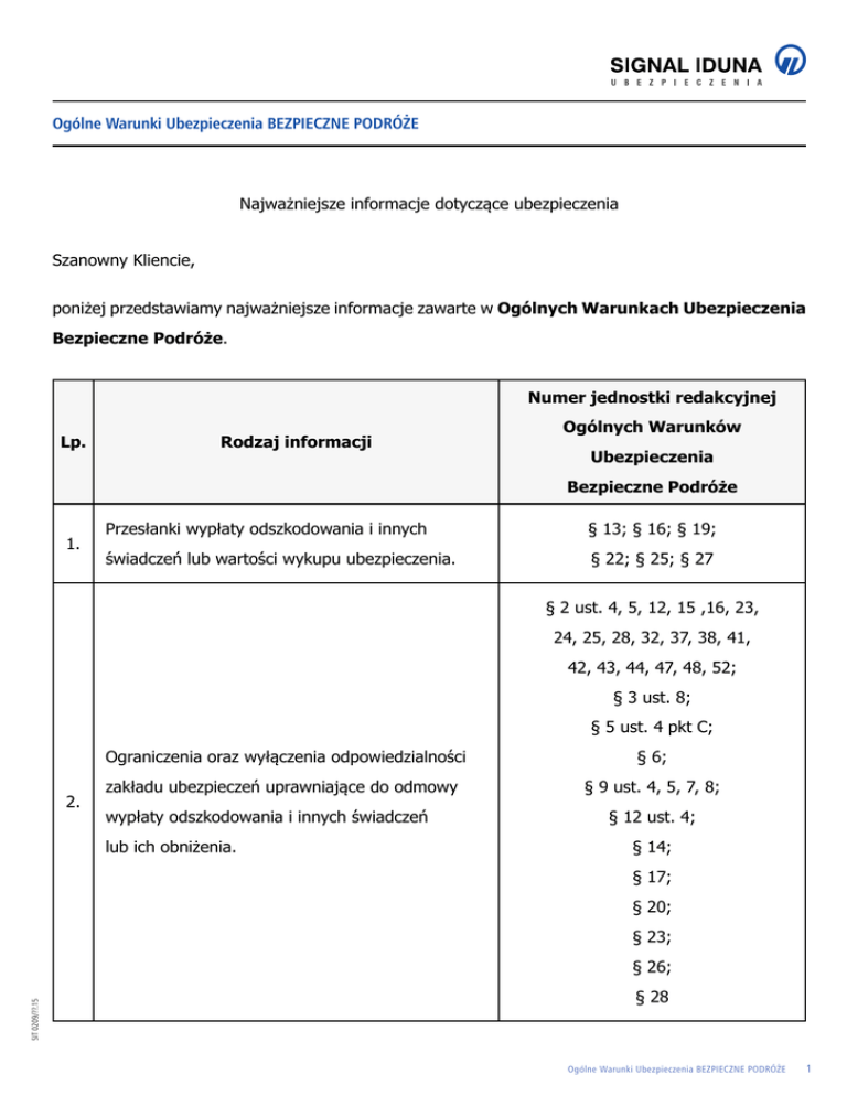 Ogólne Warunki Ubezpieczenia BEZPIECZNE PODRÓŻE Najważniejsze informacje dotyczące ubezpieczenia Szanowny Kliencie, poniżej przedstawiamy najważniejsze informacje zawarte w Ogólnych Warunkach Ubezpieczenia Bezpieczne Podróże. Numer jednostki redakcyjnej Lp. Rodzaj informacji Ogólnych Warunków Ubezpieczenia Bezpieczne Podróże 1. Przesłanki wypłaty odszkodowania i innych § 13; § 16; § 19; świadczeń lub wartości wykupu ubezpieczenia. § 22; § 25; § 27 § 2 ust. 4, 5, 12, 15 ,16, 23, 24, 25, 28, 32, 37, 38, 41, 42, 43, 44, 47, 48, 52; § 3 ust. 8; § 5 ust. 4 pkt C; 2. Ograniczenia oraz wyłączenia odpowiedzialności § 6; zakładu ubezpieczeń uprawniające do odmowy § 9 ust. 4, 5, 7, 8; wypłaty odszkodowania i innych świadczeń lub ich obniżenia. § 12 ust. 4; § 14; § 17; § 20; § 23; SIT 0209/??.15 § 26; § 28 Ogólne Warunki Ubezpieczenia BEZPIECZNE PODRÓŻE 1 Spis treści I. POSTANOWIENIA WSPÓLNE § 1. POSTANOWIENIA OGÓLNE § 2. DEFINICJE § 3. ZAWARCIE UMOWY UBEZPIECZENIA § 4. OKRES UBEZPIECZENIA/ OKRES ODPOWIEDZIALNOŚCI § 5. ODSTĄPIENIE I ROZWIĄZANIE UMOWY UBEZPIECZENIA § 6. SUMA UBEZPIECZENIA/SUMA GWARANCYJNA § 7. SKŁADKA UBEZPIECZENIOWA § 8. POSTĘPOWANIE W RAZIE POWSTANIA SZKODY POSTANOWIENIA OGÓLNE § 9. USTALENIE I WYPŁATA ŚWIADCZENIA/ ODSZKODOWANIA DLA UBEZPIECZENIA KOSZTÓW LECZENIA, NASTĘPSTW NIESZCZĘŚLIWYCH WYPADKÓW, ODPOWIEDZIALNOŚCI CYWILNEJ, BAGAŻU PODRÓŻNEGO, SPRZĘTU SPORTOWEGO § 10. TERMIN WYPŁATY ŚWIADCZENIA § 11. SPOSÓB ROZPATRYWANIA REKLAMACJI, SĄD WŁAŚCIWY DO ROZSTRZYGANIA SPORÓW § 12. ROSZCZENIA REGRESOWE II. UBEZPIECZENIE KOSZTÓW LECZENIA I ASSISTANCE § 13. PRZEDMIOT UBEZPIECZENIA, ZAKRES STANDARD ZAKRES SUPER § 14. OGRANICZENIA ODPOWIEDZIALNOŚCI § 15. POSTĘPOWANIE W RAZIE NAGŁEGO ZACHOROWANIA LUB NIESZCZĘŚLIWEGO WYPADKU 2 2 4 5 5 5 7 7 8 9 9 9 9 11 12 § 1. POSTANOWIENIA OGÓLNE 1.Na podstawie niniejszych Ogólnych Warunków Ubezpieczenia, zwanych dalej OWU, SIGNAL IDUNA Polska Towarzystwo Ubezpieczeń Spółka Akcyjna, zwane dalej SIGNAL IDUNA, zawiera z Ubezpieczającym umowy ubezpieczenia na zasadach opisanych w niniejszych OWU. 2.Na podstawie niniejszych OWU, SIGNAL IDUNA zawiera umowy ubezpieczenia w zakresie: a)kosztów leczenia (w tym ratownictwa) i assistance, b)następstw nieszczęśliwych wypadków, c)pomocy i ochrony prawnej, d)bagażu podróżnego, e)odpowiedzialności cywilnej, f)sprzętu sportowego. Umowa ubezpieczenia musi zawierać obowiązkowo ubezpieczenie kosztów leczenia i assistance, ubezpieczenie następstw nieszczęśliwych wypadków oraz ubezpieczenie pomocy i ochrony prawnej. Dodatkowo Ubezpieczający może wykupić dowolne ubezpieczenia z pkt d) – f), z zastrzeżeniem, iż możliwość zawarcia ubezpieczenia sprzętu sportowego istnieje, jeśli zostało wybrane ubezpieczenie bagażu podróżnego. 3.Na życzenie Ubezpieczającego, po opłaceniu dodatkowej składki, zakres umowy ubezpieczenia może zostać rozszerzony: a)w zakresie ubezpieczenia kosztów leczenia (w tym ratownictwa) i assistance o ryzyka związane z: 1)wykonywaniem pracy fizycznej za granicą (kod WA), 2)następstwem chorób przewlekłych i nowotworowych (kod CP), 3)uprawianiem sportów zimowych (kod SZ), 4)uprawianiem sportów wysokiego ryzyka (kod HR), 5)wyczynowym uprawianiem sportów (kod SP), 6)uprawianiem sportów ekstremalnych (kod SM), b)w zakresie ubezpieczenia następstw nieszczęśliwych wypadków o ryzyka związane z: 1)wykonywaniem pracy fizycznej za granicą (kod WA), 2) uprawianiem sportów zimowych (kod SZ), 3)uprawianiem sportów wysokiego ryzyka (kod HR), 4)wyczynowym uprawianiem sportów (kod SP), 5)uprawianiem sportów ekstremalnych (kod SM), c)w zakresie ubezpieczenia sprzętu sportowego oraz ubezpieczenia odpowiedzialności cywilnej o ryzyka związane z uprawianiem sportów zimowych (kod SZ). Ogólne Warunki Ubezpieczenia BEZPIECZNE PODRÓŻE 13 14 14 14 15 15 15 16 16 16 17 17 17 18 18 13 I. POSTANOWIENIA WSPÓLNE 2 III. UBEZPIECZENIE NASTĘPSTW NIESZCZĘŚLIWYCH WYPADKÓW § 16. PRZEDMIOT UBEZPIECZENIA § 17. OGRANICZENIA ODPOWIEDZIALNOSCI § 18. POSTĘPOWANIE W RAZIE NAGŁEGO ZACHOROWANIA LUB NIESZCZĘŚLIWEGO WYPADKU IV. UBEZPIECZENIE BAGAŻU PODRÓŻNEGO § 19. PRZEDMIOT UBEZPIECZENIA § 20. OGRANICZENIA ODPOWIEDZIALNOSCI § 21. POSTĘPOWANIE W PRZYPADKU POWSTANIA SZKODY BAGAŻOWEJ V. UBEZPIECZENIE SPRZĘTU SPORTOWEGO § 22. PRZEDMIOT UBEZPIECZENIA § 23. OGRANICZENIA ODPOWIEDZIALNOSCI § 24. POSTĘPOWANIE W PRZYPADKU POWSTANIA SZKODY W SPRZĘCIE SPORTOWYM VI. UBEZPIECZENIE POMOCY I OCHRONY PRAWNEJ § 25. PRZEDMIOT UBEZPIECZENIA § 26. OGRANICZENIA ODPOWIEDZIALNOŚCI VII. UBEZPIECZENIE ODPOWIEDZIALNOŚCI CYWILNEJ § 27. PRZEDMIOT UBEZPIECZENIA § 28. OGRANICZENIA ODPOWIEDZIALNOŚCI § 29. POSTĘPOWANIE W RAZIE ZAISTNIENIA SZKODY Z UBEZPIECZENIA ODPOWIEDZIALNOŚCI CYWILNEJ VIII. POSTANOWIENIA KOŃCOWE 4.Objęcie ochroną ubezpieczeniową ryzyka uprawiania sportów ekstremalnych powoduje objęcie ochroną ubezpieczeniową również uprawianie sportów zimowych, uprawianie sportów wysokiego ryzyka oraz wyczynowe uprawianie sportu, bez konieczności opłacenia dodatkowej składki, a w przypadku łączenia dodatkowych ryzyk sportowych najwyższa zwyżka składki obejmuje wszystkie ryzyka sportowe objęte niższą zwyżką. 5.Ochroną ubezpieczeniową bez konieczności rozszerzania umowy ubezpieczenia jest objęte amatorskie uprawianie sportu. 6.Ubezpieczenie może zostać zawarte w dwóch wariantach – TRAVEL lub BUSINESS. 7.Ubezpieczenie kosztów leczenia i assistance w wariancie TRAVEL może zostać zawarte w zakresie standard lub super, natomiast wariant BUSINESS zawiera ubezpieczenie kosztów leczenia i assistance tylko w zakresie super. 8.Wariant BUSINESS różni się od wariantu TRAVEL: a)rozszerzonym pakietem assistance, b)długością okresu, na jaki może zostać zawarte ubezpieczenie (tylko 6 lub 12 miesięczne okresy), c)możliwością zawarcia ubezpieczenia w w