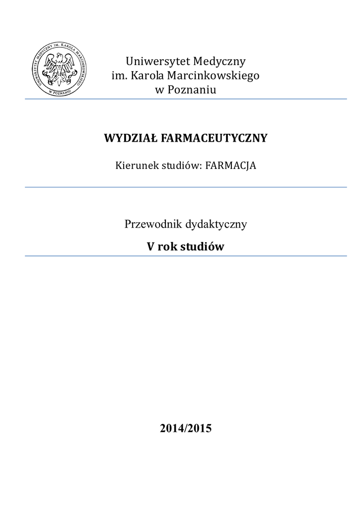 Uniwersytet Medyczny im. Karola Marcinkowskiego w Poznaniu WYDZIAŁ FARMACEUTYCZNY Kierunek studiów: FARMACJA Przewodnik dydaktyczny V rok studiów 2014/2015 Program kształcenia studentów kierunku farmacja zgodnie z art. 9b ust. 1 ustawy z dnia 27 lipca 2005r. - Prawo o szkolnictwie wyższym (Dz. U. z 2012r. poz. 572) oraz Rozporządzeniem Ministra Nauki i Szkolnictwa Wyższego z dnia 9 maja 2012 r. w sprawie standardów kształcenia dla kierunków studiów: lekarskiego, lekarsko-dentystycznego, farmacji, pielęgniarstwa i położnictwa (Dz. U. 2012, poz. 631) przewiduje realizację przedmiotów podstawowych w zakresach: 1. Biomedyczne i humanistyczne podstawy farmacji 2. Fizykochemiczne podstawy farmacji oraz przedmiotów kierunkowych w zakresach: 1. Analiza, synteza i technologia leków 2. Biofarmacja i skutki działania leków 3. Praktyka farmaceutyczna 4. Metodologia badań naukowych Przewodnik dydaktyczny, przygotowany na podstawie sylabusów, zawiera: 1. Wykaz nauczanych przedmiotów z ich podziałem na przedmioty obowiązkowe i fakultatywne, z uwzględnieniem formy zajęć, liczby godzin oraz punktów ECTS dla każdego z nich, a także osoby odpowiedzialnej za przedmiot 2. Warunki wstępne niezbędne do realizacji przedmiotu 3. Cele kształcenia dla każdego przedmiotu 4. Formę i warunki zaliczenia 5. Literaturę podstawową i uzupełniającą 6. Organizację i program zajęć 7. Czas trwania oraz rodzaj praktyk z przypisaną im punktacją ECTS Szczegółowe regulaminy i warunki zaliczenia poszczególnych przedmiotów są dostępne w jednostkach realizujących dane zajęcia. 2 SPIS TREŚCI Wykaz przedmiotów obowiązkowych ........................................................................................... 5 Wykaz przedmiotów fakultatywnych............................................................................................. 7 Przedmioty obowiązkowe................................................................................................................... 10 Biofarmacja................................................................................................................................................................. 11 Etyka ogólna ............................................................................................................................................................... 12 Etyka zawodowa....................................................................................................................................................... 14 Farmacja praktyczna w aptece ........................................................................................................................... 15 Farmakoekonomika ................................................................................................................................................ 17 Higiena i epidemiologia ......................................................................................................................................... 19 Opieka farmaceutyczna ......................................................................................................................................... 21 Prawo farmaceutyczne .......................................................................................................................................... 24 Propedeutyka onkologii dla farmaceutów .................................................................................................... 26 Technologia postaci leku III ................................................................................................................................. 28 Ćwiczenia specjalistyczne i metodologia badań.......................................................................................... 30 Praktyka zawodowa w aptece ............................................................................................................................ 31 Przedmioty fakultatywne .................................................................................................................... 33 Aktywność ruchowa promocją zdrowia ......................................................................................................... 34 Analiza błędów lekowych – współpraca lekarz i farmaceuta................................................................ 37 Apteka szpitalna w strukturze zakładu opieki zdrowotnej .................................................................... 38 Badania kliniczne ..................................................................................................................................................... 39 Biostatystyka – metody zaawansowane ......................................................................................................... 40 Farmakoterapia geriatryczna – analiza przypadków ............................................................................... 41 Komunikacja z pacjentem i sytuacje trudne w praktyce aptecznej..................................................... 42 Kosmetyka naturalna ............................................................................................................................................. 43 Leki stosowane w chorobach rzadkich – leki sieroce ............................................................................... 44 Łatwiej być mężczyzną czy kobietą? Andropauza i menopauza. ......................................................... 45 Marketing w aptece ................................................................................................................................................. 47 Monitorowanie działań niepożądanych wg przepisów Unii Europejskiej ....................................... 49 Ocena trwałości substancji leczniczych i preparatów farmaceutycznych ....................................... 51 Opieka nad pacjentem onkologicznym ......................................................