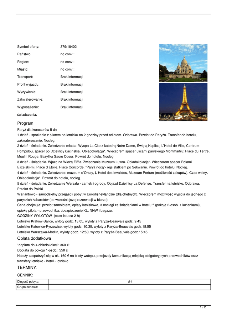 Symbol oferty: 379/18402 Państwo: no conv : Region: no conv : Miasto: no conv : Transport: Brak informacji Profil wyjazdu: Brak informacji Wyżywienie: Brak informacji Zakwaterowanie: Brak informacji Wyposażenie: Brak informacji świadczenia: Program Paryż dla koneserów 5 dni 1 dzień - spotkanie z pilotem na lotnisku na 2 godziny przed odlotem. Odprawa. Przelot do Paryża. Transfer do hotelu, zakwaterowanie. Nocleg. 2 dzień - śniadanie. Zwiedzanie miasta: Wyspa La Cite z katedrą Notre Dame, Świętą Kaplicą, L’Hotel de Ville, Centrum Pompidou, spacer po Dzielnicy Łacińskiej. Obiadokolacja*. Wieczorem spacer ulicami paryskiego Montmartru: Place du Tertre, Moulin Rouge, Bazylika Sacre Coeur. Powrót do hotelu. Nocleg. 3 dzień - śniadanie. Wjazd na Wieżę Eiffla. Zwiedzanie Muzeum Luwru. Obiadokolacja*. Wieczorem spacer Polami Elizejski-mi, Place d Etoile, Place Concorde. ”Paryż nocą”- rejs statkiem po Sekwanie. Powrót do hotelu. Nocleg. 4 dzień - śniadanie. Zwiedzanie: muzeum d’Orsay, L Hotel des Invalides, Muzeum Perfum (możliwość zakupów). Czas wolny. Obiadokolacja*. Powrót do hotelu, nocleg. 5 dzień - śniadanie. Zwiedzanie Wersalu - zamek i ogrody. Objazd Dzielnicy La Defense. Transfer na lotnisko. Odprawa. Przelot do Polski. Wariantowo - samodzielny przejazd i pobyt w Eurodisneylandzie (dla chętnych). Wieczorem możliwość wyjścia do jednego z paryskich kabaretów (po wcześniejszej rezerwacji w biurze). Cena obejmuje: przelot samolotem, opłaty lotniskowe, 3 noclegi ze śniadaniami w hotelu** (pokoje 2-osob. z łazienkami), opiekę pilota - przewodnika, ubezpieczenie KL, NNW i bagażu. GODZINY WYLOTÓW (czas lotu ca 2 h) Lotnisko Kraków-Balice, wyloty godz. 13:05, wyloty z Paryża-Beauvais godz. 9:45 Lotnisko Katowice-Pyrzowice, wyloty godz. 10:30, wyloty z Paryża-Beauvais godz.18:55 Lotnisko Warszawa-Modlin, wyloty godz. 12:50, wyloty z Paryża-Beauvais godz.15:45 Opłata dodatkowa *dopłata do 4 obiadokolacji: 360 zł Dopłata do pokoju 1-osob.: 550 zł Należy zaopatrzyć się w ok. 160 € na bilety wstępu, przejazdy komunikacją miejską obligatoryjnych przewodników oraz transfery lotnisko - hotel - lotnisko. TERMINY: CENNIK: Długość pobytu: dni Grupa cenowa: 1/2 Waluta: PLN Aktualne ceny z systemu S.A.R.T. (-) - cena usługi, podatku kalkulowana przy osobie lub gratis (*) - kwota wliczona w cenę standardową 2/2