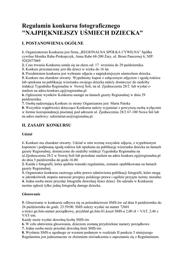 Regulamin konkursu fotograficznego "NAJPIĘKNIEJSZY UŚMIECH DZIECKA” I. POSTANOWIENIA OGÓLNE 1. Organizatorem Konkursu jest firma „REGIONALNA SPÓŁKA CYWILNA” Spółka cywilna Monika Rabe-Prokopczyk, Anna Rabe 68-200 Żary, ul. Broni Pancernej 6, NIP: 9282077069 2. Czas trwania Konkursu ustala się na okres od: 17 września do 29 października. 3. Konkurs przeznaczony jest dla dzieci w wieku do 16 lat. 4. Przedmiotem konkursu jest wybranie zdjęcia z najpiękniejszym uśmiechem dziecka. 5. Konkurs ma charakter otwarty. Wypełniony kupon z załączonym zdjęciem i zgodą rodzica lub opiekuna na publikację wizerunku swojego dziecka należy dostarczyć do siedziby redakcji Tygodnika Regionalna w Nowej Soli, na ul. Zjednoczenia 28/2 lub wysłać emailem na adres:[email protected] 6. Ogłoszenie wyników Konkursu nastąpi na łamach gazety Regionalnej w dniu 29 października. 7. Osobą nadzorującą Konkurs ze strony Organizatora jest: Marta Patoka 8. Wszystkie wątpliwości dotyczące Konkursu należy wyjaśniać z powyższą osobą wyłącznie w formie korespondencji pisemnej pod adresem ul. Zjednoczenia 28/2 67-100 Nowa Sól lub na adres mailowy: [email protected]. II. ZASADY KONKURSU Udział 1. Konkurs ma charakter otwarty. Udział w nim wezmą wszystkie zdjęcia, z wypełnionym kuponem i podpisaną zgodą rodzica lub opiekuna na publikację wizerunku dziecka na łamach gazety Regionalnej, dostarczone do siedziby redakcji Tygodnika Regionalna na ul.Zjednoczenia 28/2 w Nowej Soli lub przesłane mailem na adres [email protected] do dnia 5 października do godz.16.00. 2. Każda z fotografii, która spełnia warunki regulaminu, zostanie opublikowana na łamach gazety Regionalnej. 3. Organizator konkursu zastrzega sobie prawo odmówienia publikacji fotografii, które mogą w jakimkolwiek stopniu naruszać przepisy polskiego prawa i ogólnie przyjęte normy moralne. 4. Jedna osoba może przysłać fotografie dowolnej ilości dzieci. Do udziału w Konkursie można zgłosić tylko jedną fotografię danego dziecka. Głosowanie 5. Głosowanie w konkursie odbywa się za pośrednictwem SMS-ów od dnia 8 października do 26 października do godz. 23:59:00. SMS należy wysłać na numer 72601 o treści gn.foto.numer porządkowy, przykład gn.foto.01,koszt SMS-a 2,00 zł + VAT, 2,46 z VAT-em. Każdy może wysłać dowolną liczbę SMS-ów 6. W celu ułatwienia głosowania, dzieciom zostaną przydzielone numery porządkowe. 7. Jedna osoba może przesłać dowolną ilość SMS-ów. 8. Wysłanie SMS-a zgodnego ze wzorem podanym w rozdziale II punkcie 5 niniejszego Regulaminu jest jednoznaczne ze złożeniem oświadczenia o zapoznaniu się z Regulaminem. 9. W przypadku jakichkolwiek odstępstw od podanego w punkcie 5 wzoru SMS, nie zostaje on uwzględniany. 10. Organizator nie ponosi odpowiedzialności w przypadku, gdy treść SMS-a jest wadliwa z przyczyn nie leżących po stronie Organizatora. 11. Organizator nie ponosi odpowiedzialności za SMS-y, które nie dotrą do organizatora z przyczyn nie leżących po jego stronie. Nagradzanie i nagrody 12. W konkursie fotograficznym "NAJPIĘKNIEJSZY USMIECH DZIECKA” nagrodzone zostaną te zgłoszenia, które otrzymają największą ilość głosów oddanych w głosowaniu SMS. 13. NAGRODY: I miejsce – Bon o wartości 300 zł do wykorzystania w salonie jubilreskim Saies oraz kosz słodyczy II miejsce – Bon o wartości 200 zł do wykorzystania w salonie jubilerskim Saies III miejsce – Bon o wartości 100 zł do wykorzystania w salonie jubilerskim Saies III. WARUNKI UCZESTNICTWA 1. Uczestnik Konkursu wyraża zgodę na publikację imienia, nazwiska, miejscowości oraz wieku dziecka zgłoszonego do konkursu na łamach gazety Regionalnej. 2. Rodzic lub opiekun dziecka poprzez przesłanie zdjęcia wyrażają zgodę na nieodpłatne zamieszczenie przesłanego zdjęcia/ć: na łamach gazety Regionalnej. IV. POSTANOWIENIA KOŃCOWE 1. Regulamin niniejszy jest jedynym dokumentem określającym zasady Konkursu. Zgłoszenie się do Konkursu jest jednoznaczne z akceptacją niniejszego Regulaminu. 2. Organizatorowi przysługuje wyłączne prawo do wyłonienia zdobywców nagród w oparciu o zasady określone w niniejszym Regulaminie. 3. W Konkursie nie mogą brać udziału pracownicy, współpracownicy zatrudnieni w firmie „REGIONALNA SPÓŁKA CYWILNA” oraz ich rodziny. 4. Ewentualne reklamacje uczestników Konkursu są przyjmowane do dnia 04.11.2016r. wyłącznie w trybie korespondencji na adres: [email protected] 5. Spory odnoszące się i wynikające z Konkursu będą rozwiązywane przez Organizatora. Wszelkie decyzje Organizatora będą wiążące i ostateczne. 6. Organizator nie jest odpowiedzialny za wadliwość lub usterki nagród otrzymanych w Konkursie. 7. Organizator jest uprawniony do zmiany postanowień niniejszego Regulaminu, o ile nie wpłynie to na pogorszenie warunków uczestnictwa w Konkursie. Dotyczy to w szczególności zmian poszczególnych czynności konkursowych oraz zmian specyfikacji nagród rzeczowych. 8. Organizator ustanawia adres e-mail związany z zapytaniami dotyczącymi plebiscytu:[email protected] 9. Regulamin wchodzi w życie z dniem ogłoszenia na stronie internetowej www.regionalna.pl.