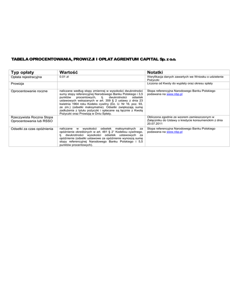 TABELA OPROCENTOWANIA, PROWIZJI I OPŁAT AGRENTUM CAPITAL Sp. z o.o. Typ opłaty Wartość Notatki Opłata rejestracyjna 0.01 zł Weryfikacja danych zawartych we Wniosku o udzielenie Pożyczki Liczona od Kwoty do wypłaty oraz okresu spłaty naliczane według stopy zmiennej w wysokości dwukrotności sumy stopy referencyjnej Narodowego Banku Polskiego i 3,5 punktów procentowych, tj. dwukrotności odsetek ustawowych wskazanych w art. 359 § 2 ustawy z dnia 23 kwietnia 1964 roku Kodeks cywilny (Dz. U. Nr 16, poz. 93, ze zm.) (odsetki maksymalne). Odsetki zwiększają sumę zadłużenia z tytułu pożyczki i spłacane są łącznie z Kwotą Pożyczki oraz Prowizją w Dniu Spłaty. Stopa referencyjna Narodowego Banku Polskiego podawana na www.nbp.pl Prowizja Oprocentowanie roczne Obliczona zgodnie ze wzorem zamieszczonym w Załączniku do Ustawy o kredycie konsumenckim z dnia 20.07.2011 Rzeczywista Roczna Stopa Oprocentowania lub RSSO Odsetki za czas opóźnienia naliczane w wysokości odsetek maksymalnych za opóźnienie określonych w art. 481 § 2 1 Kodeksu cywilnego, tj. dwukrotności wysokości odsetek ustawowych za opóźnienie (odsetki ustawowe za opóźnienie wynoszą sumę stopy referencyjnej Narodowego Banku Polskiego i 5,5 punktów procentowych). Stopa referencyjna Narodowego Banku Polskiego podawana na www.nbp.pl