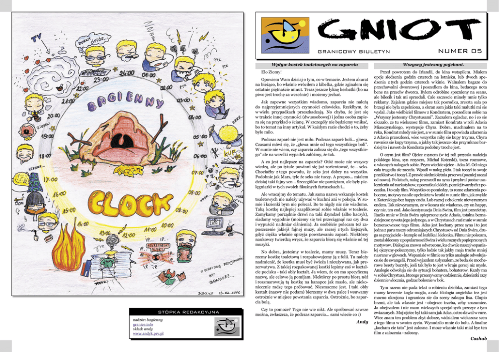 GRANICOWY BIULETYN Wpływ kostek toaletowych na zaparcia Elo Ziomy! Opowiem Wam dzisiaj o tym, co w temacie. Jestem akurat na bieżąco, bo właśnie wróciłem z kibelka, gdzie zginałem się ostatnie piętnaście minut. Teraz jeszcze łyknę herbatki (bo na piwo jest trochę za wcześnie) i możemy jechać. Jak zapewne wszystkim wiadomo, zaparcia nie należą do najprzyjemniejszych czynności człowieka. Rzekłbym, że w wielu przypadkach przeszkadzają. No chyba, że jest się w trakcie innej czynności (dwuosobowej) i jedna osoba zapiera się na przykład o ścianę. W szczegóły nie będziemy wnikać, bo to temat na inny artykuł. W każdym razie chodzi o to, żeby było miło. Podczas zaparć nie jest miło. Podczas zaparć boli... głowa. Czasami mówi się, że „głowa mnie od tego wszystkiego boli”. W sumie nie wiem, czy zaparcia zalicza się do „tego wszystkiego” ale na wszelki wypadek załóżmy, że tak. A co jest najlepsze na zaparcia? Otóż może nie wszyscy wiedzą, ale po tytule powinni się już zorientować, że... seks. Chociażby z tego powodu, że seks jest dobry na wszystko. Podobnie jak Mars, tyle że seks nie tuczy. A propos... miałem dzisiaj taki fajny sen... Szczegółów nie pamiętam, ale były pielęgniarki w tych swoich fikuśnych fartuszkach i... Ale wracajmy do tematu. Jak sama nazwa wskazuje kostek toaletowych nie należy używać w kuchni ani w pokoju. W sumie i łazienki bym nie polecał. Bo to nigdy nic nie wiadomo. Taką kostkę najlepiej zaaplikować sobie właśnie w toalecie. Zamykamy porządnie drzwi na taki dzyndzel (albo haczyk), siadamy wygodnie (możemy się też przeciągnąć raz czy dwa i wypuścić nadmiar ciśnienia). Ja osobiście polecam też zapuszczenie jakiejś fajnej muzy, ale raczej z tych lżejszych, gdyż ciężka właśnie sprzyja powstawaniu zaparć. Niektórzy naukowcy twierdzą wręcz, że zaparcia biorą się właśnie od tej muzyki. No dobra, jesteśmy w toalecie, mamy muzę. Teraz bierzemy kostkę toaletową i rozpakowujemy ją z folii. Tu należy nadmienić, że kostka musi być świeża i nieużywana, jak prezerwatywa. Z takiej rozpakowanej kostki lepimy coś w kształcie pocisku - taki obły kształt. Ja wiem, że on ma specyficzną nazwę, ale celowo ją pomijam. Niektórzy po prostu biorą nóż i rozsmarowują tą kostkę na kanapce jak masło, ale niekoniecznie radzę tego próbować. Niesmaczne jest. I taki obły kształt (nazwy nie podam) bierzemy w dwa palce i wsuwamy ostrożnie w miejsce powstania zaparcia. Ostrożnie, bo zaparcia bolą. STÓPKA REDAKCYJNA nadzór: bagienny granice.info skład: andy www.andyk.prv.pl Czy to pomoże? Tego nie wie nikt. Ale spróbować zawsze można, zwłaszcza, że podczas zaparcia... sami wiecie co :) Andy NUMER 05 Wszyscy jestesmy pojebani. Przed powrotem do Irlandii, do kina wstapilem. Mialem opcje siedzenia godzin czterech na lotnisku, lub dwoch spedzenia z tych godzin czterech w kinie. Walnalem bagaze do przechowalni dworcowej i poszedlem do kina, bedacego nota bene na przeciw dworca. Bylem odrobine spozniony na seans, ale bilecik i tak mi sprzedali. Cale szczescie minely mnie tylko reklamy. Zajalem gdzies miejsce tak posrodku, zreszta sala po brzegi nie byla zapelniona, a ekran sam jakis taki malutki mi sie wydal. Jako wielbiciel filmow z Kondratem, poszedlem sobie na „Wszyscy jestesmy Chrystusami”. Zaczalem ogladac, no i co sie okazalo, ze tu wiekszosc filmu, zamiast Kondrata w roli Adasia Miauczynskiego, wystepuje Chyra. Dobra, machnalem na to reka, Kondrat mlody nie jest, a w sumie film opowiada zdarzenia z Adasia przeszlosci, wiec wszystko niby sie kupy trzyma, Chyra rowniez sie kupy trzyma, a jakby tak jeszcze oko przymknac bardziej to i nawet do Kondrata podobny troche jest. O czym jest film? Ojciec z synem (w tej roli przyszla nadzieja polskiego kina, syn rezysera, Michal Koterski), tocza rozmowe, o wlasnych nalogach sobie. Prym wiedzie ojciec - Adas M. Od niego cala tragedia sie zaczela. Wpadl w nalog picia. I tak toczyl to swoje przeklestwo i toczyl. Z prawie siedmioletnia przerwa (pozniej zaczal od nowa). Po latach, nalog przeszedl na syna i przybral postac uzaleznienia od narkotykow, z poczatku lekkich, pozniej twardych z poczatku. I to caly film. Wszystko co pomiedzy, to rozne zdarzenia poboczne, motywy na sile upchniete w krotki w sumie film, jak zwykle u Koterskiego bez happy endu. Lub raczej z cholernie niewyraznym endem. Tak niewyraznym, ze w koncu nie wiadomo, czy on happy, czy nie, ten end. Jako kontynuacja Dnia Swira, film jest przecietny. Razilo mnie w Dniu Swira spieprzone zycie Adasia, totalna beznadziejnosc zywota jego jedynego, a w Chrystusach razi mnie w sumie bezsensownosc tego filmu. Adas jest kochany przez syna i to jest jedna z paru rzeczy odrozniajacych Chrystusow od Dnia Swira, druga sa przyjaciele - kumple od kufelka i kielonka. Filmu nie polecam, zostal sklecony z popularnosci Swira i wielu roznych popieprzonych motywow. Dialogi sa znowu odwrocone, ku chwale naszej wspanialej ojczyzny-polszczyzny, tylko ludzie tak jakby maja troche mniej nasrane w glowach. Wspaniale w filmie sa tylko analogie odwolujace sie do ewangelii. Przed wyjazdem uslyszalem, ze beda sie mocherowe berety burzyly, jesli tak bylo to jest w kraju gorzej niz mysle. Analogie odwoluja sie do sytuacji bohatera, bohaterow. Kazdy ma w sobie Chrystusa, ktorego przeszywamy codziennie, dziesiatki razy dziennie wlocznia, godzac bolesnie w bok. Tym razem nie pada tekst o robieniu dziobka, zamiast tego mamy krecenie kogla-mogla, a cala filologia angielska tez jest mocno okrojona i ogranicza sie do sceny zakupu lisa. Glupio brzmi, ale tak wlasnie jest - obejrzec trzeba, zeby zrozumiec. Ja obejrzalem i nie mam wiekszych specjalnych przezyc z tym zwiazanych. Moj ojciec byl taki sam jak Adas, ostro dawal w rure. Wiec znam ten problem zbyt dobrze, widzialem wiekszosc scen z tego filmu w swoim zyciu. Wynudzilo mnie do bolu. A finalne „kocham cie tato” jest zalosne. I moze 