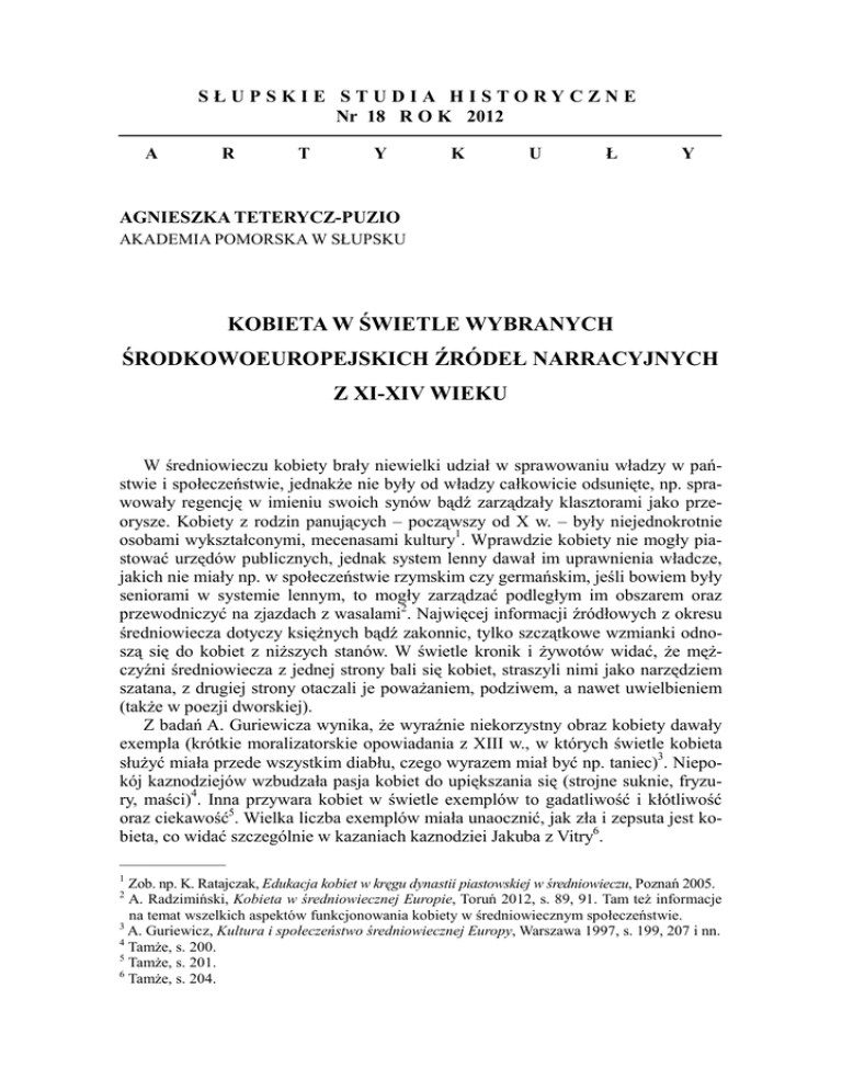 KobietaSw Ł świetle narracyjnych XI-XIV U P wybranych S K I E środkowoeuropejskich S T U D I A H Iźródeł STO R Y C ZzN E wieku 9 Nr 18 R O K 2012 A R T Y K U Ł Y AGNIESZKA TETERYCZ-PUZIO AKADEMIA POMORSKA W SŁUPSKU KOBIETA W ŚWIETLE WYBRANYCH ŚRODKOWOEUROPEJSKICH ŹRÓDEŁ NARRACYJNYCH Z XI-XIV WIEKU W średniowieczu kobiety brały niewielki udział w sprawowaniu władzy w państwie i społeczeństwie, jednakże nie były od władzy całkowicie odsunięte, np. sprawowały regencję w imieniu swoich synów bądź zarządzały klasztorami jako przeorysze. Kobiety z rodzin panujących – począwszy od X w. – były niejednokrotnie osobami wykształconymi, mecenasami kultury1. Wprawdzie kobiety nie mogły piastować urzędów publicznych, jednak system lenny dawał im uprawnienia władcze, jakich nie miały np. w społeczeństwie rzymskim czy germańskim, jeśli bowiem były seniorami w systemie lennym, to mogły zarządzać podległym im obszarem oraz przewodniczyć na zjazdach z wasalami2. Najwięcej informacji źródłowych z okresu średniowiecza dotyczy księżnych bądź zakonnic, tylko szczątkowe wzmianki odnoszą się do kobiet z niższych stanów. W świetle kronik i żywotów widać, że mężczyźni średniowiecza z jednej strony bali się kobiet, straszyli nimi jako narzędziem szatana, z drugiej strony otaczali je poważaniem, podziwem, a nawet uwielbieniem (także w poezji dworskiej). Z badań A. Guriewicza wynika, że wyraźnie niekorzystny obraz kobiety dawały exempla (krótkie moralizatorskie opowiadania z XIII w., w których świetle kobieta służyć miała przede wszystkim diabłu, czego wyrazem miał być np. taniec)3. Niepokój kaznodziejów wzbudzała pasja kobiet do upiększania się (strojne suknie, fryzury, maści)4. Inna przywara kobiet w świetle exemplów to gadatliwość i kłótliwość oraz ciekawość5. Wielka liczba exemplów miała unaocznić, jak zła i zepsuta jest kobieta, co widać szczególnie w kazaniach kaznodziei Jakuba z Vitry6. ——————— 1 Zob. np. K. Ratajczak, Edukacja kobiet w kręgu dynastii piastowskiej w średniowieczu, Poznań 2005. 2 A. Radzimiński, Kobieta w średniowiecznej Europie, Toruń 2012, s. 89, 91. Tam też informacje na temat wszelkich aspektów funkcjonowania kobiety w średniowiecznym społeczeństwie. 3 A. Guriewicz, Kultura i społeczeństwo średniowiecznej Europy, Warszawa 1997, s. 199, 207 i nn. 4 Tamże, s. 200. 5 Tamże, s. 201. 6 Tamże, s. 204. 10 Agnieszka Teterycz-Puzio W średniowieczu kobietę definiowalno jako żonę, wdowę lub dziewicę7. Kobiety pozbawione rodziny znajdowały się poza miejscem wyznaczonym im w średniowiecznym społeczeństwie. Osamotnione wdowy, kobiety ubogie często podejrzewano o złe prowadzenie się8. Pewną sferę wolności dawało kobiecie uczestnictwo w życiu religijnym, była to według M. Boguckiej jedyna sfera życia publicznego, w której istniało miejsce dla kobiet, stąd we wszystkich ruchach religijnych (wśród katarów, albigensów, lollardów, beginek) w średniowieczu odgrywały one ogromną rolę9. Sporo uwagi badacze poświęcają właśnie kobietom działającym w sferze religijnej. Jak wynika z badań M. Michalskiego, żywoty świętych kobiet, powstające od XIII w., wskazują na zachwianie, charakterystycznej dla ideologii średniowiecza, relacji podległości żony wobec męża. Mąż świętej kobiety, mimo posiadania najwyższej władzy politycznej w państwie, podlegał żonie, obdarzonej potężniejszą – bo niebiańską – władzą. Święte kobiety opisane w żywotach powstających od II połowy XIII w. stały zatem ponad średniowiecznymi zasadami, określającymi miejsce mężczyzn i kobiet w społeczeństwie10. Mówiąc o kobietach średniowiecza, nie sposób pominąć tych, które poszły drogą mężczyzn mistyków. Silnymi charakterami wyróżniały się Hildegarda z Bingen, Mechtylda z Magdeburga i Juliana z Norwich11. Hildegarda była autorką pism z zakresu nauk ścisłych i medycyny, utworów poetyckich i muzycznych, ponadto niezwykle sprawną administratorką. Prowadziła też obfitą korespondencję z głównymi postaciami ówczesnego życia politycznego i religijnego12. Jak akcentowała F. Beer, w swoich pismach Hildegarda demonstrowała wiarę w kobiecą zdolność działania13. Mechtylda z Magdeburga (ok. 1210-1297) to autorka Spływającego światła Bożego, spisanego nie po łacinie, a w dolnoniemieckim, gdzie nie brak ostrych ataków na upadek duchowieństwa, co nie przysparzało jej popularności14. Wywodziła się z możnowładczej rodziny, ale zrezygnowała z przywilejów i wstąpiła do beginek. Nawiązywała do poezji dworskiej, choć potępiała ziemską miłość. Kolejna z kobiet mistyczek to Julianna z Norwich, żyjąca w XIV w. (1342-ok. 1416)15. A. Waśko zwróciła uwagę na inną wybitną kobietę żyjącą w XIV w. – Brygidę, świętą wizjonerkę, beginkę, myślicielkę walczącą z pasją o odnowę świata, który wydawał się jej pogrążony w chaosie i upadku. Jej objawienia i założony przez nią zakon przez wieki oddziaływały na duchowość europejską. Podstawą badań A. Waśko stały się objawienia świętej, na podstawie których pokazała, jak Brygida odbierała współczesną jej rzeczywistość16. ——————— 7 J. le Goff, Człowiek średniowiecza, [w:] Człowiek średniowiecza, red. J. le Goff, Warszawa 2000, s. 35. 8 Ch. Klapisch-Zuber, Kobieta i rodzina, [w:] tamże, s. 386. 9 M. Bogucka, Białogłowa w dawnej Polsce, Warszawa 1998, s. 86. 10 M. Michalski, Kobiety i świętość w żywotach trzynastowiecznych księżnych polskich, Poznań 2004, s. 219, 310. 11 F. Beer, Kobiety i doświadczenie mistyczne w średniowieczu, Kraków 1996, s. 29-30. 12 Tamże, s. 23-24. Zob. też S. Flanagan, Hildegarda z Bingen, Warszawa 2002. 13 F. Beer, Kobiety i doświadczenie..., s. 36. 14 Tamże, s. 105-112. 15 Tamże, s. 231. 16 A. Waśko, Arystokraci ducha. Obraz społeczeńs