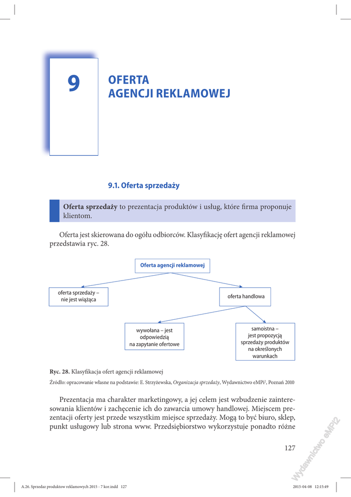 OFERTA AGENCJI REKLAMOWEJ .. Oferta sprzedaży Oferta sprzedaży to prezentacja produktów i usług, które firma proponuje klientom. Oferta jest skierowana do ogółu odbiorców. Klasyfikację ofert agencji reklamowej przedstawia ryc. . Oferta agencji reklamowej oferta sprzedaży – nie jest wiążąca oferta handlowa wywołana – jest odpowiedzią na zapytanie ofertowe samoistna – jest propozycją sprzedaży produktów na określonych warunkach Ryc. . Klasyfikacja ofert agencji reklamowej Źródło: opracowanie własne na podstawie: E. Strzyżewska, Organizacja sprzedaży, Wydawnictwo eMPi, Poznań Prezentacja ma charakter marketingowy, a jej celem jest wzbudzenie zainteresowania klientów i zachęcenie ich do zawarcia umowy handlowej. Miejscem prezentacji oferty jest przede wszystkim miejsce sprzedaży. Mogą to być biuro, sklep, punkt usługowy lub strona www. Przedsiębiorstwo wykorzystuje ponadto różne 127 A.26. Sprzedaz produktow reklamowych 2015 - 7 kor.indd 127 2015-04-08 12:15:49 formy reklamy, aby przekazać informacje o rodzajach produktów oferowanych do sprzedaży. Do popularnych nośników informacji o produktach należy reklama pozaprasowa, czyli katalogi, foldery, prospekty, ulotki, gazetki reklamowe. Firmy, aby zaprezentować swoje produkty, korzystają z popularnych portali, np. społecznościowych. Oferta prezentowana jest też na targach oraz wystawach (ryc. ). Internet targi i wystawy Prezentacja oferty sprzedaży miejsce sprzedaży publikacje Ryc. . Możliwości prezentacji oferty produktów agencji reklamowej Nie ma jednego wzorca oferty. Na jej formę i treść wpływa wiele czynników, do których należą przede wszystkim rodzaj firmy, typ oferowanych przez nią produktów, a także odbiorca, do którego adresowana jest oferta. Stopień szczegółowości oferty zależy od tego, w jakiej formie i w jakim celu jest ona przedstawiana. Jeżeli informacje zamieszczono w ulotkach lub folderach, zakres informacji jest ograniczony. Taka forma prezentacji ma skłaniać odbiorcę do odwiedzenia biura lub strony internetowej, na której znajdzie on szczegółową ofertę agencji. Oferta sprzedaży powinna być: − czytelna i przejrzysta, aby odbiorca mógł łatwo odnaleźć interesujące go informacje; − atrakcyjna wizualnie, co pozwoli przyciągnąć uwagę klienta i zachęci go do dalszych rozmów; − bezbłędna, ponieważ oferta z błędami całkowicie dyskwalifikuje oferenta i świadczy o jego braku kompetencji; − krótka, gdyż odbiorca nie chce poświęcać jej zbyt wiele czasu; długie teksty, rozbudowane katalogi zniechęcają odbiorcę do czytania; − zawsze aktualna, a produkty dobrane w taki sposób, aby mogły w pełni zaspokoić potrzeby klienta. Agencja reklamowa w swojej ofercie powinna wyszczególnić pełen zakres prowadzonych usług. Musi być skonstruowana w taki sposób, aby przekonać odbiorcę do złożenia zamówienia. Specyfika działalności agencji polega na tym, że poszczególne zlecenia mają wyjątkowy i jednorazowy charakter. Dlatego opis oferowanych usług 128 A.26. Sprzedaz produktow reklamowych 2015 - 7 kor.indd 128 2015-04-08 12:15:49 ma wskazywać przede wszystkim korzyści wynikające z ich wyboru. Klient, który zamierza zakupić usługi reklamowe, zwraca w pierwszej kolejności uwagę na ich jakość; oczekuje oryginalnej, niepowtarzalnej i profesjonalnej realizacji zlecenia. Ze względu na potrzeby klientów agencje w ofertach umieszczają następujące elementy: − krótką prezentację firmy; − przedstawienie zespołu pracowników; − listę nagród i innych osiągnięć; − portfolio; − case study; − listę klientów agencji; − opinie klientów o realizacjach; − dane kontaktowe. Krótka prezentacja firmy zawiera informacje o długości działania agencji na rynku, jej polityce, celach i wyznawanych wartościach. Przykład Nasza misja: wykonaj niewykonalne • zdobądź niezdobyte • osiągnij nieosiągalne. Od czterech lat z sukcesem realizujemy kampanie reklamowe we wszystkich mediach i poza nimi. Tworzymy nowe standardy i unikatowe rozwiązania, a osiągamy to, co zdaniem innych, jest nieosiągalne. Tworzone przez nas koncepcje wyróżnia innowacyjność i kreatywność. Wiemy, że szczegółowa analiza, wnikliwe obserwacje, trafne wnioski oraz innowacyjne projekty to klucz do sukcesu marki. Zespół pracowników jest odpowiedzialny za tworzenie reklam. Od ich pomysłowości i wiedzy zależą niepowtarzalny charakter reklamy oraz dopasowanie jej do gustów odbiorców. Przykład Sukces tworzą ludzie Dzięki pracownikom – menedżerom, artystom, pasjonatom i biznesmenom – tworzymy nasze unikatowe projekty. Ewa Nowak office manager Optymistka, pełna empatii, z łatwością zjednuje sobie ludzi. Doskonała pamięć, zorganizowanie i konsekwencja zawsze prowadzą ją do celu. Klienci chętnie z nią współpracują: twierdzą, że umie odgadnąć ich myśli i pragnienia. Mówi, że w pracy pomaga jej najbardziej… gra na skrzypcach. Jan Kowalski szef działu kreacji Dzięki jego zaangażowaniu i pasji koncepcje reklamowe przekładają się na zamierzone cele. Pracuje z nami od powstania agencji. Jako szef działu kreatywnego dba o innowacje oraz dopasowane do potrzeb klienta rozwiązania. 129 A.26. Sprzedaz produktow reklamowych 2015 - 7 kor.indd 129 2015-04-08 12:14:00 Lista nagród i innych osiągnięć – agencje biorą udział w różnego rodzaju konkursach, gdzie ich kreacje są oceniane w wielu kategoriach. Wyróżnienia i nagrody są świadectwem profesjonalizmu zespołu pracowników i przyczyniają się do zainteresowania klientów ofertą agencji. Portfolio to teczka z przykładowymi pracami artysty czy projektanta, a szerzej – prezentacja dotychczas zrealizowanych projektów. Pozwala ocenić przyszłym klientom kreatywność zespołu, styl i różnorodność wykonywanych usług. Case study (analiza przypadku) to opis otrzymanych zleceń i sposobu ich realizacji. Taki materiał świadc