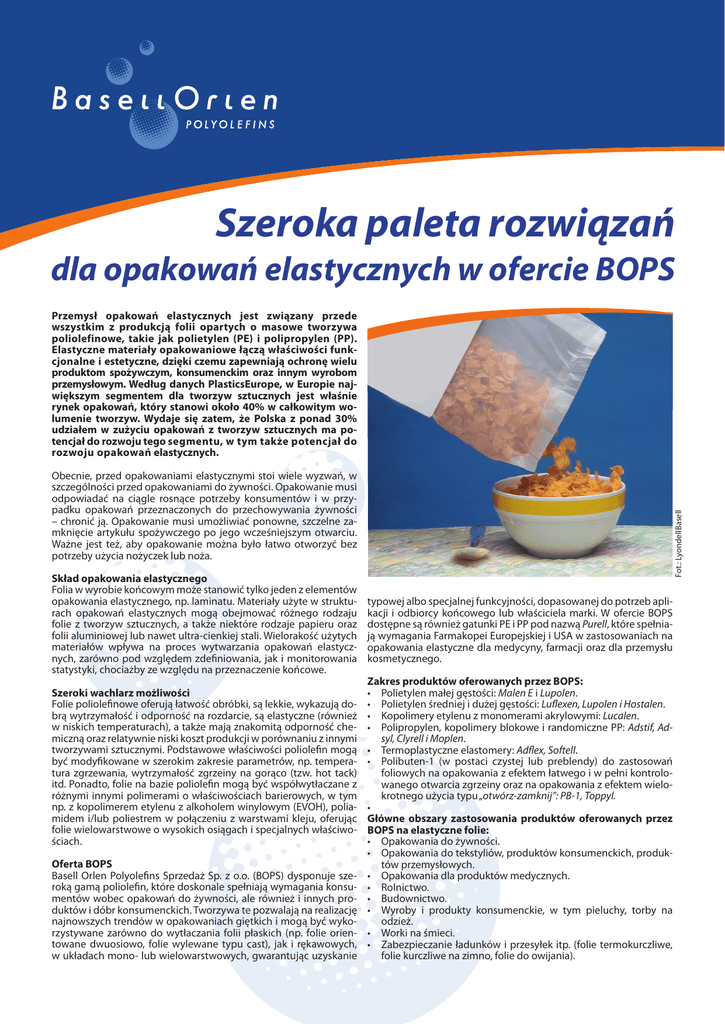 Szeroka paleta rozwiązań dla opakowań elastycznych w ofercie BOPS Przemysł opakowań elastycznych jest związany przede wszystkim z produkcją folii opartych o masowe tworzywa poliolefinowe, takie jak polietylen (PE) i polipropylen (PP). Elastyczne materiały opakowaniowe łączą właściwości funkcjonalne i estetyczne, dzięki czemu zapewniają ochronę wielu produktom spożywczym, konsumenckim oraz innym wyrobom przemysłowym. Według danych PlasticsEurope, w Europie największym segmentem dla tworzyw sztucznych jest właśnie rynek opakowań, który stanowi około 40% w całkowitym wolumenie tworzyw. Wydaje się zatem, że Polska z ponad 30% udziałem w zużyciu opakowań z tworzyw sztucznych ma potencjał do rozwoju tego segmentu, w tym także potencjał do rozwoju opakowań elastycznych. Skład opakowania elastycznego Folia w wyrobie końcowym może stanowić tylko jeden z elementów opakowania elastycznego, np. laminatu. Materiały użyte w strukturach opakowań elastycznych mogą obejmować różnego rodzaju folie z tworzyw sztucznych, a także niektóre rodzaje papieru oraz folii aluminiowej lub nawet ultra-cienkiej stali. Wielorakość użytych materiałów wpływa na proces wytwarzania opakowań elastycznych, zarówno pod względem zdefiniowania, jak i monitorowania statystyki, chociażby ze względu na przeznaczenie końcowe. Szeroki wachlarz możliwości Folie poliolefinowe oferują łatwość obróbki, są lekkie, wykazują dobrą wytrzymałość i odporność na rozdarcie, są elastyczne (również w niskich temperaturach), a także mają znakomitą odporność chemiczną oraz relatywnie niski koszt produkcji w porównaniu z innymi tworzywami sztucznymi. Podstawowe właściwości poliolefin mogą być modyfikowane w szerokim zakresie parametrów, np. temperatura zgrzewania, wytrzymałość zgrzeiny na gorąco (tzw. hot tack) itd. Ponadto, folie na bazie poliolefin mogą być współwytłaczane z różnymi innymi polimerami o właściwościach barierowych, w tym np. z kopolimerem etylenu z alkoholem winylowym (EVOH), poliamidem i/lub poliestrem w połączeniu z warstwami kleju, oferując folie wielowarstwowe o wysokich osiągach i specjalnych właściwościach. Oferta BOPS Basell Orlen Polyolefins Sprzedaż Sp. z o.o. (BOPS) dysponuje szeroką gamą poliolefin, które doskonale spełniają wymagania konsumentów wobec opakowań do żywności, ale również i innych produktów i dóbr konsumenckich. Tworzywa te pozwalają na realizację najnowszych trendów w opakowaniach giętkich i mogą być wykorzystywane zarówno do wytłaczania folii płaskich (np. folie orientowane dwuosiowo, folie wylewane typu cast), jak i rękawowych, w układach mono- lub wielowarstwowych, gwarantując uzyskanie Fot.: LyondellBasell Obecnie, przed opakowaniami elastycznymi stoi wiele wyzwań, w szczególności przed opakowaniami do żywności. Opakowanie musi odpowiadać na ciągle rosnące potrzeby konsumentów i w przypadku opakowań przeznaczonych do przechowywania żywności – chronić ją. Opakowanie musi umożliwiać ponowne, szczelne zamknięcie artykułu spożywczego po jego wcześniejszym otwarciu. Ważne jest też, aby opakowanie można było łatwo otworzyć bez potrzeby użycia nożyczek lub noża. typowej albo specjalnej funkcyjności, dopasowanej do potrzeb aplikacji i odbiorcy końcowego lub właściciela marki. W ofercie BOPS dostępne są również gatunki PE i PP pod nazwą Purell, które spełniają wymagania Farmakopei Europejskiej i USA w zastosowaniach na opakowania elastyczne dla medycyny, farmacji oraz dla przemysłu kosmetycznego. Zakres produktów oferowanych przez BOPS: • Polietylen małej gęstości: Malen E i Lupolen. • Polietylen średniej i dużej gęstości: Luflexen, Lupolen i Hostalen. • Kopolimery etylenu z monomerami akrylowymi: Lucalen. • Polipropylen, kopolimery blokowe i randomiczne PP: Adstif, Adsyl, Clyrell i Moplen. • Termoplastyczne elastomery: Adflex, Softell. • Polibuten-1 (w postaci czystej lub preblendy) do zastosowań foliowych na opakowania z efektem łatwego i w pełni kontrolowanego otwarcia zgrzeiny oraz na opakowania z efektem wielokrotnego użycia typu „otwórz-zamknij”: PB-1, Toppyl. • Główne obszary zastosowania produktów oferowanych przez BOPS na elastyczne folie: • Opakowania do żywności. • Opakowania do tekstyliów, produktów konsumenckich, produktów przemysłowych. • Opakowania dla produktów medycznych. • Rolnictwo. • Budownictwo. • Wyroby i produkty konsumenckie, w tym pieluchy, torby na odzież. • Worki na śmieci. • Zabezpieczanie ładunków i przesyłek itp. (folie termokurczliwe, folie kurczliwe na zimno, folie do owijania). Zakres poliolefin oferowanych przez BOPS do wytwarzania opakowań elastycznych: Rodzaj tworzywa Zastosowanie Kluczowe właściwości Technologia przetwórstwa Rękaw Cast X X BOPP Polietylen małej gęstości Malen E, Lupolen • Szeroki zakres płynięcia, gęstości /sztywności i optymalny pakiet dodatków. Szeroki zakres zastosowań na folie do pakowania • Doskonale zrównoważone właściwości żywności, folie do laminacji, pakowania wyrobów mechaniczne, przetwórcze i odporność konsumenckich, dóbr przemysłowych itd. chemiczna. • Doskonałe właściwości optyczne. • Niska emisja zapachu i smaku. Kopolimer etylenu z monomerami akrylowymi Lucalen Folie kurczliwe na zimno, folie rolnicze, modyfikacja właściwości. • Dobra wytrzymałość mechaniczna, elastyczność i właściwości obkurczające. X Polietylen średniej i dużej gęstości Luflexen Liniowy polietylen oferujący możliwość zmniej- • Doskonała udarność. szenia grubości folii w zastosowaniach konsu- • Sztywność. menckich i przemysłowych. • Odporność na przebicie. X Polipropylen, kopolimery blokowe i randomiczne PP Adstif Wysokokrystaliczny homopolimer. • Wyjątkowa sztywność. • Wysoka przejrzystość. Adsyl Specjalny terpolimer PP stosowany do poprawy zgrzewal