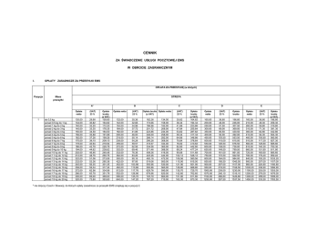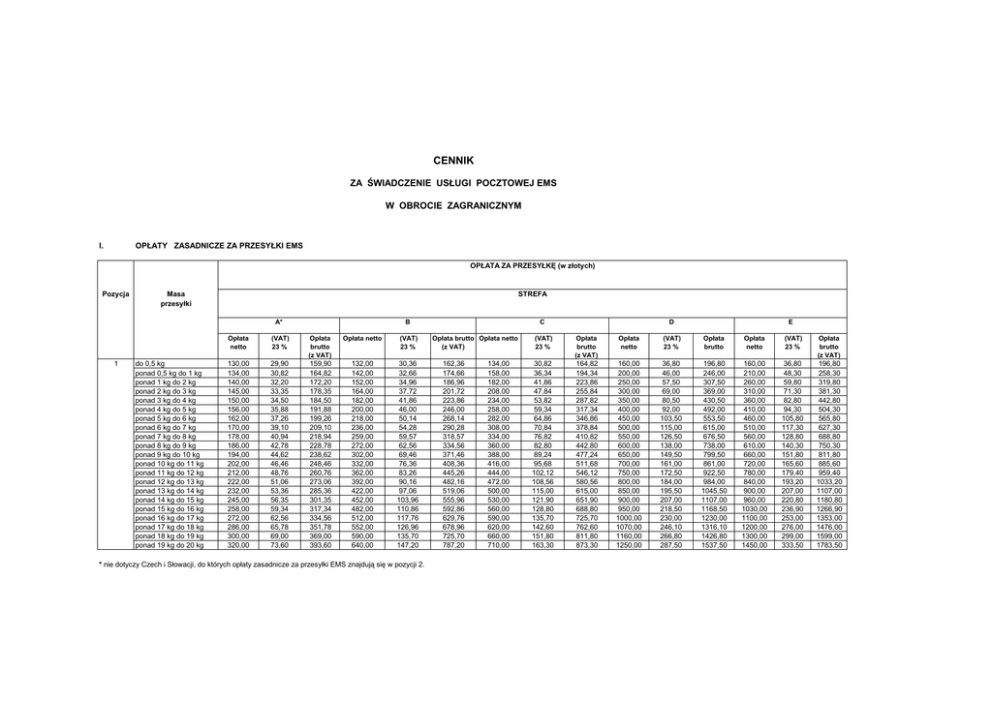 CENNIK ZA ŚWIADCZENIE USŁUGI POCZTOWEJ EMS W OBROCIE ZAGRANICZNYM OPŁATY ZASADNICZE ZA PRZESYŁKI EMS I. OPŁATA ZA PRZESYŁKĘ (w złotych) Pozycja Masa przesyłki STREFA A* 1 do 0,5 kg ponad 0,5 kg do 1 kg ponad 1 kg do 2 kg ponad 2 kg do 3 kg ponad 3 kg do 4 kg ponad 4 kg do 5 kg ponad 5 kg do 6 kg ponad 6 kg do 7 kg ponad 7 kg do 8 kg ponad 8 kg do 9 kg ponad 9 kg do 10 kg ponad 10 kg do 11 kg ponad 11 kg do 12 kg ponad 12 kg do 13 kg ponad 13 kg do 14 kg ponad 14 kg do 15 kg ponad 15 kg do 16 kg ponad 16 kg do 17 kg ponad 17 kg do 18 kg ponad 18 kg do 19 kg ponad 19 kg do 20 kg B Opłata netto (VAT) 23 % Opłata brutto (z VAT) Opłata netto (VAT) 23 % 130,00 134,00 140,00 145,00 150,00 156,00 162,00 170,00 178,00 186,00 194,00 202,00 212,00 222,00 232,00 245,00 258,00 272,00 286,00 300,00 320,00 29,90 30,82 32,20 33,35 34,50 35,88 37,26 39,10 40,94 42,78 44,62 46,46 48,76 51,06 53,36 56,35 59,34 62,56 65,78 69,00 73,60 159,90 164,82 172,20 178,35 184,50 191,88 199,26 209,10 218,94 228,78 238,62 248,46 260,76 273,06 285,36 301,35 317,34 334,56 351,78 369,00 393,60 132,00 142,00 152,00 164,00 182,00 200,00 218,00 236,00 259,00 272,00 302,00 332,00 362,00 392,00 422,00 452,00 482,00 512,00 552,00 590,00 640,00 30,36 32,66 34,96 37,72 41,86 46,00 50,14 54,28 59,57 62,56 69,46 76,36 83,26 90,16 97,06 103,96 110,86 117,76 126,96 135,70 147,20 * nie dotyczy Czech i Słowacji, do których opłaty zasadnicze za przesyłki EMS znajdują się w pozycji 2. C Opłata brutto Opłata netto (z VAT) 162,36 174,66 186,96 201,72 223,86 246,00 268,14 290,28 318,57 334,56 371,46 408,36 445,26 482,16 519,06 555,96 592,86 629,76 678,96 725,70 787,20 134,00 158,00 182,00 208,00 234,00 258,00 282,00 308,00 334,00 360,00 388,00 416,00 444,00 472,00 500,00 530,00 560,00 590,00 620,00 660,00 710,00 D E (VAT) 23 % Opłata brutto (z VAT) Opłata netto (VAT) 23 % Opłata brutto Opłata netto (VAT) 23 % Opłata brutto (z VAT) 30,82 36,34 41,86 47,84 53,82 59,34 64,86 70,84 76,82 82,80 89,24 95,68 102,12 108,56 115,00 121,90 128,80 135,70 142,60 151,80 163,30 164,82 194,34 223,86 255,84 287,82 317,34 346,86 378,84 410,82 442,80 477,24 511,68 546,12 580,56 615,00 651,90 688,80 725,70 762,60 811,80 873,30 160,00 200,00 250,00 300,00 350,00 400,00 450,00 500,00 550,00 600,00 650,00 700,00 750,00 800,00 850,00 900,00 950,00 1000,00 1070,00 1160,00 1250,00 36,80 46,00 57,50 69,00 80,50 92,00 103,50 115,00 126,50 138,00 149,50 161,00 172,50 184,00 195,50 207,00 218,50 230,00 246,10 266,80 287,50 196,80 246,00 307,50 369,00 430,50 492,00 553,50 615,00 676,50 738,00 799,50 861,00 922,50 984,00 1045,50 1107,00 1168,50 1230,00 1316,10 1426,80 1537,50 160,00 210,00 260,00 310,00 360,00 410,00 460,00 510,00 560,00 610,00 660,00 720,00 780,00 840,00 900,00 960,00 1030,00 1100,00 1200,00 1300,00 1450,00 36,80 48,30 59,80 71,30 82,80 94,30 105,80 117,30 128,80 140,30 151,80 165,60 179,40 193,20 207,00 220,80 236,90 253,00 276,00 299,00 333,50 196,80 258,30 319,80 381,30 442,80 504,30 565,80 627,30 688,80 750,30 811,80 885,60 959,40 1033,20 1107,00 1180,80 1266,90 1353,00 1476,00 1599,00 1783,50 Pozycja Masa przesyłki OPŁATA ZA PRZESYŁKĘ (w złotych) Czechy i Słowacja Przesyłki EMS zawierające dokumenty 2 do 0,5 kg ponad 0,5 kg do 1 kg ponad 1 kg do 2 kg ponad 2 kg do 3 kg ponad 3 kg do 4 kg ponad 4 kg do 5 kg ponad 5 kg do 6 kg ponad 6 kg do 7 kg ponad 7 kg do 8 kg ponad 8 kg do 9 kg ponad 9 kg do 10 kg ponad 10 kg do 11 kg ponad 11 kg do 12 kg ponad 12 kg do 13 kg ponad 13 kg do 14 kg ponad 14 kg do 15 kg ponad 15 kg do 16 kg ponad 16 kg do 17 kg ponad 17 kg do 18 kg ponad 18 kg do 19 kg ponad 19 kg do 20 kg Przesyłki EMS zawierające dokumenty i towary lub tylko towary Opłata netto (VAT) 23 % Opłata brutto (z VAT) Opłata netto (VAT) 23 % Opłata brutto (z VAT) 82,00 83,00 85,00 88,00 90,00 92,00 94,00 96,00 98,00 100,00 102,00 104,00 106,00 108,00 110,00 112,00 114,00 116,00 118,00 120,00 123,00 18,86 19,09 19,55 20,24 20,70 21,16 21,62 22,08 22,54 23,00 23,46 23,92 24,38 24,84 25,30 25,76 26,22 26,68 27,14 27,60 28,29 100,86 102,09 104,55 108,24 110,70 113,16 115,62 118,08 120,54 123,00 125,46 127,92 130,38 132,84 135,30 137,76 140,22 142,68 145,14 147,60 151,29 92,00 93,00 95,00 97,00 99,00 101,00 104,00 106,00 108,00 110,00 112,00 114,00 116,00 118,00 120,00 122,00 124,00 126,00 128,00 130,00 132,00 21,16 21,39 21,85 22,31 22,77 23,23 23,92 24,38 24,84 25,30 25,76 26,22 26,68 27,14 27,60 28,06 28,52 28,98 29,44 29,90 30,36 113,16 114,39 116,85 119,31 121,77 124,23 127,92 130,38 132,84 135,30 137,76 140,22 142,68 145,14 147,60 150,06 152,52 154,98 157,44 159,90 162,36 II. OPŁATY ZA SPECJALNE RODZAJE PRZESYŁEK EMS Pozycja 3 4 Opłata za przesyłkę (w złotych) Rodzaj przesyłki EMS Opłata netto (VAT) 23 % Opłata brutto (z VAT) 2) nadawany do Czech lub Słowacji** 100,00 75,00 23,00 17,25 123,00 92,25 Kilo Pack (przesyłka o masie do 1 kg): 1) nadawany do wszystkich krajów, z wyjątkiem Czech i Słowacji 120,00 27,60 147,60 80,00 18,40 98,40 85,00 19,55 104,55 Document Pack (przesyłka o masie do 0,5 kg): 1) nadawany do wszystkich krajów, z wyjątkiem Czech i Słowacji 2) nadawany do Czech lub Słowacji z zawartością tylko dokumentów** 3) nadawany do Czech lub Słowacji z zawartością dokumentów i towarów lub tylko towarów** UWAGI: 1. Przesyłki ,,Document Pack" i ,,Kilo Pack" przyjmowane są wyłącznie w specjalnych kopertach. 2. Uiszczenie opłaty za koperty ,,Document Pack" i ,,Kilo Pack" jest równoznaczne z opłaceniem usługi. 3. Koperty ,,Document Pack" i ,,Kilo Pack" można nabywać w placówkach pocztowych wytypowanych do przyjmowania przesyłek EMS i u kuriera. ** Klient może skorzystać z obniżonych opłat przy wysyłaniu przesyłek „Document Pack” lub „Kilo Pack” do Czech lub Słowacji jedynie w sytuacji, gdy jednocześnie kupuje koperty specjalne „Document Pack” lub „Kilo Pack” i od razu je nadaje. III. Pozycja 5 SKŁADKI Z TYTUŁU UBEZPIECZENIA Składka za ubezpieczen