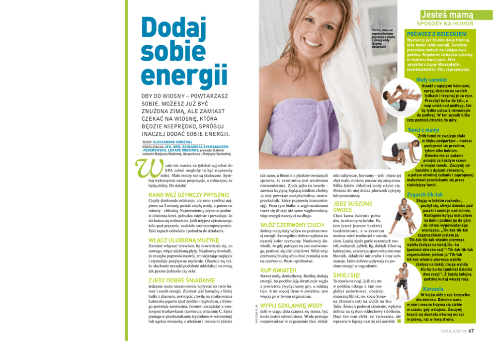 Dodaj sobie energii Jesteś mamą sposoby na humor Zacznij dzień od naprzemiennego prysznica z ciepłej i zimnej wody. Ożywia doskonale! Wystarczy już 10-minutowy trening, żeby dodać sobie energii. Zwiększa przemianę materii na kolejne dwie godziny. Regularne ćwiczenia sprawią, że będziesz lepiej spać. Weź przykład z Jagny Marczułajtis, snowboardzistki. Oto jej propozycje. Mały samolot Usiadź z ugiętymi kolanami, oprzyj dziecko na swoich łydkach i trzymaj je za ręce. Przechyl tułów do tyłu, a nogi unieś nad podłogę, tak by łydko ustawić równolegle do podłogi. W ten sposób kilka razy podnieś dziecko do góry. Oby do wiosny – powtarzasz sobie. możesz już być znużona zimą, Ale zamiast czekać na wiosnę, która będzie nieprędko, spróbuj inaczej dodać sobie energii. Tunel z mamy w tekst: aleksandra sobieraj konsultacja: lek. med. Sainjargal Byambasuren- -Federowska, lekarz rodzinny, prowadzi Gabinet Lekarski Medycyny Rodzinnej, Akupunktury i Medycyny Wschodniej cale nie musisz na tydzień wyjechać do SPA (choć mogłoby to być naprawdę miłe). Małe rzeczy też są skuteczne. Spróbuj wykorzystać nasze propozycje, a zobaczysz, że będą efekty. Do dzieła! tak samo, a błonnik z płatków owsianych sprawia, że serotonina jest uwalniana równomiernie). Zjedz jajko na twardo – zawiera lecytynę, będącą źródłem choliny (z niej powstaje acetylocholina, neuroprzekaźnik, który poprawia koncentrację). Poza tym białko z węglowodanami trawi się dłużej niż same węglowodany, więc energii starczy ci na długo. rano Weź ożywczy prysznic Ciepły doskonale relaksuje, ale rano spróbuj najpierw na 3 minuty puścić ciepłą wodę, a potem na minutę – chłodną. Naprzemienny prysznic podnosi ciśnienia krwi, pobudza mięśnie i powoduje, że do końca się rozbudzisz. Jeśli użyjesz cytrusowego żelu pod prysznic, zadziała aromaterapeutycznie. Taki zapach odświeża i pobudza do działania. Włóż czerwony ciuch Kolory mają duży wpływ na poziom twoej energii. Szczególnie dobrze wpływa na nastrój kolor czerwony. Naukowcy dowiedli, że gdy patrzysz na coś czerwonego, podnosi się ciśnienie krwi. Włóż więc czerwoną bluzkę albo choć pomaluj usta na czerwono. Warto spróbować. Włącz ulubioną muzykę Zamiast włączać telewizor, by dowiedzieć się, co nowego, włącz ulubioną płytę. Naukowcy dowiedli, że muzyka poprawia nastrój, zmniejszając napięcie i stymuluje pozytywne myślenie. Okazuje się też, że słuchanie muzyki podobnie oddziałuje na mózg jak pyszne jedzenie czy seks. kup kwiatek Nawet mały, doniczkowy. Rośliny dodają energii, bo pochłaniają dwutlenek węgla z powietrza (wydychamy go), a oddają tlen. A im więcej tlenu w pwietrzu, tym więcej go w twoim organizmie. FOT.: CORBIS , RF Zjedz dobre śniadanie Jedzenie może niesamowicie wpływać na twój humor i zasób energii. Zamiast jeść kanapkę z białej bułki z dżemem, poświęcić chwilę na zmiksowanie kubeczka jogurtu (jest źródłem tryptofanu, z którego powstaje serotonina, hormon szczęścia) z mrożonymi truskawkami (zawierają witaminę C, która pomaga w przekształcaniu tryptofanu w serotoninę) lub ugotuj owsiankę z mlekiem i owocami (działa Poćwicz z dzieckiem wypij szklankę wody Jeśli w ciągu dnia czujesz się senna, być może jesteś odwodniona. Woda pomaga rozprowadzać w organizmie tlen, skład- niki odżywcze, hormony – jeśli pijesz jej zbyt mało, możesz poczuć się zmęczona. Kilka łyków chłodnej wody ożywi cię. Możesz do niej dodać plasterek cytryny lub pomarańczy. jedz suszone owoce Choć kawa świetnie pobudza, to niestety na krótko. Potem jesteś jeszcze bardziej rozdrażniona, a wieczorem możesz mieć trudności z zaśnięciem. Lepiej zjedz garść suszonych moreli, rodzynek, jabłek, fig, daktyli. Choć są kaloryczne, zawierają sporo witamin oraz błonnik, składniki mineralne i inne substancje, które dobrze wpływają na poziom energii w organizmie. Śmiej się! To stawia na nogi. Jeśli nie ma w pobliżu nikogo z kim mogłabyś pożartować, obejrzyj śmieszny filmik, no. kocie Simona (Simon’s cat) na wejdź na You Tube. Śmiech podnosi ciśnienie, wpływa dobrze na system oddechowy i dotlenia. Daje ten sam efekt, co ćwiczenia, ale wprawia w lepszy nastrój niż aerobik. n Zrób tunel ze swojego ciała w klęku podpartym – możesz podeprzeć się przodem, tyłem albo bokiem. Dziecko ma za zadanie przejść za każdym razem w innym tunelu. Zaczynij od tunelów z dużymi otworami, a potem utrudnij zadanie i zaproponuj maluchowi przeciskanie się przez ciaśniejszy tunel. Zegarek tik-tak Stojąc w lekkim rozkroku, pochyl się, chwyć dziecko pod paszki i unieś je nad ziemię. Następnie kołysz maluchem na boki i podnoś go do góry do rytmu wypowiadanego wierszyka: „Tik-tak tik-tak zegareczkiem jestem ja/ Tik-tak tik-tak właśnie pierwsza wybiła (kołysz na boki)/Ku- ku (podnieś dziecko raz)”/ Tik-tak tik-tak zegareczkiem jestem ja/ Tik-tak tik-tak właśnie pierwsza wybiła (kołysz na boki)/ druga wybiła Ku-ku ku-ku (podnieś dziecko dwa razy)”. Z każdą kolejną godziną kukaj więcej razy. Karuzela W klęku ułóż z rąk krzesełko dla dziecka. Dziecko siada w nim i mocno trzyma się ciebie w czasie, gdy wstajesz. Zaczynij kręcić się dookoła własnej osi raz w prawą, raz w lewą stronę. TWOJE DZIECKO 67