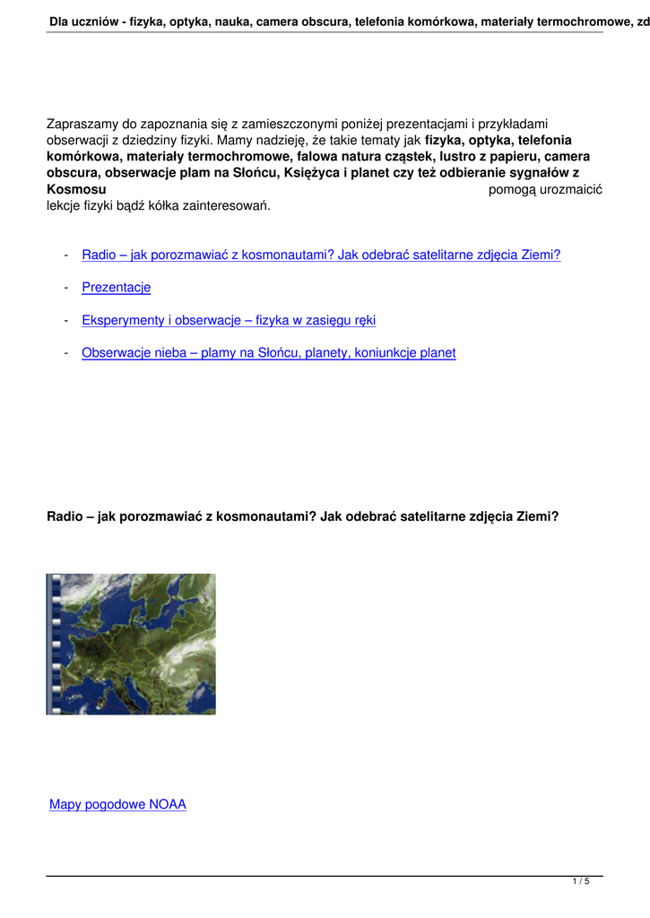 Dla uczniów - fizyka, optyka, nauka, camera obscura, telefonia komórkowa, materiały termochromowe, zd Zapraszamy do zapoznania się z zamieszczonymi poniżej prezentacjami i przykładami obserwacji z dziedziny fizyki. Mamy nadzieję, że takie tematy jak fizyka, optyka, telefonia komórkowa, materiały termochromowe, falowa natura cząstek, lustro z papieru, camera obscura, obserwacje plam na Słońcu, Księżyca i planet czy też odbieranie sygnałów z Kosmosu pomogą urozmaicić lekcje fizyki bądź kółka zainteresowań. - Radio – jak porozmawiać z kosmonautami? Jak odebrać satelitarne zdjęcia Ziemi? - Prezentacje - Eksperymenty i obserwacje – fizyka w zasięgu ręki - Obserwacje nieba – plamy na Słońcu, planety, koniunkcje planet Radio – jak porozmawiać z kosmonautami? Jak odebrać satelitarne zdjęcia Ziemi? Mapy pogodowe NOAA 1/5 Dla uczniów - fizyka, optyka, nauka, camera obscura, telefonia komórkowa, materiały termochromowe, zd czyli odbieramy sygnały z satelitów Jak porozmawiać z kosmonautami czyli łączność z Międzynarodową Stacją Kosmiczną w ramach ARISS Prezentacje 2/5 Dla uczniów - fizyka, optyka, nauka, camera obscura, telefonia komórkowa, materiały termochromowe, zd CzyKawalec, technologię (T. powinniśmy GSM wrzesień się przejmować 2012) prędkością światła w codziennym życiu? Rzut okiem na Atomy (T. Krótki Kawalec, oraz — wykład cząstki marzec Materiały na czy uroczystości 2010) fale termochromowe zakończenia Małopolskiego Konkursu z Fizyki i Astronomii download Telefonia Wykład (T. Kawalec, w komórkowa ramach kwiecień cyklu — 2016) Bliżej jak toNauki działa W (T. Okazuje mieście Kawalec, Sønderborg się, 2008) że [wym. współpraca Sönebo] to było i w Danii finansowanie latznajduje temu ).zasięgu świadkiem się → staże jedenwydarzenia, z kampusówoUniwersytetu którym wiedzą Południowej bez wyjątkuDanii, wszys z download Eksperymenty i miasto obserwacje – 350 fizyka w ręki 3/5 Dla uczniów - fizyka, optyka, nauka, camera obscura, telefonia komórkowa, materiały termochromowe, zd Segway z LEGO dwukołowy, samobalansujący Mindstorms robot z LEGO Mindstorms Tajniki czyli czego optyki możemy — lustro sięz dowiedzieć papieru z równań Fresnela Dziurka czyli o camera od klucza obscura — nietypowe w wersji zastosowanie XL Wiosna walczy ze–śniegiem Obserwacje nieba plamy na Słońcu, planety, koniunkcje planet jak bezpiecznie wskazówki Słońce zdjęcia Plamy na z użyciem Słońcuobserwować –filtru wybrane Baader zdjęcia Jowisz, Saturn, obserwacje gazowych Wenus,olbrzymów, Księżyc, mgławica Wenus i M42 jej faz, Księżyca, mgławic – aparatem z zoomem 4/5 Dla uczniów - fizyka, optyka, nauka, camera obscura, telefonia komórkowa, materiały termochromowe, zd Ciekawe konfiguracje ciekawe zjawiska na niebie jasnych obiektów na niebie Zaćmienie po zaćmienia Słońca amatorsku i Księżyca, półcieniowe zaćmienie Księżyca 5/5