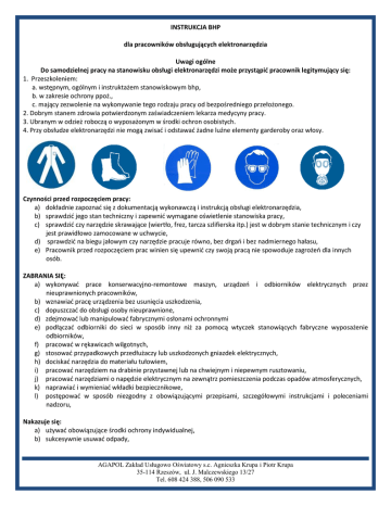 INSTRUKCJA BHP dla pracowników obsługujących elektronarzędzia Uwagi ogólne Do samodzielnej pracy na stanowisku obsługi elektronarzędzi może przystąpić pracownik legitymujący się: 1. Przeszkoleniem: a. wstępnym, ogólnym i instruktażem stanowiskowym bhp, b. w zakresie ochrony ppoż., c. mający zezwolenie na wykonywanie tego rodzaju pracy od bezpośredniego przełożonego. 2. Dobrym stanem zdrowia potwierdzonym zaświadczeniem lekarza medycyny pracy. 3. Ubranym w odzież roboczą o wyposażonym w środki ochron osobistych. 4. Przy obsłudze elektronarzędzi nie mogą zwisać i odstawać żadne luźne elementy garderoby oraz włosy. Czynności przed rozpoczęciem pracy: a) dokładnie zapoznać się z dokumentacją wykonawczą i instrukcją obsługi elektronarzędzia, b) sprawdzić jego stan techniczny i zapewnić wymagane oświetlenie stanowiska pracy, c) sprawdzić czy narzędzie skrawające (wiertło, frez, tarcza szlifierska itp.) jest w dobrym stanie technicznym i czy jest prawidłowo zamocowane w uchwycie, d) sprawdzić na biegu jałowym czy narzędzie pracuje równo, bez drgań i bez nadmiernego hałasu, e) Pracownik przed rozpoczęciem prac winien się upewnić czy swoją pracą nie spowoduje zagrożeń dla innych osób. ZABRANIA SIĘ: a) wykonywać prace konserwacyjno-remontowe maszyn, urządzeń i odbiorników elektrycznych przez nieuprawnionych pracowników, b) wznawiać pracę urządzenia bez usunięcia uszkodzenia, c) dopuszczać do obsługi osoby nieuprawnione, d) zdejmować lub manipulować fabrycznymi osłonami ochronnymi e) podłączać odbiorniki do sieci w sposób inny niż za pomocą wtyczek stanowiących fabryczne wyposażenie odbiorników, f) pracować w rękawicach wilgotnych, g) stosować przypadkowych przedłużaczy lub uszkodzonych gniazdek elektrycznych, h) dociskać narzędzia do materiału tułowiem, i) pracować narzędziem na drabinie przystawnej lub na chwiejnym i niepewnym rusztowaniu, j) pracować narzędziami o napędzie elektrycznym na zewnątrz pomieszczenia podczas opadów atmosferycznych, k) naprawiać i wymieniać wkładki bezpiecznikowe, l) postępować w sposób niezgodny z obowiązującymi przepisami, szczegółowymi instrukcjami i poleceniami nadzoru, Nakazuje się: a) używać obowiązujące środki ochrony indywidualnej, b) sukcesywnie usuwać odpady, AGAPOL Zakład Usługowo Oświatowy s.c. Agnieszka Krupa i Piotr Krupa 35-114 Rzeszów, ul. J. Malczewskiego 13/27 Tel. 608 424 388, 506 090 533 c) utrzymywać w porządku miejsce pracy, nie rozrzucać narzędzi i przedmiotów przeznaczonych do obróbki lub obrobionych, d) przy obróbce, przy której występują odpryski stosować okulary ochronne a przy dużym zapyleniu półmaski ochronne, e) w trakcie wykonywania obróbki narzędzie skrawające dociskać do materiału ostrożnie i bez nadmiernej siły, UWAGA a) narzędzia i urządzenia o napędzie elektrycznym podlegają okresowym przeglądom i badaniom, b) badania okresowe należy wykonywać: co 6 miesięcy dla elektronarzędzi zaliczanych do kategorii użytkowania I, co 4 miesiące dla elektronarzędzi zaliczanych do kategorii użytkowania II, co 2 miesiące dla elektronarzędzi zaliczanych do kategorii użytkowania III, po każdej zaistniałej sytuacji mogącej mieć wpływ na bezpieczeństwo użytkowania elektronarzędzia (upadek, zawilgocenie itp.). Po zakończeniu pracy pracownik powinien: 1. Dokładnie oczyścić stanowisko pracy. 2. Zabezpieczyć przenośne urządzenia elektryczne tak, by było niemożliwe uruchomienie go przez osoby postronne i by nie stwarzały one zagrożeń. 3. Oczyścić ochrony osobiste i ułożyć je na miejsce stałego składowania. 4. Uporządkować stanowisko pracy, odłożyć sprzęt służący do wykonywanej pracy na miejsce. Postępowanie w sytuacjach awaryjnych W razie zauważenia usterek lub jakichkolwiek zagrożeń na stanowisku należy je natychmiast zgłosić bezpośredniemu przełożonemu by zostały natychmiast usunięte. Do pracy można przystąpić ponownie dopiero po ich usunięciu i ponownym sprawdzeniu pracy urządzenia. W przypadku powstania pożaru należy - ostrzec osoby znajdujące się w obrębie zagrożenia, - wyłączyć zasilanie budynku w energię elektryczną i odciąć dopływ gazu, - zaalarmować straż pożarną, - powiadomić przełożonych o pożarze, - podjąć decyzję o ewakuacji ludzi, - przystąpić do prowadzenia akcji gaśniczej za pomocą podręcznego sprzętu gaśniczego. W przypadku zaistnienia wypadku - zabezpieczyć miejsce zdarzenia, - udzielić poszkodowanemu pierwszej pomocy, - w razie potrzeby wezwać pomoc lekarską, - powiadomić przełożonych. Uwaga 1. W razie wątpliwości co do zachowania warunków bezpieczeństwa pracy pracownik ma prawo przerwać pracę i zwrócić się do przełożonego o wyjaśnienie sytuacji. 2. W przypadku znalezienia się wobec bezpośredniego niebezpieczeństwa ma prawo powstrzymać się od wykonywania pracy. Pracownik w omawianej sytuacji zachowuje prawo do wynagrodzenia, nie może jednak odmówić podjęcia innej, równorzędnej pracy, gdy usunięcie zagrożenia przy poprzednio wykonywanej pracy nie jest możliwe. Zatwierdził …….……………………………. AGAPOL Zakład Usługowo Oświatowy s.c. Agnieszka Krupa i Piotr Krupa 35-114 Rzeszów, ul. J. Malczewskiego 13/27 Tel. 608 424 388, 506 090 533