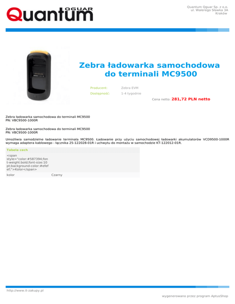 Quantum Qguar Sp. z o.o. ul. Walerego Sławka 3A Kraków Zebra ładowarka samochodowa do terminali MC9500 Producent: Zebra EVM Dostępność: 1-4 tygodnie Cena netto: 281,72 PLN netto Zebra ładowarka samochodowa do terminali MC9500 PN: VBC9500-1000R Zebra ładowarka samochodowa do terminali MC9500 PN: VBC9500-1000R Umożliwia samodzielne ładowanie terminala MC9500. Ładowanie przy użyciu samochodowej ładowarki akumulatorów VCD9500-1000R wymaga adaptera kablowego - łącznika 25-122028-01R i uchwytu do montażu w samochodzie KT-122012-01R. Tabela cech <span style="color:#587394;fon t-weight:bold;font-size:10 pt;background-color:#efef ef;">Kolor</span> kolor Czarny http://www.it-zakupy.pl wygenerowano przez program AptusShop