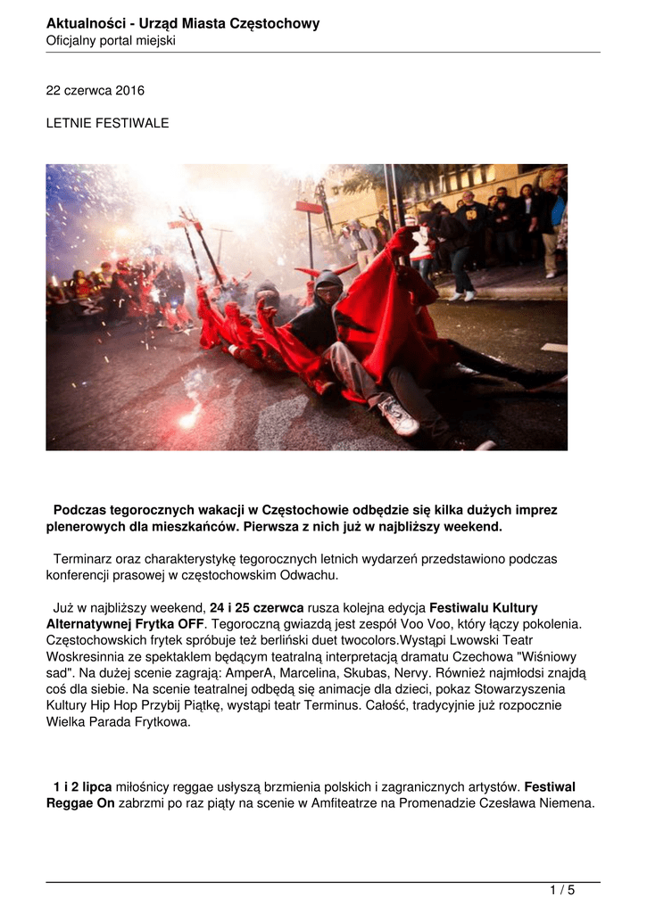 Aktualności - Urząd Miasta Częstochowy Oficjalny portal miejski 22 czerwca 2016 LETNIE FESTIWALE Podczas tegorocznych wakacji w Częstochowie odbędzie się kilka dużych imprez plenerowych dla mieszkańców. Pierwsza z nich już w najbliższy weekend. Terminarz oraz charakterystykę tegorocznych letnich wydarzeń przedstawiono podczas konferencji prasowej w częstochowskim Odwachu. Już w najbliższy weekend, 24 i 25 czerwca rusza kolejna edycja Festiwalu Kultury Alternatywnej Frytka OFF. Tegoroczną gwiazdą jest zespół Voo Voo, który łączy pokolenia. Częstochowskich frytek spróbuje też berliński duet twocolors.Wystąpi Lwowski Teatr Woskresinnia ze spektaklem będącym teatralną interpretacją dramatu Czechowa "Wiśniowy sad". Na dużej scenie zagrają: AmperA, Marcelina, Skubas, Nervy. Również najmłodsi znajdą coś dla siebie. Na scenie teatralnej odbędą się animacje dla dzieci, pokaz Stowarzyszenia Kultury Hip Hop Przybij Piątkę, wystąpi teatr Terminus. Całość, tradycyjnie już rozpocznie Wielka Parada Frytkowa. 1 i 2 lipca miłośnicy reggae usłyszą brzmienia polskich i zagranicznych artystów. Festiwal Reggae On zabrzmi po raz piąty na scenie w Amfiteatrze na Promenadzie Czesława Niemena. 1/5 Aktualności - Urząd Miasta Częstochowy Oficjalny portal miejski Impreza rozpocznie się w piątek 1 lipca w Teatrze From Poland o godzinie 21.00. Festiwal otworzy pochodzący z Częstochowy Jahster Selecta, którego muzyka balansuje na pograniczu raggamuffin reggae i dancehall’u. Steppa Warriors to kolejna, polska propozycja na tej scenie. W sobotę, 9 lipca w Amfiteatrze na Promenadzie Czesława Niemena odbędzie się Festiwal Retro Częstochowa. Zabrzmią największe hity dwudziestolecia międzywojennego. Po raz pierwszy na Festiwalu Retro Częstochowa zaprezentuje się międzynarodowa formacja Goodnight Circus. Wykona berlińskie szlagiery lat 30. Tradycyjnie nie zabraknie atrakcji pozamuzycznych. Organizatorzy zaplanowali m.in. zajęcia dla dzieci, pokazy cyrkowe oraz giełdę staroci. Wszystkim, którzy po wieczorze retro na promenadzie wybiorą się na afterparty w Klubie Tori zabawę taneczną zapewni Kapela Awantaż. Hip Hop Elements to kolejna propozycja plenerowego festiwalu, który potrwa od 14 do 16 lipca. To już siódma edycja. Tegoroczna impreza rozpocznie się warsztatami producenckodj'skimi w OPK Gaude Mater. Poprowadzi je czołowy polski raper i producent Adam O.S.T.R. Ostrowski wraz z Dj Haemem. Obaj należą do najbardziej znaczących postaci polskiej sceny hip-hop, dlatego będą mogli podzielić się ogromnym doświadczeniem i wiedzą. Wieczorem w Klubie Rura rozpocznie się oficjalne, muzyczne otwarcie festiwalu, urozmaicone projekcjami video. W piątek o godzinie 18:00 w III Alei odbędzie się Full Flava - turniej tancerzy breakdance, którego pomysłodawcą jest znany w środowisku b-boy Snake z Częstochowy, założyciel szkoły tańca ,,Snake Dance". Udział w takich zmaganiach może wziąć każdy, ważna jest dobra zabawa i pozytywna energia. Turniejowi towarzyszyć będą warsztaty organizowane przez Stowarzyszenie „Przybij Piątkę”. Wieczorem w Klubie Rura wystartuje z kolei tematyczna impreza Boom Bap Warriors. Goście będą bawić się przy beat'ach podgatunku Boom Bap, kojarzonego ze sposobem produkcji popularnym w latach 90. na Wschodnim Wybrzeżu USA. W sobotę w Amfiteatrze na Promenadzie Czesława Niemena odbędą się finałowe koncerty Hip Hop Elements. Jako pierwszy sceną zawładnie Dj Lem, który wraz z Mikserem będzie odpowiedzialny za prowadzenie imprezy. Lem znany jest dzięki takim projektom jak SekendHend czy Hurragun, a przede wszystkim ze współpracy z częstochowskim raperem Sensim. Kolejnym punktem programu będzie występ reprezentanta wytwórni Asfalt Records, częstochowianina Mikołaja Kubickiego, skrywającego się pod pseudonimem Meek, OH Why?. Słynący z nietuzinkowych beat'ów Mikołaj ukarze talenty młodego pokolenia rapu. Tuż po nim usłyszymy płynny i mądry rap wychowanka wytwórni Alkopoligamia.com, Kuby Knapa. Będzie to jego pierwszy występ w naszym mieście. Finał wieczoru uświetnią najwięksi wyjadacze polskiej sceny: Łona & Webber, Ten Typ Mes i Tede. Sobotniej imprezie na Promenadzie towarzyszyć będzie m.in. tworzenie graffiti 3D. Charakteryzuje się ono spektakularną przestrzenną formą, dającą niesamowity w odbiorze efekt końcowy. Przy moście na Promenadzie, na wysokości ulicy Fieldorfa-Nila, stworzą je najlepsi graficiarze z Częstochowy. Będzie to pierwsza w miejskiej scenerii akcja tego rodzaju. Po koncertach finałowych after party w Klubie Rura. Przez trzy soboty sierpnia (6,13,20) uczestnicy Festiwalu Filmowego „Leżak Fortum” będą 2/5 Aktualności - Urząd Miasta Częstochowy Oficjalny portal miejski mogli obejrzeć na Promenadzie Czesława Niemena kinowe hity. Tegoroczne, 24 Dni Częstochowy upłyną pod hasłem „Jasne, że Województwo Częstochowskie”. Swoje największe przeboje zagrają kultowe zespoły: T.Love, Formacja Nieżywych Schabuff, Shamboo. Utytułowanych artystów młodszego pokolenia będą reprezentować Sarius i Agata Dziarmagowska. Wszystkie koncerty (zaplanowane na 27 sierpnia na skwerze za linią tramwajową na Północy) poprowadzi popularny dziennikarz i konferansjer, częstochowianin Ireneusz Bieleninik. 26 sierpnia, w uroczystość Najświętszej Maryi Panny Częstochowskiej, wierni będą modlić się w intencji miasta na Jasnej Górze. Z kolei 28 sierpnia na placu Biegańskiego odbędzie się dedykowany wszystkim częstochowianom, pełen atrakcji piknik rodzinny. Dni Częstochowy zakończy uroczysty koncert w wykonaniu Orkiestry Symfonicznej Filharmonii Częstochowskiej im. Bronisława Hubermana pod dyrekcją Adama Klocka. PROGRAMY NAJBLIŻSZYCH IMPREZ: FRYTKA OFF: 24 czerwca, piątek mała scena muzyczna 17.00- 17.40 Krzywe Nogi 18.00 - 19.00 EXTRA 19.30 - 20.30 Daniel Bloom 21.00 - 22.00 twocolors (Berlin) 22.40 