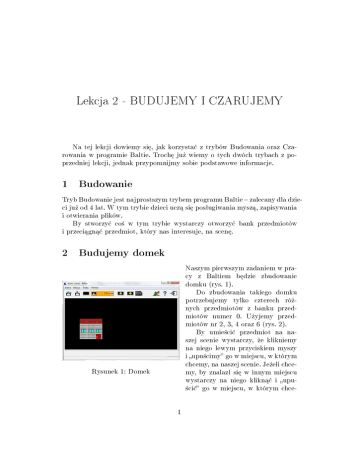 Lekcja 2 - BUDUJEMY I CZARUJEMY Na tej lekcji dowiemy si¦, jak korzysta¢ z trybów Budowania oraz Czarowania w programie Baltie. Troch¦ ju» wiemy o tych dwóch trybach z poprzedniej lekcji, jednak przypomnijmy sobie podstawowe informacje. 1 Budowanie Tryb Budowanie jest najprostszym trybem programu Baltie zalecany dla dzieci ju» od 4 lat. W tym trybie dzieci ucz¡ si¦ posªugiwania mysz¡, zapisywania i otwierania plików. By stworzy¢ co± w tym trybie wystarczy otworzy¢ bank przedmiotów i przeci¡gn¡¢ przedmiot, który nas interesuje, na scen¦. 2 Budujemy domek Naszym pierwszym zadaniem w pracy z Baltiem b¦dzie zbudowanie domku (rys. 1). Do zbudowania takiego domku potrzebujemy tylko czterech ró»- nych przedmiotów z banku przedmiotów numer 0. U»yjemy przedmiotów nr 2, 3, 4 oraz 6 (rys. 2). By umie±ci¢ przedmiot na naszej scenie wystarczy, »e klikniemy na niego lewym przyciskiem myszy i upu±cimy go w miejscu, w którym chcemy, na naszej scenie. Je»eli chceRysunek 1: Domek my, by znalazª si¦ w innym miejscu wystarczy na niego klikn¡¢ i upu±ci¢ go w miejscu, w którym chce- 1 my. By usun¡¢ przedmiot wystarczy, »e przeci¡gniemy go po za scen¦, gdzie pojawi si¦ na nim krzy»yk. W tym zadaniu najbardziej interesuje nas jak ten sam przedmiot umie±ci¢ na scenie kilka razy. Mo»emy oczywi±cie za ka»dym razem otwiera¢ bank przedmiotów i wybiera¢ interesuj¡cy nas przedmiot. Jednak du»o ªatwiejszym sposobem b¦dzie klikni¦cie prawym przyciskiem myszy na naszym przedmiocie, który znajduje si¦ ju» na scenie, przesuni¦cie go w nowe miejsce i upuszczenie równie» prawym przyciskiem myszy. Rysunek 2: Potrzebne przedmioty 3 Zapis i otwieranie sceny Zapis sceny Teraz zapiszmy zbudowany przez nas domek. Rysunek 3: Zapis sceny 2 By zapisa¢ po raz pierwszy nasz¡ scen¦ mo»emy klikn¡¢ na dyskietk¦ z czerwon¡ strzaªk¡, która znajduje si¦ na pasku narz¦dzi lub wybra¢ z menu gªównego: Scena->Zapisz (Zobacz rys. 3). Powinno pojawi¢ si¦ okno zapisu sceny (Zobacz rys. 4). Rysunek 4: Okno zapisu sceny Musimy teraz wybra¢ folder, w którym zapiszemy nasz¡ scen¦. Wa»ne!!! Najgorszym miejscem do zapisu naszej sceny jest folder, który podpowiada nam Baltie, czyli miejsce, gdzie zainstalowany jest program Baltie (w moim przypadku, to SGP Baltie 3, zobacz rys. 5). Rysunek 5: Wybór miejsca zapisu - folder SGP Baltie Przy pó¹niejszym usuwaniu zb¦dnych scen lub plików z programami stworzonymi przez nas mo»emy przez przypadek usun¡¢ pliki niezb¦dne do dziaªania Baltiego. W zwi¡zku z powy»szymi informacjami pami¦tajmy, by efekty naszej pracy zapisa¢ w naszym osobnym folderze, np. w moich dokumentach albo na pulpicie. Mój folder do zapisów znajduj¦ si¦ na pulpicie i jest to folder o nazwie Edyta (Zobacz rys. 6). Rysunek 6: Wybór miejsca zapisu - mój folder Teraz musimy zmieni¢ nazw¦ pliku (Zobacz rys. 7), z nasz¡ scen¡, na domek i zatwierdzamy przyciskiem Zapisz. 3 Rysunek 7: Zmiana nazwy zapisywanego pliku Otwieranie sceny Gdy ponownie b¦dziemy chcieli u»y¢ naszej sceny lub j¡ zmieni¢ wystarczy otworzy¢ j¡ w Baltiem. Mo»emy, to zrobi¢ na dwa sposoby: za pomoc¡ dyskietki z niebiesk¡ strzaªk¡, która znajduje si¦ na pasku narz¦dzi lub za pomoc¡ menu gªównego Scena->Otwórz/Nowa. Rysunek 8: Otwieranie sceny Pojawi si¦ okno otwierania sceny, bardzo podobne do okna zapisu, które ju» poznali±my (Zobacz rys. 9). Rysunek 9: Okno otwierania sceny Teraz post¦pujemy, podobnie jak przy zapisie sceny: wybieramy folder, w którym jest interesuj¡cy nas plik/scena, nast¦pnie wybieramy plik i klikamy przycisk Otwórz. 4 4 Czarowanie Tryb czarowanie jest drugim trybem pracy Baltiego, przeznaczony dla dzieci od 6 lat. Ró»ni si¦ od Budowania tym, »e w lewym rogu sceny pojawia si¦ czarodziej Baltie, a na pasku narz¦dzi pojawiaj¡ si¦ nowe przyciski, sªu»¡ce do sterowania czarodziejem (Zobacz rys. 10). W tym trybie wydajemy Baltiemu polecenia - sterujemy, nim i ka»emy mu wyczarowywa¢ ró»ne przedmioty. Rysunek 10: Tryb czarowanie 5 Wyczarujmy domek Naszym pierwszym zadaniem w trybie Czarowanie b¦dzie wyczarowanie takiego domku, który wcze±niej budowali±my. U»ywamy tych samych przedmiotów, z banku nr 0, co poprzednio, ale musimy najpierw przesun¡¢ czarodzieja na odpowiednie miejsce i wtedy mo»emy zacz¡¢ czarowa¢: 1. Baltie obróci si¦ o 90 o w lewo 2. Baltie idzie o jedno pole do przodu 3. Baltie obróci si¦ o 90 o w prawo 4. Baltie wyczarowuje kawaªek murka 5 Mamy ju» wyczarowany pierwszy przedmiot. By wyczarowa¢ jeszcze raz ten sam przedmiot, nie musimy ponownie otwiera¢ banku przedmiotów, pojawiªa si¦ nowa ikona Wyczaruj ostatni. Jednak najpierw ka»emy Baltiemu zrobi¢ krok do przodu i dopiero mo»emy wyczarowa¢ kolejny element. (Zobacz rys. 11) Rysunek 11: Wyczaruj ostatni Teraz mamy ju» wyczarowane dwa fragmenty muru. Znowu robimy Baltim krok do przodu i wyczarowujemy drzwi (Zobacz rys. 12). Teraz robimy Baltiem jeszcze jeden krok Rysunek 12: Wyczarowane drzwi do przodu i ka»emy mu obróci¢ si¦ w lewo, teraz mo»emy wyczarowa¢ okno (Zobacz rys. 13). By wyczarowa¢ kolejne okno najlepiej b¦dzie zrobi¢ Baltiem krok do przodu i obróci¢ w lewo. Mo»emy teraz wyczarowa¢ kolejne okno. Teraz robimy jeszcze jeden krok do przodu i czarujemy ostatnie ju» okno. Teraz robimy krok do przodu i obracamy Baltiego Rysunek 13: pierwsze okno Wyczarowane w prawo. Wyczarowujemy murek. Robimy Baltiem kolejny krok do przodu i obracamy w prawo, wyczarowujemy drugi fragment muru. Jeszcze raz krok do przodu i wyczarowujemy ostatni fragment muru. 6 Teraz zaczynamy wyczarowywa¢ dach. Najpierw ustawiamy Baltiego - robimy krok do przodu i obracamy Baltiego w lewo wyczarowujemy pierwszy fragment dachu (Zobacz rys. 14). Robimy Baltiem krok do przodu, obracamy go w lewo i wyczarowujemy dach. Znowu krok do przodu i mo»emy wyczarowa¢ ostatni fragment dachu. Rysunek 14: Pierwszy kawaªek Otrzymujemy gotowy dom