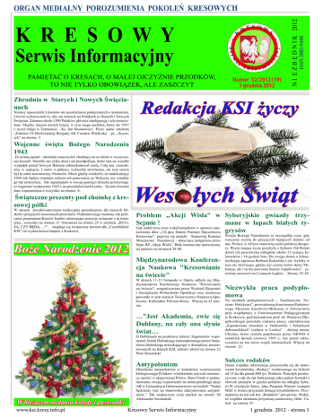 ISSN 2083-9448 K R E S OWY Serwis Informacyjny PAMIĘTAĆ O KRESACH, O MAŁEJ OJCZYŹNIE PRZODKÓW, TO NIE TYLKO OBOWIĄZEK, ALE ZASZCZYT Zbrodnia w Starych i Nowych Święcianach Niemcy upoważnili Litwinów do rozstrzelania podejrzanych o komunizm. Litwini wykorzystali to, aby się zemścić na Polakach ze Starych i Nowych Święcian. Zebrano około 1500 Polaków głównie inteligencję i ich rozstrzelano. Między innymi dwóch księży w tym mego prefekta, który do 1937 r. uczył religii w Turmoncie – Ks. Jan Naumowicz. Pisze autor artykułu „Żołnierz 24 Dryświackiej Brygady AK Czesław Wieliczko – ps. „Scyzoryk” na stronie 3. N I E Z B Ę D N I K 2012 ORGAN MEDIALNY POROZUMIENIA POKOLEŃ KRESOWYCH Numer 12/2012 (19) 1 grudnia 2012 Redakcja KSI życzy Wojenne święta Bożego Narodzenia 1943 Za ścianą sąsiad – ukraiński nauczyciel, chodzący na co dzień w wyszywanej koszuli. Dzieliły nas tylko drzwi od przedpokoju, które tata na wszelki wypadek przed Nowym Rokiem zabarykadował szafą. Całą noc czuwaliśmy w napięciu. I znów o północy wybuchła strzelanina, ale tym razem był to salut noworoczny Niemców. Może gdyby wiedzieli, że nadchodzący 1944 rok będzie ostatnim rokiem ich panowania na Wołyniu, nie witaliby go tak uroczyście. Tak zapamiętało w swojej pamięci dziecko przeżywające tragiczne wydarzenia 1943 r. na przedmieściach Łucka . Są tam również inne wspomnienia a wszystko na stronie 6. Świąteczne prezenty pod choinkę z kresowej półki W okresie przedświątecznym tradycyjnie poszukujemy dla naszych bliskich i przyjaciół stosownych prezentów. Podsumowując miniony rok polecamy pasjonatom Kresów bardzo interesujące pozycje związane z tą tematyką , wszystko na stronie 15. Natomiast na stronie 25 w artykule „BYLI, SĄ. CZY BĘDĄ….?”, znajduje się świąteczny prezent dla „Czytelników KSI” od wydawnictwa Impuls z Krakowa. Boże Narodzenie 2012 Wes łych Świąt Problem „Akcji Wisła” w Syberyjskie gwiazdy trzySejmie ! mane w łapach białych tyGdy nadal trwa cisza wokół projektów w sprawie ustanowienia dnia „11Lipca Dniem Pamięci Męczeństwa grysów Kresowian”, pojawia się projekt -Sejmowej Komisji Mniejszości Narodowej – dotyczący potępienia przez Sejm RP „Akcji Wisła”. Blok tematyczny poświęcony tej sprawie na stronach 28-40. Międzynarodowa Konferencja Naukowa "Kresowianie na świecie" W dniach 11-13 listopada w Opolu odbyła się Międzynarodowa Konferencja Naukowa "Kresowianie na świecie", zorganizowana przez Wydział Ekonomii i Zarządzania Politechniki Opolskiej oraz niedawno powstałe w tym mieście Towarzystwo Naukowo-Społeczno- Kulturalne Polonia-Kresy. Więcej na 41 stronie. …”Jest Akademia, zwie się Dublany, na cały ona słynie świat… O Dublanach na podstawie lektury fragmentów wspomnień Józefa Dubiskiego (udostępnionego przez Stanisława Dubiskiego mieszkającego w Kanadzie), prezentowanych na łamach KSI, zebrał i ułożył na stronie 12 Piotr Strzetelski Antypolonizm W bieżącym wydaniu kolędy i pastorałki www.ksi.kresy.info.pl Określenia antypolonizm w kontekście wyniszczenia biologicznego Polaków wielokrotnie używali niemieccy naziści w okupowanej Polsce. Hans Frank w podsumowaniu swojej wypowiedzi na temat przebiegu akcji AB w Generalnym Gubernatorstwie stwierdził: "Nadal będziemy stać na stanowisku zdecydowanie antypolskim.." Tak rozpoczyna swój artykuł na stronie 20 Aleksander Szumański Kresowy Serwis Informacyjny Święta Bożego Narodzenia to szczególny czas, gdy wracamy myślą do przyjaciół będących daleko od nas. Polacy w Afryce stanowią cześć polskiej diaspory. Wielu ratując życie przybyło z Syberii. Od Polski dzieli ich powietrzna odległość około 12 tysięcy kilometrów i 16 godzin lotu. Do swego domu a Johannesburgu zaprasza Barbara Kukulska i nie byłoby w tym nic dziwnego, gdyby nie czarny kolor skóry Mikołaja, ale i to nie powinno budzić wątpliwości! – jesteśmy przecież na Czarnym Lądzie. - Strony 55-56 Niezwykła praca podyplomowa Na studiach podyplomowych „ Totalitaryzm- Nazizm- Holokaust”, prowadzonych na terenie Państwowego Muzeum Auschwitz-Birkenau w Oświęcimiu przy współpracy z Uniwersytetem Pedagogicznym w Krakowie, pod kierunkiem prof. dr. Wacława Długoborskiego powstała ciekawa praca, zatytułowana „Zapomniana zbrodnia w Dobromilu i Solankach dobromilskich” (salinie w Lacku)” – dzisiaj tereny Ukrainy, która została popełniona przez NKWD w ostatnich dniach czerwca 1941 r., tuż przed wkroczeniem na ten teren wojsk niemieckich. Więcej na stronie 22. Sukces rodaków Nasza wspólna interwencja, przyczyniła się do uratowania kwartalnika „Rodacy” wydawanego na Syberii od 15 lat dla ponad 400 tyś. Polaków. Periodyk przekazywany z rąk do rąk funkcjonuje jako jedyny kontakt z słowem pisanym w języku polskim na odległej Syberii.W rezultacie burzy, jaką Program Pomost rozpętał MSZ w końcu przyznało dotację kwartalnikowi. Przynajmniej na ten rok byt „Rodaków” jest pewny. Widać, że wspólne działania przynoszą zamierzony efekt. Całość na stronie 53 1 grudnia 2012 - strona 1 HISTORIA - WSPOMNIENIA - RELACJE Grudniowa kartka z kalendarza Samoobrony Kresowej Bogusław Szarwiło Samoobrony kresowe to polskie ochotnicze formacje wojskowe istniejące na przełomie lat 1918 i 1919 na północno-wschodnich obszarach przyszłego odrodzonego Państwa Polskiego. W ich skład wchodziły: Samoobrona Wileńska, Samoobrona Grodzieńska i Samoobrona Mińska, powstałe niezależnie od siebie. Samoobrony powstawały spontanicznie od jesieni 1918 na terenach Wileńszczyzny, Grodzieńszczyzny i Mińszczyzny w celu powrotu tych obszarów do Państwa Polskiego. Jak mawia przysłowie, historia lubi się powtarzać , na tych samych terenach w czasach II wojny światowej i po jej zakończeniu, Polacy ponownie zostali zmuszeni do tworzenia samoobrony. Okazało się, że nie tylko