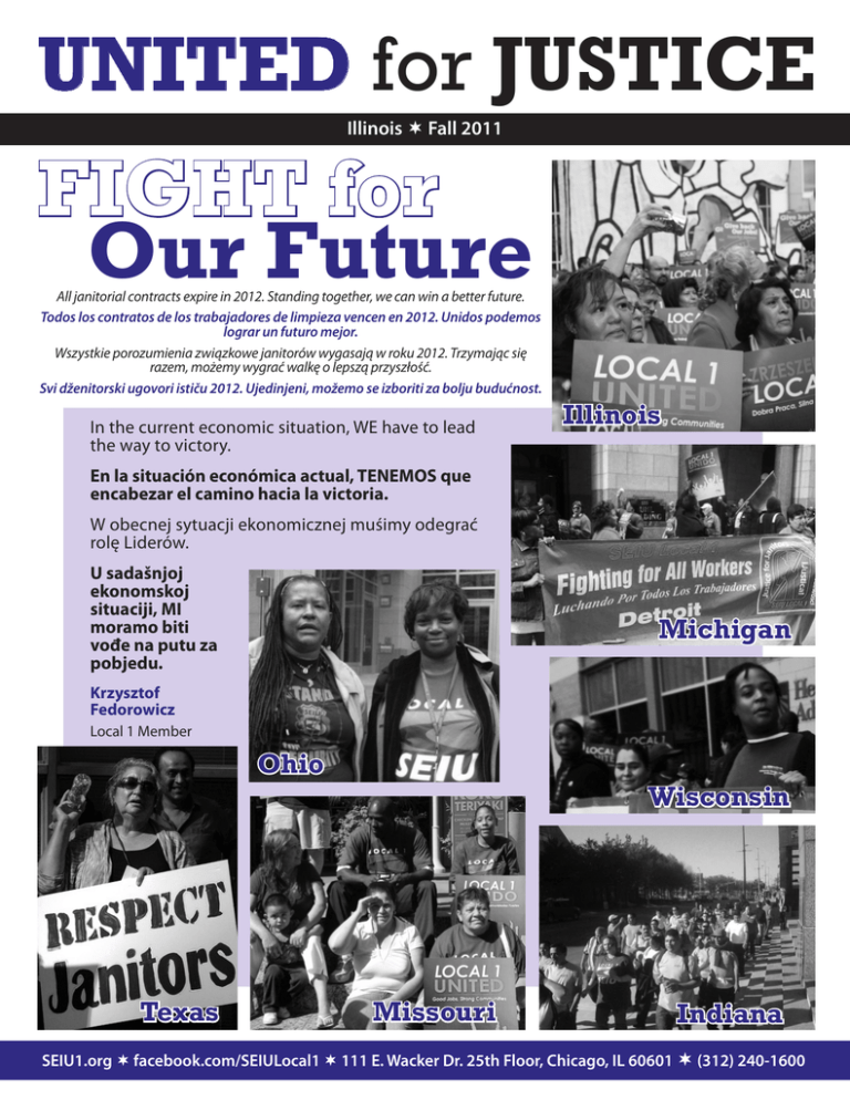 UNITED for JUSTICE Illinois Fall 2011 FIGHT for Our Future All janitorial contracts expire in 2012. Standing together, we can win a better future. Todos los contratos de los trabajadores de limpieza vencen en 2012. Unidos podemos lograr un futuro mejor. Wszystkie porozumienia związkowe janitorów wygasają w roku 2012. Trzymając się razem, możemy wygrać walkę o lepszą przyszłość. Svi dženitorski ugovori ističu 2012. Ujedinjeni, možemo se izboriti za bolju budućnost. In the current economic situation, WE have to lead the way to victory. Illinois En la situación económica actual, TENEMOS que encabezar el camino hacia la victoria. W obecnej sytuacji ekonomicznej muśimy odegrać rolę Liderów. U sadašnjoj ekonomskoj situaciji, MI moramo biti vođe na putu za pobjedu. Michigan Krzysztof Fedorowicz Local 1 Member Ohio Texas Wisconsin Missouri Indiana SEIU1.org facebook.com/SEIULocal1 111 E. Wacker Dr. 25th Floor, Chicago, IL 60601 (312) 240-1600 UNITED for JUSTICE The 99% is Uniting Middle class Americans— the 99%—are occupying Contract cities across the country Expirations from New York to our own Chicago Local 1 cities. They are April 8 fed up with corporations making record profits at Cleveland the expense of our families, April 30 our communities, and our Houston future. May 31 Only when working people join together Indianapolis can we restore balance and fairness to our May 31 economy. And that starts with making sure Toledo working people have a voice and a seat at July 14 the table again. Milwaukee Our janitorial contracts expire in all seven July 31 Local 1 states in 2012. On September 28, Detroit Local 1 members rallied alongside workers July 31 across the country to kick off our 2012 contract campaign. We spoke out for a fair Cincinnati economy and good jobs with fair wages October 1 and quality affordable healthcare – not just Kansas City for ourselves, but for all workers. October 30 Brothers and Sisters, we have a lot of work Columbus to do next year. Now is the time to fight for December 1 a strong contract and for the 99% to hold St. Louis the banks and big corporations who have December 31 ravaged our cities accountable. In Solidarity, Tom Balanoff SEIU Local 1 President FIRED UP & READY TO GO Our economy isn’t working for working families. This fall and winter, Local 1 members in the SEIU Leadership Brigade program are visiting worksites, challenging fellow members to lead the way to a better America. We need to spread the word to our coworkers about who broke the economy – it wasn’t working families! Local 1 leaders are stepping up to make change and fight for good jobs. Learn how to be a leader and help create a fair economy: call the MRC at (877) 233-8880 to get started today. I’m doing my best to be a good leader, to enforce my rights and those of my coworkers. Jorge O. Santos Illinois Brigade Member I want all members to participate and get more involved so we can have a stronger union. As members united, we can build a better future for our families. Griselda Paz Illinois Brigade Member Brigade members in Chicago: Krzysztof Fedorowicz, Urszula Przybys, Mildred Rueda & Hugo Novales Our Union at Work Our SEIU Local 1 contracts protect us from being treated unfairly or fired without good reason. They also protect us from discrimination and favoritism. When members speak out and work with Member Resource and Grievance Representatives, we can win cases against irresponsible employers for violating contracts, work rules or labor laws. Members won more than $858,000 in wages and benefits so far this year by fighting for back wages, vacation pay, overtime, and prevention of job loss and suspensions. In Illinois, a Chicago security company was not paying employees the wage required by our contract. Local 1 prevailed in an arbitration process and members got the wages they were owed. More than $148,000 was put back into Local 1 members’ pockets on October 15. Illinois Fall 2011 Landslide Victory for ALL Workers! All over the nation, firefighters, teachers, nurses, bus drivers, bridge inspectors and social workers are cheering because in Ohio, the middle class just won big. On Election Day, about 2.1 million people voted NO on Issue 2 and repealed Gov. Kasich’s anti-worker Senate Bill 5. By using their citizens’ veto, Ohioans said loud and clear: working families are not punching bags. We did not cause the economic problems in Ohio and you can’t pick our pockets to fix them. Tell Your Alderman: Chicago Needs Good Jobs & Quality Services Dwight McKissack Remembering A Local 1 Leader Dwight McKissack, a dedicated Local 1 member since December 9, 1990, passed away this September. Dwight was a union steward at Chicago Public Schools and an Executive Board member. He was very active in Local 1, helping other workers form a union and campaigning for elected officials and issues he believed in. Whenever Dwight was asked to get involved, his response was always: “I’ll be there. Fired up.” Dwight made Local 1 a better, stronger union. “I’ll be there. Fired up.” 600+ Security Officers Win Better Wages & Benefits Local 1 members Jamelle Hayes and Frank Hines with 19th Ward Alderman Matt O’Shea Thousands of Local 1 members clean and secure facilities for the City of Chicago. Since early September, Chicago members have been organizing support for the Responsible Bidder in Services Contracts Ordinance. This ordinance would establish standards for companies bidding for janitorial, security and window washing contracts with the City so that only responsible companies that pay fair wages and benefits are awarded work. The ordinance was introduced to the City Council on September 8, 2011 with the support of 31 aldermen. To participate in a meeting with your alderman, please contact your Union Representative or Daisy Návar at 312-233-8767. • Exelon Nuclear LaSalle Station ratified a new 3-year agreement which includes a 16% wage increase over 