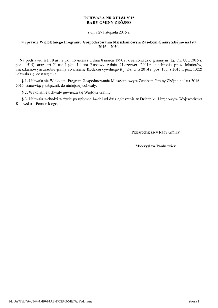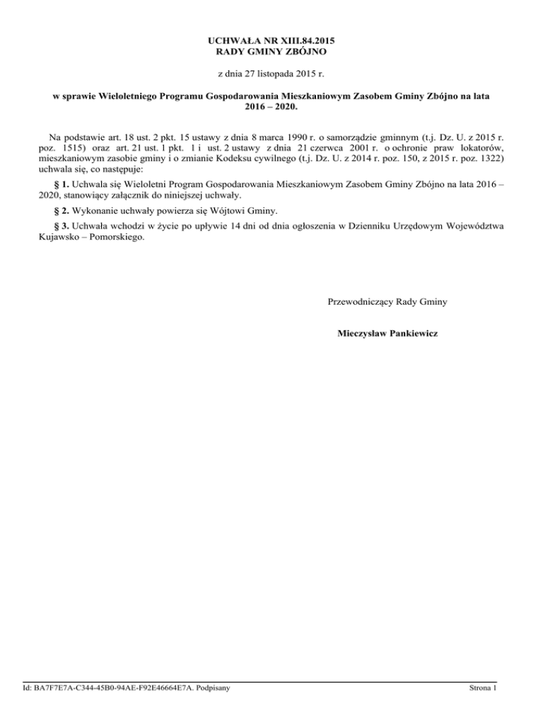 UCHWAŁA NR XIII.84.2015 RADY GMINY ZBÓJNO z dnia 27 listopada 2015 r. w sprawie Wieloletniego Programu Gospodarowania Mieszkaniowym Zasobem Gminy Zbójno na lata 2016 – 2020. Na podstawie art. 18 ust. 2 pkt. 15 ustawy z dnia 8 marca 1990 r. o samorządzie gminnym (t.j. Dz. U. z 2015 r. poz. 1515) oraz art. 21 ust. 1 pkt. 1 i ust. 2 ustawy z dnia 21 czerwca 2001 r. o ochronie praw lokatorów, mieszkaniowym zasobie gminy i o zmianie Kodeksu cywilnego (t.j. Dz. U. z 2014 r. poz. 150, z 2015 r. poz. 1322) uchwala się, co następuje: § 1. Uchwala się Wieloletni Program Gospodarowania Mieszkaniowym Zasobem Gminy Zbójno na lata 2016 – 2020, stanowiący załącznik do niniejszej uchwały. § 2. Wykonanie uchwały powierza się Wójtowi Gminy. § 3. Uchwała wchodzi w życie po upływie 14 dni od dnia ogłoszenia w Dzienniku Urzędowym Województwa Kujawsko – Pomorskiego. Przewodniczący Rady Gminy Mieczysław Pankiewicz Id: BA7F7E7A-C344-45B0-94AE-F92E46664E7A. Podpisany Strona 1 Załącznik do Uchwały Nr XIII.84.2015 Rady Gminy Zbójno z dnia 27 listopada 2015 r. Wieloletni Program Gospodarowania Mieszkaniowym Zasobem Gminy Zbójno na lata 2016 – 2020. Rozdział 1. Postanowienia ogólne § 1. Głównym celem Wieloletniego Programu Gospodarowania Mieszkaniowym Zasobem Gminy Zbójno na lata 2016 – 2020, zwanego dalej „Programem”, jest dążenie do racjonalnego i efektywnego gospodarowania posiadanym zasobem mieszkaniowym poprzez utrzymanie zasobu na dobrym poziomie technicznym, zaspakajanie niezbędnych potrzeb mieszkaniowym oraz tworzenie warunków do poprawy sytuacji mieszkaniowej mieszkańców. § 2. Program swoim zakresem obejmuje: 1) prognozę wielkości oraz stanu technicznego zasobu gminy, 2) analizę potrzeb remontowych i modernizacji, 3) planowaną sprzedaż lokali, 4) zasady polityki czynszowej, 5) sposób zarządzania mieszkaniowym zasobem gminy, 6) źródła finansowania gospodarki mieszkaniowej, 7) wysokość wydatków na utrzymanie zasobów, w tym wydatków inwestycyjnych, 8) opis innych działań mających na celu racjonalizację gospodarowania mieszkaniowym zasobem gminy. § 3. 1. Lokale stanowiące mieszkaniowy zasób gminy mogą być wynajmowane na czas nieoznaczony osobom pozostającym w trudnych warunkach mieszkaniowych i osiągających średni miesięczny dochód w przeliczeniu na jednego członka gospodarstwa domowego, liczonych z trzech miesięcy bezpośrednio poprzedzających miesiąc, w którym składany jest wniosek, nie wyższy niż: 1) 100% najniższej emerytury w gospodarstwie wieloosobowym, 2) 150% najniższej emerytury w gospodarstwie jednoosobowym. 2. Za dochód, o którym mowa w ust. 1, uważa się dochód określony przepisami ustawy z dnia 21 czerwca 2001 r. o dodatkach mieszkaniowych. Rozdział 2. Prognoza wielkości oraz stan techniczny zasobu gminy § 4. 1. Zasób mieszkaniowy Gminy Zbójno wg stanu na dzień 31.10.2015 r. obejmuje 23 lokale mieszkalne w 7 budynkach, położonych w miejscowościach: Klonowo, Sitno, Wielgie i Zbójno. 2. Obecnie w mieszkaniowym zasobie gminy nie ma lokali wynajmowanych jako lokale socjalne. 3. W latach 2016 – 2020 nie przewiduje się powiększenia mieszkaniowego zasobu gminy poprzez budowę nowych mieszkań. 4. Pozyskiwanie lokali socjalnych będzie następowało poprzez adaptację pomieszczeń o innym przeznaczeniu, będących własnością gminy, na cele mieszkaniowe. 5. Stan techniczny mieszkaniowego zasobu gminy określa się na bazie wyposażenia lokalu mieszkalnego w centralne ogrzewanie, urządzenia wodociągowo – kanalizacyjne oraz łazienkę. 6. Strukturę lokali oraz stanu technicznego mieszkaniowego zasobu gminy określa tabela poniżej. Lp. Adres Liczba lokali Stan techniczny Id: BA7F7E7A-C344-45B0-94AE-F92E46664E7A. Podpisany Wyposażenie techniczne lokali Strona 1 1. 2. 3. 4. 5. 6. 7. budynku mieszkalnych budynku Instalacja wodociągowa Instalacja kanalizacyjna z zbiorniki sieci bezodpływowe tak nie tak Instalacja centralnego ogrzewania Zbójno 35 Zbójno 156 (pałac) Zbójno 156 (oficyna) Zbójno 158 Klonowo 61 Sitno 75 Wielgie 73A 1 5 zadowalający niezadowalający tak tak 4 zadawalający tak tak - nie 3 4 4 2 zadowalający niezadowalający zadowalający zadowalający tak tak tak tak tak nie nie tak tak tak - tak nie nie nie nie nie Rozdział 3. Analiza potrzeb remontowych i modernizacji § 5. Realizacja remontów i modernizacja zasobu mieszkaniowego gminy ma na celu utrzymanie zasobu w stanie niepogorszonym. § 6. Podstawę planów remontów i modernizacji stanowią: 1) wyniki okresowych kontroli stanu technicznego budynków, 2) niezbędne remonty w lokalach zajmowanych przez najemców. § 7. Realizacja planów remontów i modernizacji w poszczególnych latach uzależniona będzie od posiadanych środków finansowych w danym roku budżetowym. Rozdział 4. Planowana sprzedaż lokali § 8. W latach 2016 – 2020 planuje się sprzedaż lokali mieszkalnych pochodzących z mieszkaniowego zasobu gminy. § 9. Przewiduje się, że sprzedaż lokali mieszkalnych z zasobu mieszkaniowego gminy następować będzie na wniosek najemcy bądź z inicjatywy gminy, po spełnieniu warunków wynikających z przyjętych zasad sprzedaży. Rozdział 5. Zasady polityki czynszowej § 10. Stawki czynszu w mieszkaniowym zasobie gminy zróżnicowane są ze względu na położenie oraz wyposażenie lokalu w urządzenia techniczne, instalacje i ich stan, a także ogólny stan techniczny budynku lub lokalu. § 11. Podwyżka stawek czynszu za lokale mieszkalne i socjalne wprowadzana będzie każdorazowo Zarządzeniem Wójta Gminy Zbójno. § 12. 1. Stawka bazowa czynszu za 1 m2 powierzchni użytkowej lokali mieszkalnych stanowiących mieszkaniowy zasób gminy ustalana jest z uwzględnieniem określonych niniejszym programem czynników podwyższających lub obniżających wartość użytkową lokalu. 2. Przyjmuje się następujące czynniki podwyższające i obniżające stawkę bazową czynszu, o której mowa w ust.