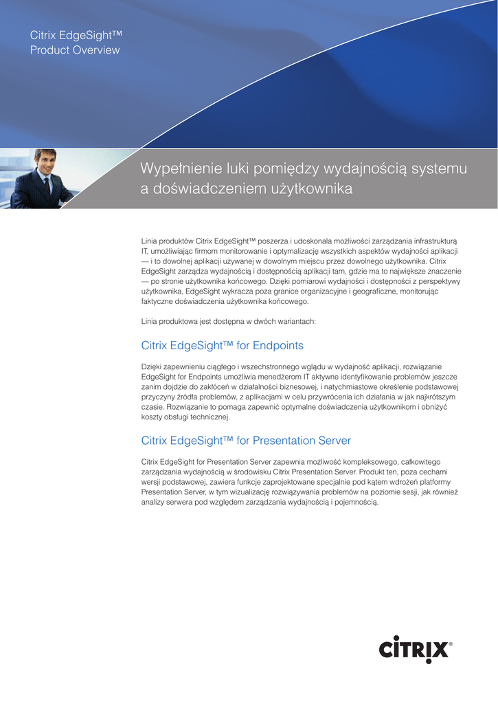 Citrix EdgeSight™ Product Overview Wypełnienie luki pomiędzy wydajnością systemu a doświadczeniem użytkownika Linia produktów Citrix EdgeSight™ poszerza i udoskonala możliwości zarządzania infrastrukturą IT, umożliwiając firmom monitorowanie i optymalizację wszystkich aspektów wydajności aplikacji — i to dowolnej aplikacji używanej w dowolnym miejscu przez dowolnego użytkownika. Citrix EdgeSight zarządza wydajnością i dostępnością aplikacji tam, gdzie ma to największe znaczenie — po stronie użytkownika końcowego. Dzięki pomiarowi wydajności i dostępności z perspektywy użytkownika, EdgeSight wykracza poza granice organizacyjne i geograficzne, monitorując faktyczne doświadczenia użytkownika końcowego. Linia produktowa jest dostępna w dwóch wariantach: Citrix EdgeSight™ for Endpoints Dzięki zapewnieniu ciągłego i wszechstronnego wglądu w wydajność aplikacji, rozwiązanie EdgeSight for Endpoints umożliwia menedżerom IT aktywne identyfikowanie problemów jeszcze zanim dojdzie do zakłóceń w działalności biznesowej, i natychmiastowe określenie podstawowej przyczyny źródła problemów, z aplikacjami w celu przywrócenia ich działania w jak najkrótszym czasie. Rozwiązanie to pomaga zapewnić optymalne doświadczenia użytkownikom i obniżyć koszty obsługi technicznej. Citrix EdgeSight™ for Presentation Server Citrix EdgeSight for Presentation Server zapewnia możliwość kompleksowego, całkowitego zarządzania wydajnością w środowisku Citrix Presentation Server. Produkt ten, poza cechami wersji podstawowej, zawiera funkcje zaprojektowane specjalnie pod kątem wdrożeń platformy Presentation Server, w tym wizualizację rozwiązywania problemów na poziomie sesji, jak również analizy serwera pod względem zarządzania wydajnością i pojemnością. Citrix EdgeSight Najdogodniejszy punkt obserwacyjny Każda organizacja działająca w branży IT ma ten sam cel: maksymalizacja zysku firmy poprzez umożliwienie użytkownikom biznesowym jak najszybszej i najwydajniejszej pracy. By osiągnąć ten cel, efektywna strategia zarządzania usługami IT musi zapewnić niezawodność i odpowiednią wydajność zdalnego korzystania z aplikacji ich użytkownikom. Dzięki przekazywaniu informacji w czasie rzeczywistym i zapewnieniu widoczności zarówno wszerz, jak i w głąb, EdgeSight przewyższa tradycyjne narzędzia zarządzania urządzeniami i sieciami, pozwalając uchwycić całe spektrum wydajności zasobów IT z perspektywy użytkownika końcowego. To kompleksowe spojrzenie pozwala pracownikom IT szybko diagnozować, identyfikować źródła, izolować i rozwiązywać problemy, jak również uzyskać maksymalną wydajność i dostępność dla całego przedsiębiorstwa. Korzyści Aktywne zarządzanie wydajnością Nasz dogłębny wgląd w doświadczenie użytkownika końcowego pozwala aktywnie reagować na problemy z wydajnością, identyfikować je i rozwiązywać, zanim zdążą zakłócić działalność biznesową. Dzięki temu organizacje IT są w stanie ciągle zwiększać dostępność aplikacji i usług oraz obniżać koszty eksploatacji poprzez szybkie rozwiązywanie problemów. Przyspieszenie i usprawnienie obsługi technicznej EdgeSight udostępnia dane i wyniki analiz potrzebne do sprawniejszego i skuteczniejszego rozwiązywania problemów. Wiedza o przyczynach, lokalizacji i istocie problemów z wydajnością aplikacji pozwala szybciej przywracać sprawność ich działania po stronie użytkownika i minimalizować ilość koniecznych do tego zasobów IT. Poprawa doświadczeń użytkownika końcowego EdgeSight zapewnia niczym niezmącony obraz realizowanych usług, poprzez udostępnianie danych na temat faktycznej wydajności z perspektywy użytkownika końcowego, czyniąc z jego doświadczeń sprawę priorytetową. Dzięki temu dział IT może zająć się tym, co najważniejsze: zmniejszaniem kosztów obsługi technicznej, usprawnianiem działalności biznesowej i podnoszeniem poziomu satysfakcji klienta. Usprawnienie zdalnego korzystania z aplikacji EdgeSight ocenia w spójny sposób wydajność aplikacji, niezależnie od metody zdalnego korzystania z aplikacji (serwer/klient, webowych, desktopowych) ani ich pochodzenia (od innych producentów, własne). Obiektywne, ciągłe i niezawodne monitorowanie umożliwia całościowe i wszechstronne zarządzanie aplikacjami i pomaga zoptymalizować realizację usług. Mądre planowanie EdgeSight zapewnia dane potrzebne do podejmowania właściwych decyzji dotyczących licencji oprogramowania, modernizacji i wymiany sprzętu w zasobach użytkowników końcowych. Obserwując dane o faktycznym czasie wykonania poszczególnych aplikacji, organizacje mogą w sposób strategiczny zarządzać licencjami oprogramowania i obniżać koszty, zastępując lub ponownie wdrażając systemy w oparciu o rzeczywiste potrzeby i priorytety. 2 Citrix EdgeSight Niski profil. Duży wpływ. Citrix EdgeSight został od początku zaprojektowany jako odpowiedź na wyzwania związane z zarządzaniem wydajnością w rozległych, złożonych, heterogenicznych i rozproszonych środowiskach. Zgłoszona przez nas do opatentowania technologia rozproszonego przetwarzania danych zapewnia niespotykaną dotąd skalowalność przedsiębiorstwa, umożliwiając gromadzenie i analizę ogromnych ilości szczegółowych danych, bez uszczerbku dla wydajności na maszynie użytkownika. Architektura Agent EdgeSight Agent EdgeSight został zaprojektowny z myślą o pracy w środowisku graficznym – automatycznie monitoruje działanie każdej aplikacji, bez żadnych wymogów związanych z konfiguracją czy oprzyrządowaniem. Działa nieprzerwanie w systemie użytkownika końcowego, zbierając dane o wydajności wszystkich aplikacji i procesów. Dane o wydajności gromadzone są w pamięci lokalnej oraz kompilowane i wysyłane na serwer w określonych odstępach czasu, co eliminuje niepotrzebne obciążenie sieci i umoż