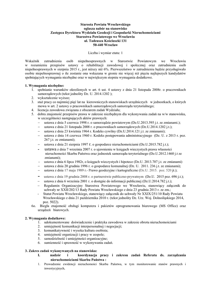 Starosta Powiatu Wrocławskiego ogłasza nabór na stanowisko Zastępca Dyrektora Wydziału Geodezji i Gospodarki Nieruchomościami Starostwa Powiatowego we Wrocławiu ul. Tadeusza Kościuszki 131 50-440 Wrocław Liczba i wymiar etatu: 1 Wskaźnik zatrudnienia osób niepełnosprawnych w Starostwie Powiatowym we Wrocławiu w rozumieniu przepisów ustawy o rehabilitacji zawodowej i społecznej oraz zatrudnieniu osób niepełnosprawnych w sierpnia 2015 r., jest niższy niż 6%. Pierwszeństwo w zatrudnieniu będzie przysługiwało osobie niepełnosprawnej o ile zostanie ona wskazana w gronie nie więcej niż pięciu najlepszych kandydatów spełniających wymagania niezbędne oraz w największym stopniu wymagania dodatkowe. 1. Wymagania niezbędne: 1. spełnianie warunków określonych w art. 6 ust. 4 ustawy z dnia 21 listopada 2008r. o pracownikach samorządowych (tekst jednolity Dz. U. 2014.1202 ); 2. wykształcenie wyższe; 3. staż pracy co najmniej pięć lat na kierowniczych stanowiskach urzędniczych w jednostkach, o których mowa w art. 2 ustawy o pracownikach samorządowych samorządu terytorialnego; 4. licencja zawodowa związana z obszarem zadań Wydziału; 5. dobra znajomość przepisów prawa w zakresie niezbędnym dla wykonywania zadań na w/w stanowisku, w szczególności następujących aktów prawnych: − ustawa z dnia 5 czerwca 1998 r. o samorządzie powiatowym (Dz.U.2013.595 j.t. ze zmianami.); − ustawa z dnia 21 listopada 2008 r. o pracownikach samorządowych (Dz.U.2014.1202 j.t.); − ustawa z dnia 23 kwietnia 1964 r. Kodeks cywilny (Dz.U.2014.121 j.t. ze zmianami); − ustawa z dnia 14 czerwca 1960 r. Kodeks postępowania administracyjnego (Dz. U. z 2013 r. poz. 267 j.t. ze zmianami); − ustawa z dnia 21 sierpnia 1997 r. o gospodarce nieruchomościami (Dz.U.2015.782 j.t.); - ustawa z dnia 7 września 2007 r. o ujawnieniu w księgach wieczystych prawa własności nieruchomości Skarbu Państwa oraz jednostek samorządu terytorialnego (Dz.U.2012.1460 j.t ze zmianami); - ustawa z dnia 6 lipca 1982r, o księgach wieczystych i hipotece (Dz.U. 2013.707 j.t. ze zmianami) − ustawa z dnia 20 grudnia 1996 r. o gospodarce komunalnej (Dz. U. 2011. 236 j.t. ze zmianami); − ustawa z dnia 17 maja 1989 r.- Prawo geodezyjne i kartograficzne (Dz.U. 2015. poz. 520 jt.); - ustawa z dnia 19 grudnia 2008 r. o partnerstwie publiczno-prywatnym (Dz.U. 2015 poz. 696 j.t.); ustawa z dnia 6 września 2001 r. o dostępie do informacji publicznej (Dz.U.2014.782 j.t.); Regulamin Organizacyjny Starostwa Powiatowego we Wrocławiu, stanowiący załącznik do uchwały nr XXII/202/13 Rady Powiatu Wrocławskiego z dnia 23 grudnia 2013 r. ze zm.; - Statut Powiatu Wrocławskiego, stanowiący załącznik do uchwały Nr XXIX/251/10 Rady Powiatu Wrocławskiego z dnia 21 października 2010 r. (tekst jednolity Dz. Urz. Woj. Dolnośląskiego 2014, poz. 5022). 6o. Biegła znajomość obsługi komputera i pakietów oprogramowania biurowego (MS Office) oraz urządzeń biurowych. − − 2. Wymagania dodatkowe: 1. udokumentowane doświadczenie i praktyka zawodowa w zakresie obrotu nieruchomościami 2. umiejętność komunikacji interpersonalnej i negocjacji; 3. komunikatywność i wysoka kultura osobista; 4. umiejętność organizacji i pracy w zespole; 5. samodzielność i umiejętności organizacyjne; 6. sumienność i sprawność w wykonywaniu zadań. 3. Zakres zadań wykonywanych na stanowisku: I. nadzór i koordynacja pracy i zakresu zadań Referatu ds. zarządzania nieruchomościami Skarbu Państwa : 1. Prowadzenie ewidencji nieruchomości Skarbu Państwa, w tym monitorowanie stanów prawnych i inwestycyjnych, 2. Nadzór nad nieruchomościami Skarbu Państwa , będącymi przedmiotem umów cywilnoprawnych, 3. Prowadzanie spraw związanych z bieżącym zarządzaniem wskazanymi nieruchomościami, 4. Przygotowanie i realizacja postępowań związanych z obrotem cywilnoprawnym wskazanych nieruchomości, 5. Prowadzenie spraw określonych w ustawie z dnia 17 maja 1989r. – prawo geodezyjne i kartograficzne, 6. Prowadzenie spraw związanych z reformą rolną i osadnictwem na obszarze ziem odzyskanych. II. 1. 2. 3. 4. nadzór i koordynacja pracy i zakresu zadań Referatu ds. inwestycji i zarządzania mieniem Powiatu Wrocławskiego : Przygotowanie i prowadzenie inwestycji i remontów na nieruchomościach, stanowiących własność Powiatu Wrocławskiego, Prowadzanie spraw związanych z bieżącym zarządzaniem wskazanymi nieruchomościami z wyłączeniem nieruchomości będącej siedzibą Starostwa Powiatowego we Wrocławiu przy ul. Kościuszki 131, Nadzór właścicielski nad nieruchomościami oddanymi w trwały zarząd lub w innej formie cywilnoprawnej , Przygotowanie i realizacja postępowań związanych z obrotem cywilnoprawnym wskazanych nieruchomości. 4. Informacja o warunkach pracy na stanowisku: 1. Praca przy komputerze powyżej 4 godzin na dobę, przy oświetleniu częściowo sztucznym, w budynku czterokondygnacyjnym z windą; 2. Praca administracyjno-biurowa często z narażeniem na sytuacje stresujące; 3. Konieczność szybkiego reagowania i podejmowania wiążących decyzji; 4. Wymagana biegła znajomość języka polskiego w mowie i piśmie; 5. Większość czynności jest wykonywana w pozycji siedzącej; 6. Częstotliwość wyjazdów służbowych: okazjonalna. 5. Wymagane dokumenty: 1. kwestionariusz osobowy do pobrania ze strony internetowej Biuletynu Informacji Publicznej Powiatu Wrocławskiego – http://powiatwroclawski.ibip.wroc.pl/public/get_file.php?id=107680; 2. list motywacyjny z podaniem numeru telefonu kontaktowego; 3. kserokopie dokumentów poświadczających wykształcenie, posiadane kwalifikacje lub umiejętności; 4. kserokopie świadectw pracy lub innych dokumentów potwierdzających doświadczenie zawodowe; 5. kopie dokumentów potwierdzających stopień niepełnosprawności (jeśli dotyczy); 6. oświadczenie kandydata o korzystaniu w pełni z praw publicznych oraz o niekaralnoś