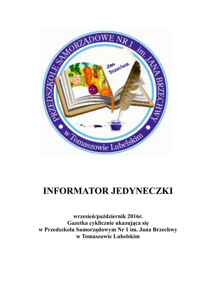 INFORMATOR JEDYNECZKI wrzesień/październik 2016r. Gazetka cyklicznie ukazująca się w Przedszkolu Samorządowym Nr 1 im. Jana Brzechwy w Tomaszowie Lubelskim Za nami oficjalne rozpoczęcie oraz kilka tygodni nowego roku szkolnego 2016/2017r. Dzieci poznały nasze przedszkole, panie w nim pracujące, nowych kolegów, nawiązały nowe przyjaźnie. Zbliża się małymi krokami do nas jesień. A ponieważ pogoda jest sprzyjająca jest to dobry moment na aktywne spędzanie czasu z dziećmi na świeżym powietrzu. Ruch to inwestycja, która procentuje przez całe życie. Ruch jest naturalną potrzebą dziecka, a odpowiednia aktywność ruchowa jest niezbędna dla zapewnienia prawidłowego rozwoju fizycznego, umysłowego, motorycznego i społecznego. Właściwie użyty i dozowany ruch u dzieci łagodzi przebieg procesów rozwojowych, zwiększa odporność fizjologiczną, koryguje wady postawy i kształtuje pozytywne nawyki ruchowe. Nie wszyscy rodzice zdają sobie sprawę z wielkiego zapotrzebowania dzieci na ruch i często nie wiążą nadruchliwości dziecka w domu z brakiem okazji do „wyżycia się” ruchowego w ciągu dnia. Porcja ruchu organizowana dziecku w przedszkolu oraz spacer do i z przedszkola nie wystarczają do zapewnienia prawidłowego rozwoju. Rodzice zamiast przywozić dzieci do przedszkola wózkiem lub samochodem, niech z nimi chodzą i biegają! Należy zachęcać rodziców do organizowania wspólnych zabaw ruchowych z dziećmi, do planowania im aktywności ruchowych, np. na rowerze, rolkach, na basenie, do wyposażenia dziecka we własną piłkę i stworzenie okazji do posługiwania się nią. Aktywność ruchowa ma ogromny wpływ na zdrowie. Organizm człowieka genetycznie zaprogramowany został na aktywny styl życia. Ruch jest biologiczną potrzebą organizmu ludzkiego. Eksperci Światowej Organizacji Zdrowia ONZ określili minimalną, tj. niezbędną dzienną normę ruchu dorosłego człowieka na 10 tys. kroków. Według przeprowadzonych badań aktywności ruchowej nad określeniem ramowych potrzeb ilości ruchu w poszczególnych grupach wieku, określono je w sposób następujący: a) chłopcy - w wieku przedszkolnym – 6 godz. ruchu, - w wieku młodszym szkolnym – 5 godz. 45 min. ruchu, - w wieku starszym szkolnym – 5 godz. ruchu; b) dziewczynki - w wieku przedszkolnym i młodszym szkolnym – 5 godz. 15 min. ruchu, - w wieku średnim szkolnym – 5 godz., - w wieku starszym szkolnym – 4 i pół godz. Aktywność fizyczna jest najlepszym antidotum na wiele dolegliwości związanych z cywilizacją. Wygodny tryb życia, stronienie od rekreacji ruchowej i sportu są najważniejszymi przyczynami nieprawidłowości rozwojowych, wad postawy, nerwic, otyłości, niewydolności mięśniowej, zaparć, cukrzycy, choroby nadciśnieniowej i wielu innych tzw. „chorób cywilizacyjnych”. Ortopedzi ostrzegają, że wśród najmłodszych coraz częściej występują wady postawy: skrzywienie kręgosłupa, koślawe kolana i płaskostopie. Dzieci potrzebują więcej ruchu. Jest on naturalną potrzebą człowieka, która została stłumiona przez złe nawyki cywilizacyjne. Dzieci coraz więcej czasu spędzają przed telewizorem czy komputerem. Każde dziecko musi mieć czas i okazję by biegać, skakać, grać w piłkę, wędrować po lesie, pływać czy wspinać się, gdyż ruch jest niezbędny do prawidłowego rozwoju. Bibliografia: • Białas L., Ruch bramą do nauki, „Bliżej Przedszkola” 2009, nr 5. • Fall-Ławryniuk M., Ciało i umysł lubią ruch, „Bliżej Przedszkola” 2009, nr 6. • Gniewkowski W., Wlaźnik K., Wychowanie fizyczne, WSiP, Warszawa 1990. • Nadachewicz K., Rola nauczyciela w rozwoju ruchowym dziecka, „Wychowanie w przedszkolu” 2009, nr 10. • Pasternak A., Fit, czyli w dobrej formie. Kultura fizyczna przedszkolaka, „Bliżej Przedszkola” 2010, nr 12. SPOSOBY NA NIEJADKA Problemy z niejadkami zna wielu rodziców. Niejadek odmawia jedzenia w ogóle, to znaczy za każdym razem każe się długo prosić, zanim cokolwiek zje lub nie chce jeść, np. warzyw czy mięsa. W obu przypadkach rodzice często starają się wmusić maluchowi, jeśli nie to, co przygotowali to, chociaż „cokolwiek”. Kończy się na tym, że dziecko je głównie niezdrowe produkty, które nie wpływają dobrze na jego rozwój. Nie pomoże przymuszanie do jedzenia nerwowa atmosfera czy krzyki. Pamiętaj, że jako rodzic jesteś odpowiedzialny za to, co dziecko je. Ale to dziecko decyduje o tym, ile zje. KILKA SPOSOBÓW NA NIEJADKA: − Proponuj dziecku jedzenie tylko wtedy, kiedy jest głodne. Maluchy często odmawiają zjedzenia posiłku po prostu dlatego, że nie zdążyły jeszcze zgłodnieć. − Wprowadź stałe pory posiłków, dzieci lubią uregulowany tryb życia. − Zmniejsz liczbę posiłków. Jeśli na drugie śniadanie zamiast kanapki z szynką − − − − − − − − − − − − dziecko dostanie jabłko albo pomarańczę, może obiad zje z większym apetytem. Ogranicz przekąski między posiłkami. Dbaj o różnorodność potraw. Postaraj się, by posiłki wyglądały na talerzu kolorowo i apetycznie. Przy zielonym groszku świetnie wygląda biała cykoria albo czerwone pomidory, przy białym kalafiorze - pomarańczowa surówka z marchewki albo zielona sałata itd. Inny pomysł to kolorowe sałatki z warzyw (żółta kukurydza, pomarańczowa marchewka, czerwona papryka, fioletowa fasola, zielony groszek, białe ziemniaki) lub owoców (czerwone truskawki, białe jabłko, pomarańczowe mandarynki, zielone kiwi). A na kanapkach? Pokrojona w krążki rzodkiewka posypana szczypiorkiem, jajecznica z drobinkami czerwonej papryki, szynka ozdobiona plasterkiem pomidora wyglądają naprawdę apetycznie. Pozwól dziecku dokonywać wyborów. Zanim zabierzesz się do przygotowywania posiłku, zapytaj: "Chcesz kanapkę z szynką czy twarożkiem? Wolisz jogurt z jagodami czy truskawkami, a może koktajl bananowy?”. Jeśli nic nie wybierze, to tr