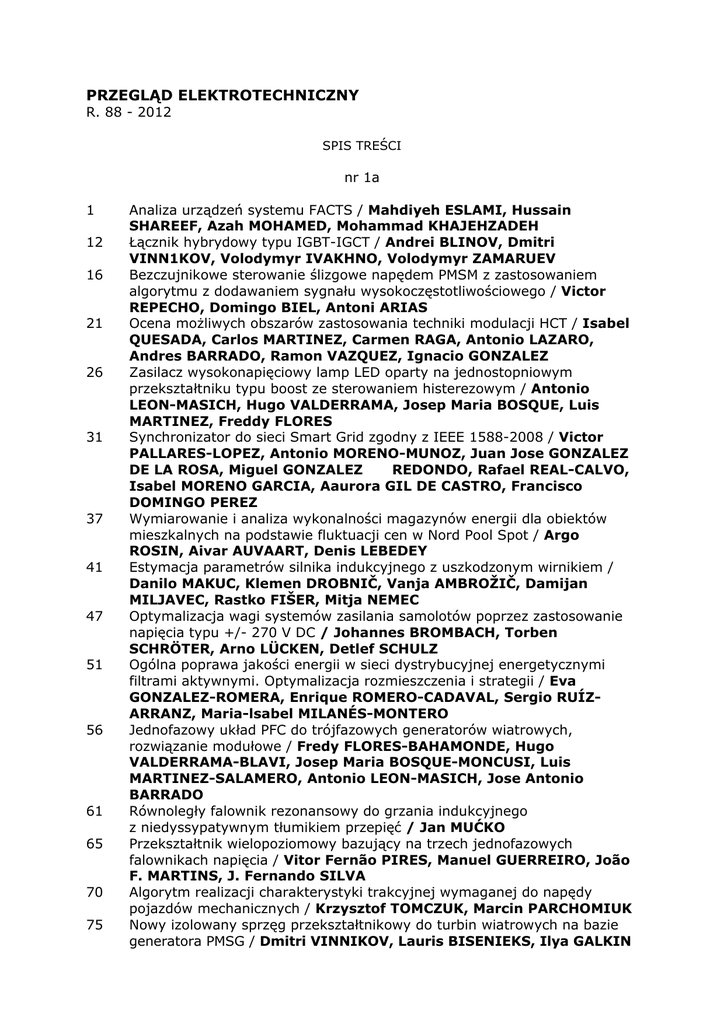 PRZEGLĄD ELEKTROTECHNICZNY R. 88 - 2012 SPIS TREŚCI nr 1a 1 12 16 21 26 31 37 41 47 51 56 61 65 70 75 Analiza urządzeń systemu FACTS / Mahdiyeh ESLAMI, Hussain SHAREEF, Azah MOHAMED, Mohammad KHAJEHZADEH Łącznik hybrydowy typu IGBT-IGCT / Andrei BLINOV, Dmitri VINN1KOV, Volodymyr IVAKHNO, Volodymyr ZAMARUEV Bezczujnikowe sterowanie ślizgowe napędem PMSM z zastosowaniem algorytmu z dodawaniem sygnału wysokoczęstotliwościowego / Victor REPECHO, Domingo BIEL, Antoni ARIAS Ocena możliwych obszarów zastosowania techniki modulacji HCT / Isabel QUESADA, Carlos MARTINEZ, Carmen RAGA, Antonio LAZARO, Andres BARRADO, Ramon VAZQUEZ, Ignacio GONZALEZ Zasilacz wysokonapięciowy lamp LED oparty na jednostopniowym przekształtniku typu boost ze sterowaniem histerezowym / Antonio LEON-MASICH, Hugo VALDERRAMA, Josep Maria BOSQUE, Luis MARTINEZ, Freddy FLORES Synchronizator do sieci Smart Grid zgodny z IEEE 1588-2008 / Victor PALLARES-LOPEZ, Antonio MORENO-MUNOZ, Juan Jose GONZALEZ DE LA ROSA, Miguel GONZALEZ REDONDO, Rafael REAL-CALVO, Isabel MORENO GARCIA, Aaurora GIL DE CASTRO, Francisco DOMINGO PEREZ Wymiarowanie i analiza wykonalności magazynów energii dla obiektów mieszkalnych na podstawie fluktuacji cen w Nord Pool Spot / Argo ROSIN, Aivar AUVAART, Denis LEBEDEY Estymacja parametrów silnika indukcyjnego z uszkodzonym wirnikiem / Danilo MAKUC, Klemen DROBNIČ, Vanja AMBROŽIČ, Damijan MILJAVEC, Rastko FIŠER, Mitja NEMEC Optymalizacja wagi systemów zasilania samolotów poprzez zastosowanie napięcia typu +/- 270 V DC / Johannes BROMBACH, Torben SCHRÖTER, Arno LÜCKEN, Detlef SCHULZ Ogólna poprawa jakości energii w sieci dystrybucyjnej energetycznymi filtrami aktywnymi. Optymalizacja rozmieszczenia i strategii / Eva GONZALEZ-ROMERA, Enrique ROMERO-CADAVAL, Sergio RUÍZARRANZ, Maria-lsabel MILANÉS-MONTERO Jednofazowy układ PFC do trójfazowych generatorów wiatrowych, rozwiązanie modułowe / Fredy FLORES-BAHAMONDE, Hugo VALDERRAMA-BLAVI, Josep Maria BOSQUE-MONCUSI, Luis MARTINEZ-SALAMERO, Antonio LEON-MASICH, Jose Antonio BARRADO Równoległy falownik rezonansowy do grzania indukcyjnego z niedyssypatywnym tłumikiem przepięć / Jan MUĆKO Przekształtnik wielopoziomowy bazujący na trzech jednofazowych falownikach napięcia / Vitor Fernão PIRES, Manuel GUERREIRO, João F. MARTINS, J. Fernando SILVA Algorytm realizacji charakterystyki trakcyjnej wymaganej do napędy pojazdów mechanicznych / Krzysztof TOMCZUK, Marcin PARCHOMIUK Nowy izolowany sprzęg przekształtnikowy do turbin wiatrowych na bazie generatora PMSG / Dmitri VINNIKOV, Lauris BISENIEKS, Ilya GALKIN 81 86 91 96 100 104 108 112 117 122 127 132 137 141 146 151 155 159 164 Napięciowy przekształtnik jednofazowy do aplikacji trakcyjnych symulacja i badania / Marcin PARCHOMIUK Przekształtnik tranzystorowy o strukturze wielokomórkowej i sterowaniu łączonym dla mikro zgrzewarki oporowej / Yuriy PAERAND, Oleksandr BONDARENKO, Iuliia BONDARENKO Identyfikacja położenia wirnika silnika z magnesami trwałymi z wykorzystaniem metody zerowego wektora napięcia / Janusz WIŚNIEWSKI, Włodzimierz KOCZARA Rozkład temperatury w trzyfazowym silniku indukcyjnym z ekscentryczną szczeliną powietrzną / Bruno BAPTISTA, André MENDES, Sérgio CRUZ, António CARDOSO Nowy energooszczędny system zasilania lamp fluoroscencyjnych / Andres HONRUBIA, Emilio GOMEZ-LAZARO, Angel MOLINA-GARCIA, Antonio VIGUERAS-RODRIGUEZ, Baldomero GONZALEZ-SANCHEZ Możliwości symulowania łuku elektrycznego w wyłącznikach / Araitz ITURREGI, Esther TORRES, Inmaculada ZAMORA' Garikoitz BUIGUES Diagnozowanie uszkodzeń stojana w silniku indukcyjnym na podstawie analizy chwilowej wartości fazora na płaszczyźnie prądu / Aurelian CRĂCIUNESCU, Gloria CIUMBULEA, Marius MEDIA LMAT.EMF-LMAQT.EMF-ELF_WEBMONIT: system monitoringu pola elektromagnetycznego małej częstotliwości / Carlos Lemos ANTUNES, André CABETE, Daniel SANTOS, Robert SILVA, Nélia RAPOSEIRO Sterowanie optymalną wartością napięcia w sieci dystrybucyjnej farm wiatrowych przy wykorzystaniu funkcji regresji / Elena SÁIZ-MARÍN, Enrique LOBATO Ocena pomocniczych narzędzi monitorowania systemu przesyłu energii w Turcji / Enrique LOBATO, Ignacio EGIDO, Luis ROUCO Usprawnienia interfejsów dla niepełnosprawnych użytkowników / Fernando MOITA, Rúben OLIVEIRA, Victor SANTOS, Marco SILVA Sterowanie napięciem samowzbudnego generatora indukcyjnego przy wykorzystaniu szeregowej kompensacji mocy / Jesús FRAILE-ARDANUY, Jesús FRAILE-MORA, Pedro A. GARCIA-GUTIERREZ Tłumienie ferrorezonansu w transformatorach napięciowych / Victor VALVERDE, Javie MAZÓN, Garikoitz BUIGUES, Inmaculada ZAMORA Sterowanie jednostkami szybkiego startu w systemie AGC / Ignacio EGIDO, Fidel FERNÁNDEZ-BERNAL, Luis ROUCO, Inmaculada SABOYA Szkielet komunikacyjny systemu SAS bazujący na standardzie OMG DDS / Isidro CALVO, Oier GARCIA DE ALBÉNIZ, Federico PÉREZ Modelowanie indukcyjnego dopasowania wymiarów koła w turbinie gazowej / lvo DOLEŽEL, Václav KOTLAN, Bohuš ULRYCH Symulacja pracy urządzeń SAW z wykorzystaniem programu Matlak / Joana C. MENDES, Margarida FERNANDES, Debarati MUKHERJEE, Dinis M. SANTOS Odpowiedź dynamiczna elektrowni wodnej na zmiany obciążenia z uwzględnieniem elastycznych efektów kolumny wodnej / Juan Ignacio PÉREZ-DIAZ, José Román WILHELMI AYZA, Ignacio GALASO BAJO, Jesús FRAILE-ARDANUY, José Angel SÁNCHEZ FERNANDEZ, Olga CASTANEDA CABRERO, Jose Ignacio SARASÚA MORENO Właściwości statyczne nowego rodzaju silnika bezszczotkowego DC z magnesami trwałymi / Lidija PETKOVSKA, Paul W. LEFLEY, Goga CVETKOVSKI 169 173 177 181 184 188 193 198 202 207 212 218 222 225 229 233 238 247 Określanie w czasie rzeczywistym parametrów dławika dołączonego do prądów niesinusoidalnych / Manuel ROMÁN-LUMBRERAS, Guillermo VELASCO-QUESADA, Alfonso CONESA-ROCA, Ramón BARGALLÓPERPIÑA, Felipe JEREZ Analiza sterowania szybkością w siłowniku reluktancyjnym / Luís Miguel PESTANA