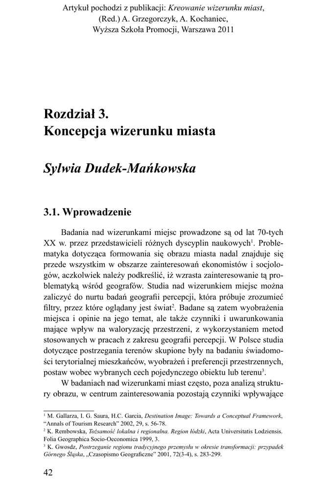 Artykuł pochodzi z publikacji: Kreowanie wizerunku miast, (Red.) A. Grzegorczyk, A. Kochaniec, Wyższa Szkoła Promocji, Warszawa 2011 Rozdział 3. Koncepcja wizerunku miasta Sylwia Dudek-Mańkowska 3.1. Wprowadzenie Badania nad wizerunkami miejsc prowadzone są od lat 70-tych XX w. przez przedstawicieli różnych dyscyplin naukowych1. Problematyka dotycząca formowania się obrazu miasta nadal znajduje się przede wszystkim w obszarze zainteresowań ekonomistów i socjologów, aczkolwiek należy podkreślić, iż wzrasta zainteresowanie tą problematyką wśród geografów. Studia nad wizerunkiem miejsc można zaliczyć do nurtu badań geografii percepcji, która próbuje zrozumieć filtry, przez które oglądany jest świat2. Badane są zatem wyobrażenia miejsca i opinie na jego temat, ale także czynniki i uwarunkowania mające wpływ na waloryzację przestrzeni, z wykorzystaniem metod stosowanych w pracach z zakresu geografii percepcji. W Polsce studia dotyczące postrzegania terenów skupione były na badaniu świadomości terytorialnej mieszkańców, wyobrażeń i preferencji przestrzennych, postaw wobec wybranych cech pojedynczego obiektu lub terenu3. W badaniach nad wizerunkami miast często, poza analizą struktury obrazu, w centrum zainteresowania pozostają czynniki wpływające M. Gallarza, I. G. Saura, H.C. Garcia, Destination Image: Towards a Conceptual Framework, “Annals of Tourism Research” 2002, 29, s. 56-78. 2 K. Rembowska, Tożsamość lokalna i regionalna. Region łódzki, Acta Universitatis Lodziensis. Folia Geographica Socio-Oeconomica 1999, 3. 3 K. Gwosdz, Postrzeganie regionu tradycyjnego przemysłu w okresie transformacji: przypadek Górnego Śląska, „Czasopismo Geograficzne” 2001, 72(3-4), s. 283-299. 1 42 na jego powstawanie. Analizuje się przede wszystkim wpływ cech społeczno-demograficznych jednostki oraz typów wykorzystywanych przez nią źródeł informacji na powstawanie obrazu miejsca. Przedmiotem większości prowadzonych badań są turystyczne wizerunki państw i miast. Od lat 90-tych XX w. wzrasta zainteresowanie studiami nad obrazami miast w świadomości różnych grup społecznych. Szersze zainteresowanie badaniami wizerunków miast w Polsce należy wiązać ze zmianami zachodzącymi w ośrodkach miejskich w ostatnich dziesięcioleciach pod wpływem globalizacji. Miasta upodobniają się do siebie, jednocześnie rywalizując o rozmaite korzyści – pozyskanie nowych osadników, turystów, inwestorów, ale także zabiegają o organizację imprez sportowych, kulturalnych lub rozrywkowych. Coraz częściej władze lokalne przystępują świadomie do budowania przewagi konkurencyjnej, która umożliwi ich miastom dalszy rozwój i wygraną w międzymiejskiej konkurencji. Miasta mogą budować przewagę konkurencyjną w oparciu o dwie grupy zasobów. Pierwszą stanowią zasoby materialne miasta; drugą natomiast zasoby niematerialne, do których zaliczyć można jego wizerunek. Władze lokalne zaczynają zdawać sobie sprawę, że każde miasto posiada pewien wizerunek, na który mogą oddziaływać: jeśli jest on negatywny, można podjąć próbę jego zmiany; jeśli jest mało wyrazisty – wzmocnić go poprzez wybór odpowiednich środków marketingowych. Ponadto wzrost zainteresowania kształtowaniem pozytywnego obrazu ze strony władz wynika ze zrozumienia funkcji, jakie pełni taki wizerunek i korzyści, które może on miastu przynieść − jest więc on ważnym czynnikiem podejmowania decyzji, wpływa na większą rozpoznawalność miasta, przyczynia się także do zwiększonego zainteresowania miastem i budowania zaufania do władz lokalnych. 3.2. Model powstawania wizerunku miasta Zainteresowanie naukowców koncepcją wizerunku pojawiło się już w latach 60-tych XX wieku. Pierwszymi badaczami zajmującymi się tą problematyką byli K. E. Boulding4 i P. Martineau5, którzy w swych pracach zasugerowali, że wyobrażenia mogą mieć większy K. E. Boulding, The Image: Knowledge and Life in Society, Ann Arbor MI, University of Michigan Press, 1956. 5 P. Martineau, The Personality of the Retail Store, “Harvard Business Review” 1958, 36, s. 4755. 4 43 wpływ na zachowanie człowieka, aniżeli obiektywne informacje o postrzeganych przedmiotach lub otoczeniu. Znaczny wzrost zainteresowania tą tematyką rozpoczął się od pracy J. D. Hunta opublikowanej w 1971 roku6. Od lat tego czasu studia o tej tematyce prowadzone były licznie przez przedstawicieli różnych dyscyplin naukowych. W związku z interdyscyplinarnym charakterem badań nad wizerunkiem miejsca, w literaturze spotkać można wiele definicji tego pojęcia (zob. tab. 1.). Według P. L. Pearce’a7, wizerunek jest jednym z tych pojęć, które nie przemijają, jest pojęciem z nieokreślonym i zmiennym znaczeniem. Autorzy najczęściej cytują definicje opracowane przez J. L. Cromptona8 oraz P. Kotlera i H. Baricha9, według których wizerunek jest wyrażeniem określającym sumę wierzeń, idei i wyobrażeń, jakie osoba ma w stosunku do danego miejsca. Podobnie wizerunek definiują F. Lawson i M. Bond-Bovy10. Ich zdaniem na wizerunek składa się wiedza o miejscu, wyobrażenia o nim, uprzedzenia oraz stosunek emocjonalny do niego. Wizerunek powstaje w oparciu o kilka wybranych wrażeń z całej grupy odczuć docierających do człowieka w procesie poznawczym11. Niektórzy badacze ograniczają badania nad wizerunkiem miejsca, analizując jedynie wyobrażenia i opinie na jego temat osób, które w owym miejscu nie przebywają i definiują jego wizerunek jako umysłowe odzwierciedlenie środowiska w świadomości osób, które nigdy danego miejsca nie odwiedziły12. Wielu autorów, definiując wizerunek, sugeruje jego strukturę. A. R. Oxenfeldt13 i E. Dichter14 twierdzili, że wizerunek to suma wyobrażeń, powstającą jako rezultat oceny atrybutów miejsca, które mogą zawierać elementy kognitywne i afektywne. Autorzy ci dostrzegają nie P. C. Fakeye, J. L. Crompt