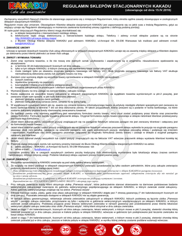 REGULAMIN SKLEPÓW STACJONARNYCH KAKADU (obowiązuje od dnia 15.IV.2016) Zachęcamy wszystkich Naszych klientów do starannego zapoznania się z niniejszym Regulaminem, który określa ogólne zasady obowiązujące w zoologicznych sklepach stacjonarnych KAKADU. Regulamin może ulec zmianom. Obowiązkiem Klientów sklepów stacjonarnych KAKADU jest zapoznawanie się co jakiś czas z treścią Regulaminu, gdyż za wiążący uznaje się Regulamin obowiązujący w momencie zawierania konkretnej umowy (zgodnie z definicją podaną poniżej). W razie pytań dotyczących Regulaminu klienci mogą skontaktować się: a. w sklepie bezpośrednio z kierownictwem każdego sklepu, b. telefonicznie bądź drogą elektroniczną z kierownictwem każdego sklepu. Telefony i adresy e-mail sklepów podane są na stronie http://KAKADU.pl/nasze-sklepy-mapa/ c. z Biurem Obsługi Klienta sklepów KAKADU pod adresem: KAKADU, ul.Annopol 4A, 03-236 Warszawa lub mailowo pod adresem e-mail: [email protected] I. ZAWARCIE UMOWY Umowę w sprawie dowolnych towarów i/lub usług oferowanych w sklepach stacjonarnych KAKADU uznaje się za zawartą między sklepem a Klientem dopiero po dokonaniu przez klienta płatności za towar i/lub usługę. II. ZWROT i WYMIANA TOWARU 1. Zwrot oraz wymiana towarów, o ile nie noszą one żadnych oznak użytkowania i zapakowane są w oryginalne, nieuszkodzone opakowanie są akceptowane: a. w terminie 30 dni kalendarzowych liczonych od dnia zakupu, b. tylko w tym sklepie KAKADU, w którym zwracany lub wymieniany towar został zakupiony, c. może nastąpić tylko po okazaniu oryginału paragonu kasowego lub faktury VAT. Brak oryginału paragonu kasowego lub faktury VAT skutkuje niemożliwością dokonania zwrotu lub wymiany towaru na inny. 2. Zwrotem oraz wymianą objęte są wszystkie towary sprzedawane w sklepach KAKADU za wyjątkiem a. żywych zwierząt, b. repelentów (preparaty na pasożyty), c. kosmetyków i chemicznych środków pielęgnacyjnych, d. towarów zakupionych w promocjach i ofertach specjalnych organizowanych przez KAKADU. 3. Wymiana towaru na inny polega na zwrocie towaru i zakupie nowego. 4. Kwota zapłacona za wszystkie towary zakupione w sklepach stacjonarnych KAKADU, za wyjątkiem towarów wymienionych w pkt.2 powyżej, jest zwracana w taki sam sposób, w jaki była dokonana płatność: a. płatność gotówką oznacza zwrot gotówki, b. płatność kartą płatniczą oznacza zwrot, uznanie na tę samą kartę. 5. W wyjątkowych sytuacjach takich jak np. awaria czy zmiana systemu informatycznego kwota za artykuły nieobjęte ofertami specjalnymi jest zwracana na konto bankowe klienta w terminie 7 dni od dnia dokonania zwrotu. W takich przypadkach, klienci proszeni są o podanie nr konta bankowego, na które zostanie dokonany przelew kwoty równowartej zwracanemu towarowi. 6. Do każdego zwrotu oraz wymiany wypełniany jest wewnętrzny formularz zwrotu towaru, który musi zostać podpisany przez klienta oraz pracownika sklepu KAKADU. Formularz zwrotu wypełnia pracownik sklepu. Oryginał formularza zwrotu towaru pozostaje w sklepie natomiast klientowi przekazywany jest kopia tego formularza. 7. Jeżeli klient dokonał zwrotu wszystkich pozycji znajdujących się na paragonie fiskalnym wówczas paragon nie jest zwracany klientowi i załączany jest do formularza zwrotu towaru. 8. Jeżeli klient dokonał zwrotu części pozycji znajdujących się na paragonie fiskalnym wówczas pracownik sklepu wykreśla te pozycje na oryginale paragonu stawiając obok nich parafkę, następnie na odwrocie paragonu robi zapis wykreślonych pozycji, stempluje pieczątką sklepu i podpisuje się imieniem i nazwiskiem. Kserokopia obu stron paragonu pozostaje załączona do oryginału formularza zwrotu towaru i zostaje w sklepie a oryginał paragonu zwracany jest klientowi. 9. Jeżeli klient dokonał zwrotu wszystkich lub części pozycji znajdujących się na fakturze VAT wówczas pracownik sklepu wystawia klientowi korektę tej faktury. 10. Pisemne uwagi dotyczące zwrotu lub wymiany prosimy kierować do Biura Obsługi Klienta sklepów stacjonarnych KAKADU na adres: a. adres pocztowy: KAKADU, ul.Annopol 4a bud.G, 03-236 Warszawa lub b. adres e-mail: [email protected] Uprzejmie prosimy aby w uwagach wysyłanych zarówno pocztą tradycyjną i/lub elektroniczną wymieniana była lokalizacja sklepu (nazwa centrum handlowego), którego dotyczą uwagi. Podanie lokalizacji sklepu usprawni proces rozpatrywania uwag. III. ZAKUP ZWIERZĄT 1. Wszystkie sprzedawane w KAKADU zwierzęta są pod stałą opieką lekarzy weterynarii, 2. Ze względu na dobro zwierząt w sklepach stacjonarnych KAKADU zwierzęta sprzedawane są tylko osobom pełnoletnim, które przy zakupie zwierzęcia podpiszą oświadczenie o następującej treści: Dnia (dzień/miesiąc/rok) dokonałam/em świadomego zakupu zwierzęcia (opis/nazwa kupionego zwierzęcia) w sklepie KAKADUnr paragonu (xxxxxxxx). Zostałem/am poinformowany/na, przez personel sklepu KAKADU, o warunkach jakie powinienem/nam zapewnić zakupionemu zwierzęciu aby nie narażać go na stres i utratę zdrowia. Zostałem/am poinformowany, iż zakupione w sklepach KAKADU zwierzęta nie podlegają wymianom i zwrotom. Zapoznałem/am się z WYCIĄGIEM Z REGULAMINU SKLEPU i akceptuję jego zapisy. 3. Przy zakupie zwierzęcia każdy klient otrzymuje ulotkę „Pierwsza wizyta”, która jednocześnie stanowi skierowanie na darmowe podstawowe badanie weterynaryjne zakupionego zwierzęcia do gabinetu weterynaryjnego współpracującego ze sklepem KAKADU, w którym zwierzak został zakupiony. Adres gabinetu weterynaryjnego znajduje się na ulotce „Pierwsza wizyta”. 4. Zdrowie każdego ssaka, ptaka, gada oraz płaza zakupionego w sklepach KAKADU objęte jest 7 dniową gwarancją (7 dni kalendarzowych liczonych od dnia zakupu). Pozostałe zwierzęta dostępne w sklepach KAKADU nie są objęte gwarancją. 5. W ramach okresu gwarancyjnego, reklamacje zdrowia zwierzaków zaku