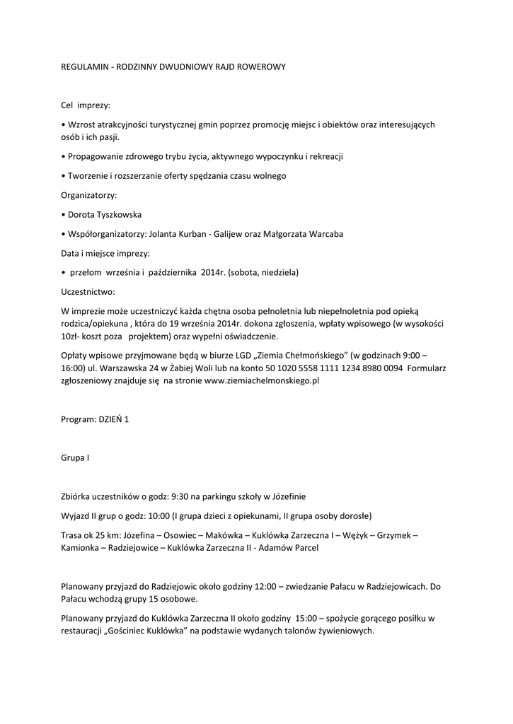 REGULAMIN - RODZINNY DWUDNIOWY RAJD ROWEROWY Cel imprezy: • Wzrost atrakcyjności turystycznej gmin poprzez promocję miejsc i obiektów oraz interesujących osób i ich pasji. • Propagowanie zdrowego trybu życia, aktywnego wypoczynku i rekreacji • Tworzenie i rozszerzanie oferty spędzania czasu wolnego Organizatorzy: • Dorota Tyszkowska • Współorganizatorzy: Jolanta Kurban - Galijew oraz Małgorzata Warcaba Data i miejsce imprezy: • przełom września i października 2014r. (sobota, niedziela) Uczestnictwo: W imprezie może uczestniczyć każda chętna osoba pełnoletnia lub niepełnoletnia pod opieką rodzica/opiekuna , która do 19 września 2014r. dokona zgłoszenia, wpłaty wpisowego (w wysokości 10zł- koszt poza projektem) oraz wypełni oświadczenie. Opłaty wpisowe przyjmowane będą w biurze LGD „Ziemia Chełmońskiego” (w godzinach 9:00 – 16:00) ul. Warszawska 24 w Żabiej Woli lub na konto 50 1020 5558 1111 1234 8980 0094 Formularz zgłoszeniowy znajduje się na stronie www.ziemiachelmonskiego.pl Program: DZIEŃ 1 Grupa I Zbiórka uczestników o godz: 9:30 na parkingu szkoły w Józefinie Wyjazd II grup o godz: 10:00 (I grupa dzieci z opiekunami, II grupa osoby dorosłe) Trasa ok 25 km: Józefina – Osowiec – Makówka – Kuklówka Zarzeczna I – Wężyk – Grzymek – Kamionka – Radziejowice – Kuklówka Zarzeczna II - Adamów Parcel Planowany przyjazd do Radziejowic około godziny 12:00 – zwiedzanie Pałacu w Radziejowicach. Do Pałacu wchodzą grupy 15 osobowe. Planowany przyjazd do Kuklówka Zarzeczna II około godziny 15:00 – spożycie gorącego posiłku w restauracji „Gościniec Kuklówka” na podstawie wydanych talonów żywieniowych. Koniec trasy/ miejsce biwakowania Adamów Parcel przy prywatnym Muzeum Kresów PołudniowoWschodnich. Grupa II Zbiórka uczestników o godz: 10:30 Plac Zygmunta Starego w Grodzisku Maz. Wyjazd II grup o godz.11:00 (I grupa dzieci z opiekunami, II grupa osoby dorosłe) Trasa ok 20 km: Plac Zygmunta Starego – Kałęczyn – Janinów – Wandzin – Maruna Sucha – Budy Józefowskie – Stare Budy Radziejowickie – Radziejowice – Kuklówka Zarzeczna - Adamów Parcel Planowany przyjazd do Radziejowic około godziny 13:00 – zwiedzanie Pałacu w Radziejowicach. Do Pałacu wchodzą grupy 15 osobowe. Planowany przyjazd do Kuklówka Zarzeczna II około godziny 15:00 – spożycie gorącego posiłku w restauracji „Gościniec Kuklówka” na podstawie wydanych talonów żywieniowych. Koniec trasy/ miejsce biwakowania Adamów Parcel przy prywatnym Muzeum Lwowa i Kresów Południowo-Wschodnich. W trakcie biwakowania przewidziano: - zwiedzanie Muzeum wraz z właścicielką Panią Joanną Biniszewską w grupach 15 osobowych, - zabawy integracyjne dla dzieci i dorosłych, - ognisko z pieczeniem kiełbasek. Dodatkowo organizatorki zapewniają kawę, herbatę, pieczywo, musztardę i ketchup DZIEŃ 2 Śniadanie w godzinach 8:00-9:00 Wyjazd o godz: 9:30 Wizyta w domu Józefa Chełmońskiego i spotkanie z wnukiem malarza Panem Austem 11.00 - zakończenie rajdu Dodatkowo zapewniamy: - przewodników/opiekunów grup, - podstawową opiekę medyczną, - ubezpieczenie. Nie zapewniamy: - Namiotów, śpiworów, rowerów i innych akcesoriów rowerowych. Uwaga: 1. Prosimy o zabranie ze sobą „zestawu małego skauta” czyli kubek, talerzyk oraz sztućce. Informacje dodatkowe: • Każdy uczestnik zobowiązuje się do przestrzegania niniejszego regulaminu. • Uczestników obowiązuje przestrzeganie zasad i przepisów prawa o ruchu drogowym oraz poleceń przewodników/opiekunów grup. • Trasa rajdu przebiegać będzie częściowo drogami asfaltowymi - w przewadze będą to drogi utwardzone, leśne i polne. • Osoby niepełnoletnie (nieposiadające uprawnień do samodzielnego poruszania się po drogach) mogą uczestniczyć tylko pod opieką osób dorosłych. • Uczestnicy startują na własną odpowiedzialność • Organizatorzy zastrzegają możliwość zmiany harmonogramu rajdu