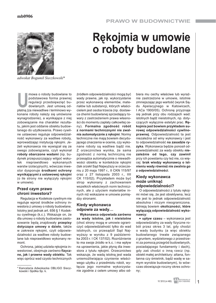 mb0906 PRAWO W BUDOWNICTWIE Rękojmia w umowie o roboty budowlane adwokat Bogumił Sieczkowski* mowa o roboty budowlane to pod sta wo wa for ma praw nej re gu la cji przed się wzięć bu dowlanych. Jest umową odpłatną (za niewadliwe i terminowo wykonane roboty należy się umówione wynagrodzenie), a wynikające z niej zobowiązanie ma charakter rezultatu, jakim jest oddanie obiektu budowlanego do użytkowania. Prawo cywilne ustawowo reguluje odpowiedzialność wykonawcy za wadliwe roboty, wprowadzając instytucję rękojmi. Jeżeli wykonawca nie wywiązał się ze swego zobowiązania, czyli wykonał roboty obarczone wadami (np. budynek przepuszczający wilgoć wskutek nie pra wi dło wo wy ko na nych warstw izolacyjnych), wówczas inwestor dys po nu je środ ka mi ochro ny wynikającymi z ustawowej rękojmi (o ile stro ny nie wy łą czy ły rę koj mi w umowie). U Przed czym prawo chroni inwestora? Regulacja w Kodeksie cywilnym nie reguluje wprost środków ochrony inwestora z umowy o roboty budowlane. Istotny jest jednak art. 656 § 1 Kodeksu cywilnego (k.c.). Wskazuje on, że dla umowy o roboty budowlane zastosowanie będą znajdowały przepisy dotyczące umowy o dzieło, także w za kre sie rę koj mi, czy li od po wie dzialności za wadliwe roboty budowlane lub nieprawidłowo wykonany remont. Ochrona, jakiej udziela rękojmia inwestorowi, obejmuje zarówno fizyczne, jak i prawne wady obiektu. Tak więc oprócz wad czysto technicznych * Kancelaria Adwokacka OBLIGO Sieczkowski i Spółka Sp. k. źródłem odpowiedzialności mogą być wady prawne, jak np. wykorzystanie przez wykonawcę elementów, materiałów lub substancji, których właścicielem jest osoba trzecia (np. dostawca chemii budowlanej sprzedający towary z zastrzeżeniem prawa własności do momentu zapłaty całkowitej ceny). For mal na zgod ność ro bót z normami technicznymi nie zwalnia automatycznie z rękojmi. Normy techniczne nie mają bowiem decydującego znaczenia w ocenie, czy wykona ne ro bo ty są wa dli we bądź nie. Z orzecz nic twa wy ni ka, że sa ma zgod ność z nor mą tech nicz ną nie przesądza automatycznie o niewadliwości obiektu w kontekście rękojmi (tak orzekł Sąd Najwyższy w orzeczeniu z 20 maja 1997 r., II CKN 115/97 oraz z 27 li sto pa da 2003 r., IIII CK 115/02). Przy kła dem mo że być strop wy ko na ny z za cho wa niem wszelkich właściwych norm technicznych, ale z użyciem materiałów innych niż wskazane w umowie pomiędzy stronami. Kiedy wykonawca odpowie za wady… Wykonawca odpowiada zarówno za wa dy istot ne, jak i nie istot ne (choć strony mogą w umowie ograniczyć odpowiedzialność tylko do wad istot nych, co prze są dził Sąd Naj wyż szy w wy ro ku z 9 paź dzier ni ka 2003 r. I CK 137/02). Rozróżnienie to ma swoje źródło w k.c. i ma wpływ na uprawnienia, jakie płyną dla inwestora z tytułu rękojmi. Orzecznictwo wskazuje, że wadą istotną jest wada unie moż li wia ją ca czy nie nie wła ści wego użytku z przedmiotu robót, wyłą cza je go nor mal ne wy ko rzy sta nie zgodnie z celem umowy albo od- biera mu cechy właściwe lub wyraźnie zastrzeżone w umowie, istotnie zmniejszając jego wartość (wyrok Sądu Ape la cyj ne go w Ka to wicach, I ACa 1900/05). Ochronę przyznaje się jednak przy obu rodzajach wad: istotnych bądź nieistotnych, np. dotyczących wyłącznie estetyki prac. Rękojmia jest bowiem przykładem surowej odpowiedzialności cywilnopraw nej. Od po wie dzial ność ta jest niezależna od winy wykonawcy i jest to odpowiedzialność na zasadzie ryzyka. Wykonawca będzie ponosił odpowiedzialność za wady obiektu nieza leż nie od te go, czy za wi nił przy ich powstaniu czy też nie, co więcej: brak wiedzy wykonawcy o istnieniu wady również nie zwalnia go z odpowiedzialności. Kiedy wykonawca może uniknąć odpowiedzialności? O odpowiedzialności z tytułu rękojmi mówi się, że jest obiektywna, lecz nie jest to jednak odpowiedzialność absolutna i niczym nieograniczona. Istnieją bowiem okoliczności, które wyłączają odpowiedzialność wykonawcy: • upływ czasu – wykonawca jest odpowiedzialny za wady fizyczne robót przez okres 3 lat, gdy cho dzi o wa dy bu dyn ku (a więc obiek tu bu dow la ne go trwa le zwią za ne go z gruntem, wydzielonego z przestrzeni za pomocą przegród budowlanych, posiadającego fundamenty i dach), gdy zaś cho dzi o in ną rzecz (np. obiekt małej architektury: altana, fontanna czy śmietnik, bądź wadę w samym wyrobie budowlanym), to wówczas obowiązuje roczny okres ochrony; 10 ’2012 (nr 482) 1 PRAWO W BUDOWNICTWIE • w obu przypadkach terminy rękoj mi na le ży li czyć od chwi li odebrania przedmiotu robót przez inwestora. Gdy chodzi o wady prawne, to termin rękojmi będzie jednolity: roczny od momentu dowiedzenia się przez in we sto ra o ist nie niu wa dy, a gdy dowiedział się o tej wadzie na skutek wy to cze nia po wódz twa przed są-dem, termin liczy się od momentu upra wo moc nie nia się orze cze nia w sprawie. Kolejną okolicznością, która może zwolnić wykonawcę od odpowiedzialności z rękojmi, jest brak zawiadomienia o wadzie ze strony inwestora. Każdy inwestor powinien bowiem dokonać tzw. aktu staranności, który polega na obowiązku zawiadomienia wykonawcy o wadzie obiektu niezwłocznie po jej wykryciu. Do zawiadomienia wystarczy wysłanie listu poleconego. Oprócz samego zawiadomienia, warto do celów dowodowych udokumentować wykrycie wady, np. przez sporządzenie odpowiedniego protokołu, sfotografowanie wady, dokonanie wpisu w dzienniku budowy lub montażu, a w ostateczności przez sporządzenie opinii przez biegłego. Jakie uprawnienia ma inwestor? Uprawnienia inwestora zależą od rodzaju stwierdzonych wad. Jak już wcześniej wskazano, wady mogą mieć charakter istotny bądź nieistotny, także mogą być usuwalne bądź nieusuwalne. W praktyce rodzaj wady określa się z pomocą biegłego, który ocenia ją w sposób procentowy, odnos