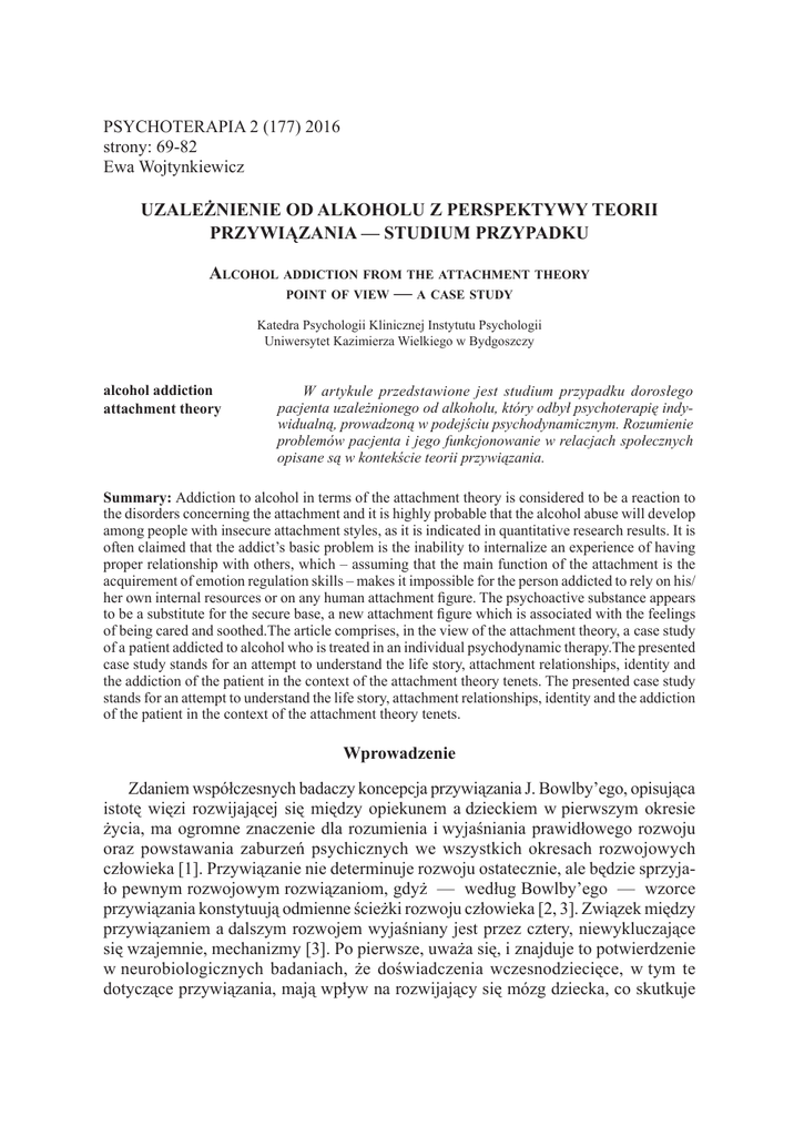 PSYCHOTERAPIA 2 (177) 2016 strony: 69-82 Ewa Wojtynkiewicz Uzależnienie od alkoholu z perspektywy teorii przywiązania — studium przypadku Alcohol addiction from the attachment theory point of view — a case study Katedra Psychologii Klinicznej Instytutu Psychologii Uniwersytet Kazimierza Wielkiego w Bydgoszczy alcohol addiction attachment theory W artykule przedstawione jest studium przypadku dorosłego pacjenta uzależnionego od alkoholu, który odbył psychoterapię indywidualną, prowadzoną w podejściu psychodynamicznym. Rozumienie problemów pacjenta i jego funkcjonowanie w relacjach społecznych opisane są w kontekście teorii przywiązania. Summary: Addiction to alcohol in terms of the attachment theory is considered to be a reaction to the disorders concerning the attachment and it is highly probable that the alcohol abuse will develop among people with insecure attachment styles, as it is indicated in quantitative research results. It is often claimed that the addict’s basic problem is the inability to internalize an experience of having proper relationship with others, which – assuming that the main function of the attachment is the acquirement of emotion regulation skills – makes it impossible for the person addicted to rely on his/ her own internal resources or on any human attachment figure. The psychoactive substance appears to be a substitute for the secure base, a new attachment figure which is associated with the feelings of being cared and soothed.The article comprises, in the view of the attachment theory, a case study of a patient addicted to alcohol who is treated in an individual psychodynamic therapy.The presented case study stands for an attempt to understand the life story, attachment relationships, identity and the addiction of the patient in the context of the attachment theory tenets. The presented case study stands for an attempt to understand the life story, attachment relationships, identity and the addiction of the patient in the context of the attachment theory tenets. Wprowadzenie Zdaniem współczesnych badaczy koncepcja przywiązania J. Bowlby’ego, opisująca istotę więzi rozwijającej się między opiekunem a dzieckiem w pierwszym okresie życia, ma ogromne znaczenie dla rozumienia i wyjaśniania prawidłowego rozwoju oraz powstawania zaburzeń psychicznych we wszystkich okresach rozwojowych człowieka [1]. Przywiązanie nie determinuje rozwoju ostatecznie, ale będzie sprzyjało pewnym rozwojowym rozwiązaniom, gdyż — według Bowlby’ego — wzorce przywiązania konstytuują odmienne ścieżki rozwoju człowieka [2, 3]. Związek między przywiązaniem a dalszym rozwojem wyjaśniany jest przez cztery, niewykluczające się wzajemnie, mechanizmy [3]. Po pierwsze, uważa się, i znajduje to potwierdzenie w neurobiologicznych badaniach, że doświadczenia wczesnodziecięce, w tym te dotyczące przywiązania, mają wpływ na rozwijający się mózg dziecka, co skutkuje 70 Ewa Wojtynkiewicz długotrwałymi zmianami na poziomie neuronalnym. Więź dziecka z opiekunem w fundamentalny sposób kształtuje strukturę i funkcje układu limbicznego i prawej półkuli mózgu, istotnych dla przetwarzania emocji. Według Schore’a są one odpowiedzialne za wytworzenie się więzi, wewnętrznych modeli operacyjnych, afektu, komunikacji niewerbalnej i nieświadomości [3–5]. Po drugie, relacja przywiązaniowa stanowić może podstawę dla kształtowania się zdolności do regulacji emocji, ze względu na towarzyszący tej relacji proces internalizowania sposobów regulowania afektu [3]. Uważa się, że efektywna samoregulacja emocji związana jest z ufnym przywiązaniem; pozabezpieczne wzorce przywiązania mają natomiast związek z zaburzeniami regulacji emocji [5], co jest o tyle istotne, że zaburzenia te uważa się współcześnie za jeden z podstawowych mechanizmów wszystkich zaburzeń psychicznych [4]. Trzeci mechanizm wyjaśniający związek między przywiązaniem a dalszym rozwojem obejmuje kwestię behawioralnej regulacji i synchronii. Dziecko, obserwując opiekuna i wchodząc z nim w interakcje, „uczy się” relacji z drugim człowiekiem i rozumienia go, wykształcając w ten sposób określone umiejętności społeczne [3], a także zdolność do mentalizacji [6]. Ostatni mechanizm odnosi się do tworzenia w trakcie relacji przywiązania reprezentacji siebie i opiekuna, zawierających przekonania i oczekiwania. Te wewnętrzne modele operacyjne, tworzone poprzez interakcje z opiekunem i zawierające obraz siebie, drugiej osoby i związku z nią, są względnie trwałe, co oznacza, iż wnoszone są do nowych relacji, kierując zachowaniem osoby oraz jej doświadczaniem siebie i drugiego człowieka [3, 7]. Co ważne, tylko bezpieczny wzór przywiązania zawiera pozytywną reprezentację siebie i pozytywną reprezentację drugiego człowieka [8]. Koncepcja więzi podkreśla więc znaczenie zależności dziecka od opiekunów, a jednocześnie tłumaczy akcentowany obecnie pogląd, że uraz doznany w relacji przywiązania w dzieciństwie może mieć, w kontekście tworzenia się psychopatologii, większe znaczenie niż czynniki genetyczne, konstytucyjne czy społeczne [4]. Uważa się, iż u osoby z historią interpersonalnej traumy istnieje zwiększona podatność na uzależnienie od alkoholu. Relacyjny uraz traktuje się jako specyficzny czynnik ryzyka stanowiący o zagrożeniu dla zdolności do formowania zdrowego przywiązania i do regulacji self [9]. Uzależnienie od alkoholu staje się w ten sposób skomplikowanym mechanizmem kompensacji, będącym jednocześnie manifestacją niezaspokojonych rozwojowych potrzeb relacyjnych [9, 10]. Twierdzi się bowiem, że podstawowym problemem osoby uzależnionej od alkoholu, który dominuje w jej psychicznej realności, jest niezdolność do zinternalizowania doświadczenia dobrej relacji z innymi, co — przy założeniu, iż główną funkcją przywiązania jest nabycie umiejętności regu