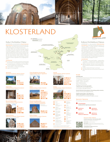 KLOSTERLAND Kultur | Architektur | Natur Kultura | Architektura | Natura KLOSTERLAND ist die Dachmarke des Deutsch-Polnischen Klosternetzwerks. Das Netzwerk ist ein Zusammenschluss ehemaliger Klöster und anderer kulturtouristischer Einrichtungen im brandenburgischen und westpommerschen Raum. Die Klöster heißen heute als Kultureinrichtungen Besucher verschiedenster Interessen willkommen. Mit ihren vielfältigen touristischen Angeboten vermitteln sie ihren Gästen die bewegte Geschichte der historischen Gemäuer, informieren über das Leben ihrer Bewohner und die einmalige Architektur. Neben dem Museumsbetrieb erfüllen Konzerte, Märkte und Feste die Klöster mit Leben. Das Zusammenspiel von Kultur, Architektur und Natur sorgt dabei für eine einzigartige Atmosphäre. KLOSTERLAND to marka parasolowa Polsko-Niemieckiej Sieci Klasztorów. W jej skład wchodzą dawne klasztory oraz instytucje związane z turystyką kulturową w Brandenburgii i województwie zachodniopomorskim. Dawne klasztory – dziś niezwykłe atrakcje turystyczne, przyciągają odwiedzających wyjątkową atmosferą, bogatą architekturą i pasjonującą historią. Choć nie zamieszkują ich już mnisi, klasztory nadal tętnią życiem. W ich murach odbywają się obecnie spotkania, warsztaty, koncerty, wystawy i festyny. Niepowtarzalne połączenie kultury, architektury oraz natury sprawia, że zwiedzanie staje się niezapomnianym przeżyciem nawet dla najbardziej wymagających turystów. KLOSTERLAND informuje za pomocą nowych mediów – w języku polskim i niemieckim – o aktualnej ofercie kulturalnej klasztorów objętych siecią oraz miejscowości, w których się znajdują KLOSTERLAND informiert im Internet umfassend, aktuell und mehrsprachig über die Klöster und ihr kulturelles / touristisches Angebot veranstaltet Symposien und Workshops zum Thema Kulturtourismus, ländlicher Raum und Netzwerke erarbeitet Werbe- und Informationsmaterialien organizuje sympozja i warsztaty na temat turystyki kulturowej oraz możliwości współpracy w obszarach słabych strukturalnie organisiert Vernetzungstreffen publikuje materiały informacyjne i promocyjne organizuje spotkania dla instytucji zainteresowanych współpracą Altfriedland Zisterzienserinnenkloster / Klasztor Cysterek Chojna (Königsberg in der Neumark) Augustinerkloster / Klasztor Augustianów Neuzelle Zisterzienserkloster / Klasztor Cystersów Fischerstraße | 15320 Neuhardenberg, OT Altfriedland ul. Malarska 24 | 74-500 Chojna Stiftsplatz 7 | 15898 Neuzelle Kontakt KLOSTERLAND Deutsch-Polnisches Klosternetzwerk / Polsko-Niemiecka Sieć Klasztorów c/o Ostdeutscher Sparkassenverband Leipziger Straße 51 | 10117 Berlin Telefon: + 49 (0)151 209 040 74 Email: [email protected] Website: www.klosterland.de Angermünde Franziskanerkloster / Klasztor Franciszkanów Chorin Zisterzienserkloster / Klasztor Cystersów Prenzlau Dominikanerkloster / Klasztor Dominikanów Klosterstraße 43a | 16278 Angermünde Amt Chorin 11a | 16230 Chorin Uckerwiek 813 | 17291 Prenzlau Projektleitung / Koordynacja projektu Lara Buschmann: [email protected] Lina Lisa Kolbitz: [email protected] Deutsch-Polnische Kommunikation / Komunikacja polsko-niemiecka Michalina Golinczak: [email protected] Projektverantwortung i.A. der Sponsoren / Nadzór nad projektem w imieniu sponsorów Dr. / dr Alexander Conrad: [email protected] Sponsoren / Sponsorzy Bierzwnik (Marienwalde) Zisterzienserkloster / Klasztor Cystersów ul. Cystersów 1 | 73-240 Bierzwnik Chwarszczany (Quartschen) Templer- und Johanniterkommende / Komandoria Templariuszy i Joannitów Chwarszczany | 74-407 Boleszkowice Museum Muzeum Gastronomie am / im Kloster Gastronomia na terenie lub w pobliżu klasztoru Unterkunft am / im Kloster Możliwość noclegu na terenie lub w pobliżu klasztoru Badesee am Kloster Jezioro z kąpieliskiem w pobliżu klasztoru Cedynia (Zehden) Zisterzienserinnenkloster / Klasztor Cysterek Kołbacz (Kolbatz) Zisterzienserkloster / Klasztor Cystersów ul. M. Konopnickiej 10 | 74-520 Cedynia ul. Warcisława 8 | 74-106 Kołbacz Am Pilger- / Wanderweg gelegen Lokalizacja na szlaku pielgrzymkowym lub wędrownym Am Fahrradweg gelegen Lokalizacja na szlaku rowerowym Führungen und / oder Audioguides D / E / F / P / R Oprowadzania i / lub audioprzewodnik A / F / N / P / R Besucherservice D / E / F / P / R Informacja A / F / N / P / R Kinder- und Familienangebot Oferta dla dzieci i rodzin Die Ausstellung wurde finanziert durch / Wystawa sfinansowana przez: Konzert Koncerty Theater (Schauspiel, Oper, Tanz) Widowiska teatralne Wechselnde Ausstellungen Wystawy Spirituelles / Kirchliches Angebot Nabożeństwa i wydarzenia o charakterze religijnym Shop Sklep z pamiątkami Märkte Targi Barrierefrei für Gäste mit Mobilitätseinschränkung Dostęp dla osób niepełnosprawnych ruchowo Deutsch (D) / Englisch (E) / Französisch (F) / Polnisch (P) / Russisch (R) niemiecki (N) / angielski (A) / francuski (F) / polski (P) / rosyjski (R) Impressum / Stopka redakcyjna Text, Übersetzung, Lektorat / Tekst, tłumaczenie, redakcja Projektteam in Zusammenarbeit mit den Netzwerkpartnern / Zespół projektu we współpracy z partnerami sieci Grafik / Grafika Layoutservice Muchow Fotos / Zdjęcia Julia Angermüller (Altfriedland, Angermünde, Chorin, Prenzlau), Ben Fuchs (Chojna, Chwarszczany, Bierzwnik, Kołbacz, Neuzelle), Klasztor Cedynia (Cedynia) Ausstellungssystem / System wystawienniczy ausstellungssysteme LINGOTT Neuzelle Klasztor Cystersów Zisterzienserkloster Geschichte 1268 stiftete Markgraf Hein- Historia Klasztor został ufundowany w 1268 roku przez margrabię miśnieńskiego Henryka. W XV wieku opactwo było wielokrotnie narażone na najazdy husytów. Spowodowane nimi zniszczenia odbudowano około 1500 roku. Przynależność do Dolnych Łużyc, tym samym zaś do Królestwa Czech, a od 1635 roku do Saksonii, wpływała na to, że w opactwie przebywa- rich von Meißen das Kloster Neuzelle. Im 15. Jd. li głównie mnisi czescy