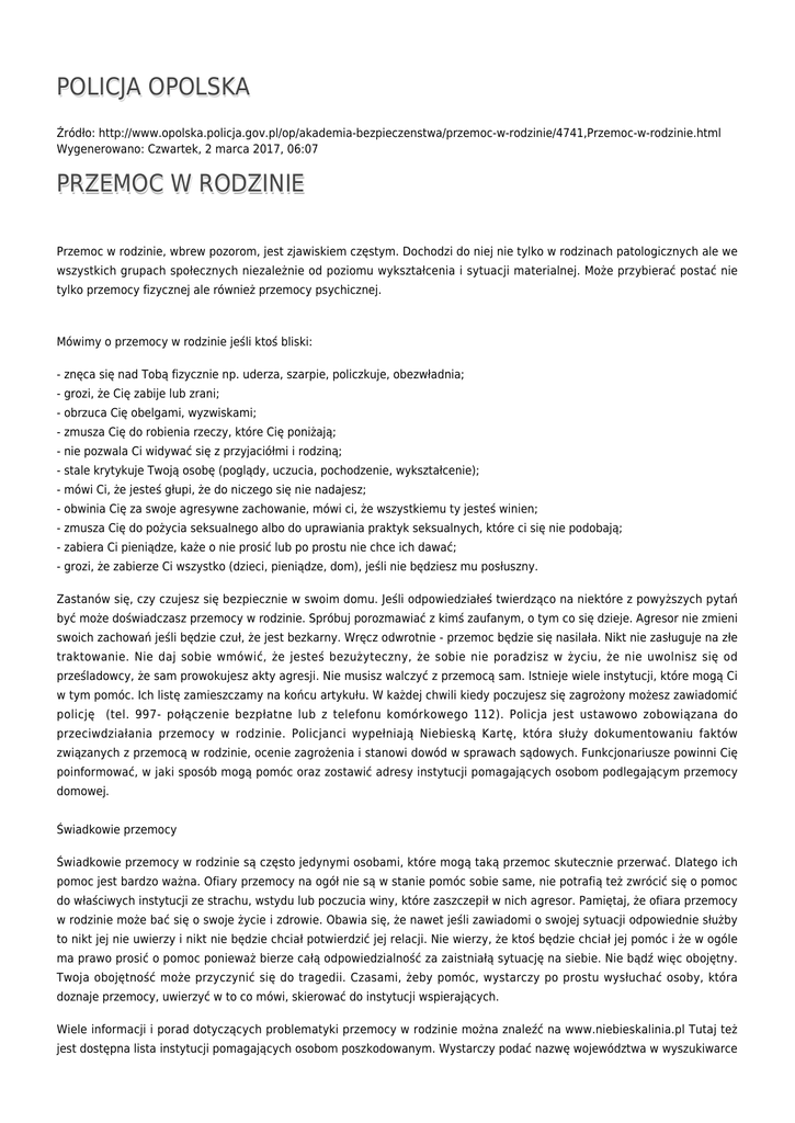 POLICJA OPOLSKA Źródło: http://www.opolska.policja.gov.pl/op/akademia-bezpieczenstwa/przemoc-w-rodzinie/4741,Przemoc-w-rodzinie.html Wygenerowano: Czwartek, 2 marca 2017, 06:07 PRZEMOC W RODZINIE Przemoc w rodzinie, wbrew pozorom, jest zjawiskiem częstym. Dochodzi do niej nie tylko w rodzinach patologicznych ale we wszystkich grupach społecznych niezależnie od poziomu wykształcenia i sytuacji materialnej. Może przybierać postać nie tylko przemocy fizycznej ale również przemocy psychicznej. Mówimy o przemocy w rodzinie jeśli ktoś bliski: - znęca się nad Tobą fizycznie np. uderza, szarpie, policzkuje, obezwładnia; - grozi, że Cię zabije lub zrani; - obrzuca Cię obelgami, wyzwiskami; - zmusza Cię do robienia rzeczy, które Cię poniżają; - nie pozwala Ci widywać się z przyjaciółmi i rodziną; - stale krytykuje Twoją osobę (poglądy, uczucia, pochodzenie, wykształcenie); - mówi Ci, że jesteś głupi, że do niczego się nie nadajesz; - obwinia Cię za swoje agresywne zachowanie, mówi ci, że wszystkiemu ty jesteś winien; - zmusza Cię do pożycia seksualnego albo do uprawiania praktyk seksualnych, które ci się nie podobają; - zabiera Ci pieniądze, każe o nie prosić lub po prostu nie chce ich dawać; - grozi, że zabierze Ci wszystko (dzieci, pieniądze, dom), jeśli nie będziesz mu posłuszny. Zastanów się, czy czujesz się bezpiecznie w swoim domu. Jeśli odpowiedziałeś twierdząco na niektóre z powyższych pytań być może doświadczasz przemocy w rodzinie. Spróbuj porozmawiać z kimś zaufanym, o tym co się dzieje. Agresor nie zmieni swoich zachowań jeśli będzie czuł, że jest bezkarny. Wręcz odwrotnie - przemoc będzie się nasilała. Nikt nie zasługuje na złe traktowanie. Nie daj sobie wmówić, że jesteś bezużyteczny, że sobie nie poradzisz w życiu, że nie uwolnisz się od prześladowcy, że sam prowokujesz akty agresji. Nie musisz walczyć z przemocą sam. Istnieje wiele instytucji, które mogą Ci w tym pomóc. Ich listę zamieszczamy na końcu artykułu. W każdej chwili kiedy poczujesz się zagrożony możesz zawiadomić policję (tel. 997- połączenie bezpłatne lub z telefonu komórkowego 112). Policja jest ustawowo zobowiązana do przeciwdziałania przemocy w rodzinie. Policjanci wypełniają Niebieską Kartę, która służy dokumentowaniu faktów związanych z przemocą w rodzinie, ocenie zagrożenia i stanowi dowód w sprawach sądowych. Funkcjonariusze powinni Cię poinformować, w jaki sposób mogą pomóc oraz zostawić adresy instytucji pomagających osobom podlegającym przemocy domowej. Świadkowie przemocy Świadkowie przemocy w rodzinie są często jedynymi osobami, które mogą taką przemoc skutecznie przerwać. Dlatego ich pomoc jest bardzo ważna. Ofiary przemocy na ogół nie są w stanie pomóc sobie same, nie potrafią też zwrócić się o pomoc do właściwych instytucji ze strachu, wstydu lub poczucia winy, które zaszczepił w nich agresor. Pamiętaj, że ofiara przemocy w rodzinie może bać się o swoje życie i zdrowie. Obawia się, że nawet jeśli zawiadomi o swojej sytuacji odpowiednie służby to nikt jej nie uwierzy i nikt nie będzie chciał potwierdzić jej relacji. Nie wierzy, że ktoś będzie chciał jej pomóc i że w ogóle ma prawo prosić o pomoc ponieważ bierze całą odpowiedzialność za zaistniałą sytuację na siebie. Nie bądź więc obojętny. Twoja obojętność może przyczynić się do tragedii. Czasami, żeby pomóc, wystarczy po prostu wysłuchać osoby, która doznaje przemocy, uwierzyć w to co mówi, skierować do instytucji wspierających. Wiele informacji i porad dotyczących problematyki przemocy w rodzinie można znaleźć na www.niebieskalinia.pl Tutaj też jest dostępna lista instytucji pomagających osobom poszkodowanym. Wystarczy podać nazwę województwa w wyszukiwarce na stronie internetowej www.porozumienie.niebieskalinia.pl Poradnik Ocena: 0/5 (0) Tweetnij bezpieczeństwo w rodzinie, bezpieczeństwo publiczne, profilaktyka