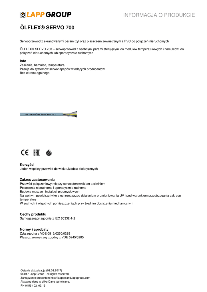 INFORMACJA O PRODUKCIE ÖLFLEX® SERVO 700 Serwoprzewód z ekranowanymi parami żył oraz płaszczem zewnętrznym z PVC do połączeń nieruchomych ÖLFLEX® SERVO 700 – serwoprzewód z osobnymi parami sterującymi do modułów temperaturowych i hamulców, do połączeń nieruchomych lub sporadycznie ruchomych Info Zasilanie, hamulec, temperatura Pasuje do systemów serwonapędów wiodących producentów Bez ekranu ogólnego Korzyści Jeden wspólny przewód do wielu układów elektrycznych Zakres zastosowania Przewód połączeniowy między serwosterownikiem a silnikiem Połączenia nieruchome i sporadycznie ruchome Budowa maszyn i instalacji przemysłowych Na wolnym powietrzu tylko z ochroną przed działaniem promieniowania UV i pod warunkiem przestrzegania zakresu temperatury W suchych i wilgotnych pomieszczeniach przy średnim obciążeniu mechanicznym Cechy produktu Samogasnący zgodnie z IEC 60332-1-2 Normy i aprobaty Żyła zgodna z VDE 0812/0250/0285 Płaszcz zewnętrzny zgodny z VDE 0245/0285 Ostania aktualizacja (02.03.2017) ©2017 Lapp Group - all rights reserved. Zarządzanie produktem http://lapppoland.lappgroup.com Aktualne dane w pliku Dane techniczne. PN 0456 / 02_03.16 INFORMACJA O PRODUKCIE ÖLFLEX® SERVO 700 Budowa produktu Żyła cienkodrutowa z czystej miedzi Izolacja żyły: PVC Pary żył sterowniczych 0,34 mm², kolorowe, od 0,5 mm² czarne, z nadrukowaną kolejno numeracją Pary żył sterowniczych ekranowane laminowaną folią aluminiową oraz owijką z cynowanych drucików miedzianych Wykonanie z jedną parą sterowniczą bez laminowanej folii aluminiowej (FDF) Żyły i pary skręcone razem Płaszcz z PVC, szary (RAL 7001) Dane techniczne Klasyfikacja: ETIM 5.0 Class-ID: EC000104 Opis klasy ETIM 5.0: Przewód sterowniczy Oznaczenie żył: Wersja z 2 parami lub 1 czwórką gwiazdową: żyły zasilające: czarne z białymi numerami 1-3 z żyłą ochronną GN/YE żyły sterownicze: czarne z białymi numerami 5-8 (numeracja rośnie wraz z przekrojem) para 0,34 mm²: WH/BR/GN/YE Wersja z 1 parą sterowniczą: żyły zasilające (4 lub 7 żył): czarne z białymi numerami 3-5 lub 3-8 oraz z żyłą ochronną GN/YE żyły zasilające (5 żył): kolory zgodne z VDE 0293-1 żyły sterownicze: czarne z białymi numerami 1-2 Budowa żyły: Z cienkich drucików zgodnie z VDE 0295 klasa 5/IEC 60228 klasa 5 Minimalny promień gięcia: Połączenia sporadycznie ruchome: 20 x średnica zewnętrzna Połączenia nieruchome: 6 x średnica zewnętrzna Napięcie nominalne: Żyły zasilające: U 0 /U 600/1000 V Pary żył sterowniczych: 250V AC Napięcie próbne: Żyły zasilające: żyła/żyła: 4000 V; żyła/ekran: 2000V Żyły sterownicze: żyła/żyła: 1500 V; żyła/ekran: 750 V Żyła ochronna: G = z żyłą ochronną żółto - zieloną X = bez żyły ochronnej Zakres temperatury: Sporadycznie ruchome: od -5°C do +80°C Połączenia nieruchome: od -40°C do +80°C Wskazówka Wszystkie podane wartości dotyczące produktów są wartościami nominalnymi (o ile nie wskazano inaczej). Inne wartości, takie jak np. tolerancje mogą być przedstawione na zamówienie (jeżeli są dostępne i przeznaczone do publikacji). Standardowe odcinki proszę sprawdzić na: www.lapppolska.pl Rodzaj opakowania: krążek ≤ 30 kg lub ≤ 250 m, w przeciwnym razie bęben Prosimy określić wielkość opakowania (np. 1 x 500 m bęben lub 5 x 100 m krążek) Fotografie nie mogą być używane do wymiarowania oraz nie stanowią szczegółowego odwzorowania przedstawionych produktów. * Podane ceny to ceny netto bez podatku VAT i dodatkowych opłat. Sprzedaż klientom biznesowym. Ostania aktualizacja (02.03.2017) ©2017 Lapp Group - all rights reserved. Zarządzanie produktem http://lapppoland.lappgroup.com Aktualne dane w pliku Dane techniczne. PN 0456 / 02_03.16 Powered by TCPDF (www.tcpdf.org) Liczba żył i przekrój [mm²] Średnica zewnętrzna [mm] Indeks miedzi [kg/km] Waga [kg/km] 0036140 4 G 0,75 + 2 x (2 x 0,34) 9,5 91,9 120 0036145 4 G 1,5 + 2 x (2 x 0,75) 12,1 100,6 185 0036150 4 G 2,5 + (2 x 2 x 0,75) 13,9 142,1 327 0036151 4 G 4 + (2 x 0,75 + 2 x 1,0) 15,8 217,8 423 0036152 4 G 6 + (2 x 0,75 + 2 x 1,0) 16,7 294,6 544 0036154 4 G 16 + (2 x 2 x 1,0) 23,5 668,8 1168 0036025 4 G 1,5 + (2 x 0,75) 11,7 98 149 0036001 5 G 1,5 + (2 x 0,75) 12,7 110 160 0036015 7 G 1,5 + (2 x 0,75) 12,4 144,8 210 0036026 4 G 2,5 + (2 x 0,75) 13,1 138,6 227 0036020 7 G 2,5 + (2 x 0,75) 15,2 215,7 334 ÖLFLEX® SERVO 700 ÖLFLEX® SERVO 700 Ostania aktualizacja (02.03.2017) ©2017 Lapp Group - all rights reserved. Zarządzanie produktem http://lapppoland.lappgroup.com Aktualne dane w pliku Dane techniczne. PN 0456 / 02_03.16 INFORMACJA O PRODUKCIE Powered by TCPDF (www.tcpdf.org) Numer katalogowy