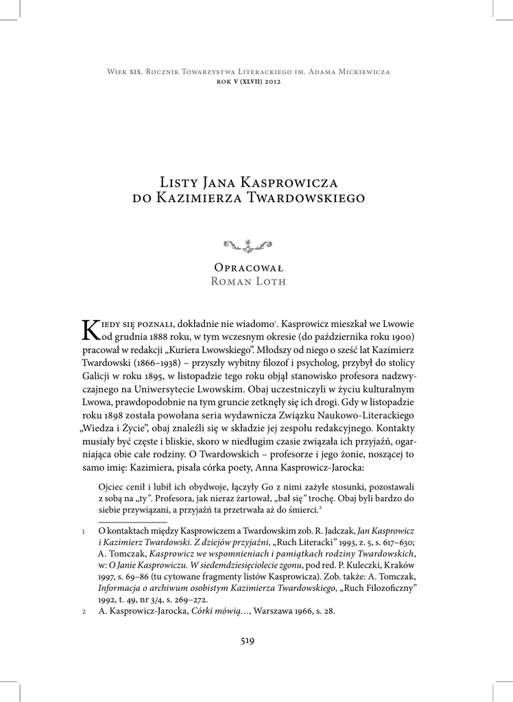 Wiek XIX . Rocznik Towarzystwa Literackiego im. Adama Mickiewicza rok V (XLVII) 2012 Listy Jana Kasprowicza do Kazimierza Twardowskiego Opracował Roman Loth K iedy się poznali, dokładnie nie wiadomo1. Kasprowicz mieszkał we Lwowie od grudnia 1888 roku, w tym wczesnym okresie (do października roku 1900) pracował w redakcji „Kuriera Lwowskiego”. Młodszy od niego o sześć lat Kazimierz Twardowski (1866–1938) – przyszły wybitny filozof i psycholog, przybył do stolicy Galicji w roku 1895, w listopadzie tego roku objął stanowisko profesora nadzwyczajnego na Uniwersytecie Lwowskim. Obaj uczestniczyli w życiu kulturalnym Lwowa, prawdopodobnie na tym gruncie zetknęły się ich drogi. Gdy w listopadzie roku 1898 została powołana seria wydawnicza Związku Naukowo-Literackiego „Wiedza i Życie”, obaj znaleźli się w składzie jej zespołu redakcyjnego. Kontakty musiały być częste i bliskie, skoro w niedługim czasie związała ich przyjaźń, ogarniająca obie całe rodziny. O Twardowskich – profesorze i jego żonie, noszącej to samo imię: Kazimiera, pisała córka poety, Anna Kasprowicz-Jarocka: Ojciec cenił i lubił ich obydwoje, łączyły Go z nimi zażyłe stosunki, pozostawali z sobą na „ty”. Profesora, jak nieraz żartował, „bał się” trochę. Obaj byli bardzo do siebie przywiązani, a przyjaźń ta przetrwała aż do śmierci.2 1 2 O kontaktach między Kasprowiczem a Twardowskim zob. R. Jadczak, Jan Kasprowicz i Kazimierz Twardowski. Z dziejów przyjaźni, „Ruch Literacki” 1993, z. 5, s. 617–630; A. Tomczak, Kasprowicz we wspomnieniach i pamiątkach rodziny Twardowskich, w: O Janie Kasprowiczu. W siedemdziesięciolecie zgonu, pod red. P. Kuleczki, Kraków 1997, s. 69–86 (tu cytowane fragmenty listów Kasprowicza). Zob. także: A. Tomczak, Informacja o archiwum osobistym Kazimierza Twardowskiego, „Ruch Filozoficzny” 1992, t. 49, nr 3/4, s. 269–272. A. Kasprowicz-Jarocka, Córki mówią…, Warszawa 1966, s. 28. 519 • Listy Jana Kasprowicza do Kazimierza Twardowskiego • Około roku 1903 Kasprowicz z córkami Janiną i Anną począł przyjeżdżać na lato do Poronina. W tym samym czasie na letnią siedzibę wybrał sobie Poronin Twardowski, przybywający tu z żoną i córkami: Heleną, Anielą i Marią. Mieszkali zwykle niedaleko siebie, co sprzyjało zacieśnianiu stosunków. Przedsiębrano wspólne wycieczki w góry. Twardowski, bardziej praktyczny życiowo i lepiej zorganizowany, niejednokrotnie wspierał Kasprowicza radą i pomocą. To jego – jak się wydaje – inicjatywą był doktorat poety, stanowiący przygotowanie do późniejszej profesury. Miało to być materialne na przyszłość zabezpieczenie Kasprowicza, brnącego przez życie w długach i w stałej finansowej niepewności. Mając za sobą ukończone (choć niezamknięte oficjalnie) studia wrocławskie, w roku 1903 Kasprowicz zapisał się na Wydział Filozoficzny Uniwersytetu Lwowskiego, aby dopełnić wymaganych formalności. Wedle relacji wspomnieniowych nakłonił go do tego właśnie Twardowski. Studiował od semestru letniego 1902/1903 do zimowego 1903/1904 włącznie, słuchając między innymi wykładów Twardowskiego. Profesor był też jednym z egzaminatorów Kasprowicza. Uroczysta promocja doktorska odbyła się w auli uniwersyteckiej 21 lipca 1904 roku. W cztery lata później, w styczniu 1908 roku, Wydział Filozoficzny Uniwersytetu Lwowskiego zwrócił się do Ministerstwa Wyznań i Oświaty w Wiedniu o utworzenie we Lwowie katedry historii literatury powszechnej porównawczej i powierzenie jej Kasprowiczowi3. 3 marca 1909 roku cesarz Franciszek Józef zatwierdził ten projekt i poeta stał się kolegą uniwersyteckim Twardowskiego. Od marca roku 1902 do roku 1905 poeta był członkiem redakcji „Słowa Polskiego”. W lipcu 1906 roku porzucił Lwów i przeniósł się do Poronina, skąd powrócił do miasta w związku z nominacją profesorską. Zamieszkał przy ulicy św. Zofii 48, w bezpośrednim sąsiedztwie Twardowskich (św. Zofii 464). Posłużyło to dalszemu zacieśnieniu kontaktów. Dziewczynki z obu rodzin przyjaźniły się blisko. Poeta przez pewien czas stołował się u Twardowskich. Zachowały się teksty zabawnych fraszek, pisanych przez poetę ku uciesze córek Profesora. Wśród pamiątek pozostałych po Twardowskim jest kilka książek Kasprowicza z autorskimi dedykacjami. Świadectwem tych wieloletnich i serdecznych stosunków między Kasprowiczem i Twardowskim oraz jego rodziną jest zachowany zespół listów poety do Kazimierza Twardowskiego i jego żony. Obejmuje on 26 listów i kartek do Profesora oraz trzy do Kazimiery Twardowskiej. Pochodzą one z lat 1903–1916. 24 z nich oraz listy do 3 4 Piszę o tym szczegółowo w szkicu Jan Kasprowicz jako profesor Uniwersytetu Lwowskiego (w: Jan Kasprowicz. W siedemdziesięciolecie śmierci, pod red. J. Kaczyńskiego, Olsztyn 1999, s. 217–228). Por. też: J. Starnawski, Jan Kasprowicz (12 XII 1860 – 1 VIII 1926) profesorem literatury porównawczej na Uniwersytecie Lwowskim, „Ruch Literacki” 1996, nr 2, s. 183–194. Numeracja z czasem została zmieniona na (odpowiednio) numery 22D i 22C. 520 • Listy Jana Kasprowicza do Kazimierza Twardowskiego • Twardowskiej przez długi czas znajdowały się w posiadaniu rodziny Profesora. Ostatnio były własnością wnuka Twardowskiego, prof. Andrzeja Tomczaka, który w roku 1991 złożył je w Archiwum Polskiej Akademii Nauk. Dwa pozostałe znajdują się w Bibliotece Instytutu Filozofii i Socjologii PAN 5. Zespół epistolograficzny przechowany w Archiwum PAN był przedmiotem działań edytorskich na seminarium prowadzonym przeze mnie dla doktorantów Instytutu Badań Literackich PAN w roku akademickim 2008/2009. Przedstawione poniżej teksty są przygotowane we współpracy z uczestnikami tego seminarium. Odczytania i problemy tekstologiczne (w tym zagadnienia modernizacji zapisu) były dyskutowane w kilkunastoosobowym gronie