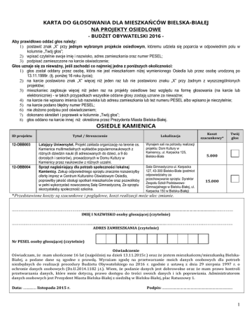 KARTA DO GŁOSOWANIA DLA MIESZKAŃCÓW BIELSKA-BIAŁEJ NA PROJEKTY OSIEDLOWE - BUDŻET OBYWATELSKI 2016 Aby prawidłowo oddać głos należy: 1) postawić znak „X” przy jednym wybranym projekcie osiedlowym, któremu udziela się poparcia w odpowiednim polu w kolumnie „Twój głos”; 2) wpisać czytelnie swoje imię i nazwisko, adres zamieszkania oraz numer PESEL; 3) podpisać zamieszczone na karcie oświadczenie; Głos uznaje się za nieważny, jeśli zachodzi co najmniej jedna z poniższych okoliczności: 1) głos został oddany przez osobę, która nie jest mieszkańcem niżej wymienionego Osiedla lub przez osobę urodzoną po 13.11.1999r. (tj. poniżej 16 roku życia); 2) na karcie postawiono znak „X” więcej niż jeden raz lub nie postawiono znaku „X” przy żadnym z wyszczególnionych projektów; 3) mieszkaniec zagłosuje więcej niż jeden raz na projekty osiedlowe bez względu na formę głosowania (na karcie lub elektronicznie) - w takich przypadkach wszystkie oddane głosy zostają uznane za nieważne; 4) na karcie nie wpisano imienia lub nazwiska lub adresu zamieszkania lub też numeru PESEL albo wpisano je nieczytelnie; 5) na karcie podano błędny numer PESEL; 6) nie złożono podpisu pod oświadczeniem; 7) dokonano skreśleń i poprawek w kolumnie „Twój głos”; 8) głos oddano na karcie innej niż określona przez Prezydenta Miasta Bielska-Białej. OSIEDLE KAMIENICA ID projektu Tytuł / Streszczenie Lokalizacja 12-OBB003 Latający Uniwersytet. Projekt zakłada organizację na terenie os. Kamienica multimedialnych wykładów popularnonaukowych z różnych dziedzin nauki (6 adresowanych do dzieci, a 9 do dorosłych i seniorów), prowadzonych w Domu Kultury w Kamienicy przez naukowców z różnych uczelni. Sprzęt nagłaśniający dla potrzeb społeczności lokalnej Kamienicy. Zakup odpowiedniego sprzętu znacznie rozszerzyłby ofertę imprez w Centrum Kulturalno Oświatowym Osiedla, poprawiłby jakość obsługi spotkań mieszkańców oraz pozwoliłoby w pełni wykorzystać nowoczesną Salę Gimnastyczną. Ze sprzętu skorzystałaby społeczność szkolna. Wynajem sali na potrzeby realizacji projektu: Dom Kultury w Kamienicy, ul. Karpacka 125, Bielsko-Biała 12-OBB004 Sala Gimnastyczna ul. Karpacka 127, 43-300 Bielsko-Biała (podmiot odpowiedzialny za przechowywanie sprzętu: Dyrektor Zespołu Szkół PodstawowoGimnazjalnego w Bielsku-Białej, ul. Karpacka 150 w Bielsku-Białej) Koszt szacunkowy* Twój głos 5.000 15.000 *Przedstawione koszty są szacunkowe i poglądowe, koszt realizacji może ulec zmianie. …………………………………………………………………………………………………………….....................................................................................……………. IMIĘ I NAZWISKO osoby głosującej (czytelnie) ………….…………………………………………………….........................................................................................……………………………...……………………… ADRES ZAMIESZKANIA (czytelnie) Nr PESEL osoby głosującej (czytelnie) Oświadczenie Oświadczam, że mam ukończone 16 lat (najpóźniej na dzień 13.11.2015r.) oraz że jestem mieszkańcem/mieszkanką BielskaBiałej, a podane dane są zgodne z prawdą. Wyrażam zgodę na przetwarzanie moich danych osobowych dla potrzeb niezbędnych do realizacji procedury Budżetu Obywatelskiego na 2016 r. zgodnie z ustawą z dnia 29 sierpnia 1997 r. o ochronie danych osobowych (Dz.U.2014.1182 j.t.). Wiem, że podanie danych jest dobrowolne oraz że mam prawo kontroli przetwarzania danych, które mnie dotyczą, prawo dostępu do treści swoich danych i ich poprawiania. Administratorem danych osobowych jest Prezydent Miasta Bielska-Białej z siedzibą w Bielsku-Białej, plac Ratuszowy 1. Data: …........… listopada 2015 r. Podpis: ................................................................................. 1 Wykaz ulic wchodzących w skład Osiedla Kamienica: - Aleja gen. Władysława Andersa nr nieparzyste od 1 do 49 i od 121 do 145, Aleja Armii Krajowej nr parzyste od 2 do 250, nr nieparzyste od 1 do 81, Altanowa, Azaliowa, - Barwna, Bazarowa, Bednarska, Bliska, Blokowa wszystkie nr parzyste, nr nieparzyste od 21 do końca, św. Andrzeja Boboli nr nieparzyste od 1 do 45, Bobrowa, Bociania, Borowa, Borówkowa, Brzoskwiniowa, - Cała, Chłodna, Cybulskiego, Czapli, Daleka, Daliowa, Działowa, - Falista, - gen. Galicy, Gęsia, Gerberów, Gilów, Głogowska, Gościnna, Goździków, Górna, Grondysa, - Jazowa, Jeżynowa, - Kacza, Karbowa wszystkie nr parzyste, nr nieparzyste od 37 do końca, Karpacka nr parzyste od 82 do końca, nr nieparzyste od 55 do końca, Kolibrów, Kolista nr parzyste od 14 do końca, nr nieparzyste od 51 do końca, Koralowa, Kormoranów, Kowalska nr parzyste od 2 do 32, nr nieparzyste od 1 do końca, Krogulcza, Krucza, gen. Kustronia nr parzyste od 20 do 74, nr nieparzyste od 1 do 75, gen. Kutrzeby, Krzemienna, - gen. Latinika, - Łowiecka wszystkie nr nieparzyste, Łuczników, por. Łyska, - Macierzy Szkolnej, Margaretek, Marszałka, Młodzieżowa nr parzyste od 26 do końca, nr nieparzyste od 25 do końca, Motyli, - Nagietek, Nehrebeckiego, Nikla, Niwna, - gen. Okulickiego, Orzeszkowej nr parzyste od 66 do końca, nr nieparzyste od 89 do końca, Owsiana, - Partyzantów nr parzyste od 86 do 96 i od 104 do 148, nr nieparzyste od 63 do 165, rotm. Pileckiego, - Porzeczkowa, gen. Przeździeckiego, Puszczyków, - Rajska, Ruciana, Rysia, - Sierpowa, Skarpowa, gen. Sosnkowskiego nr parzyste od 22 do końca, nr nieparzyste od 21 do końca, Starzyńskiego, Staszki, Szara, Szajtera, gen. Szeptyckiego, - Uroczysko, - Wojnara, - płk. Zagórskiego, Złota, Zwardońska wszystkie nr nieparzyste oraz wszystkie nowo powstałe budynki i ulice w granicach tego Osiedla 2