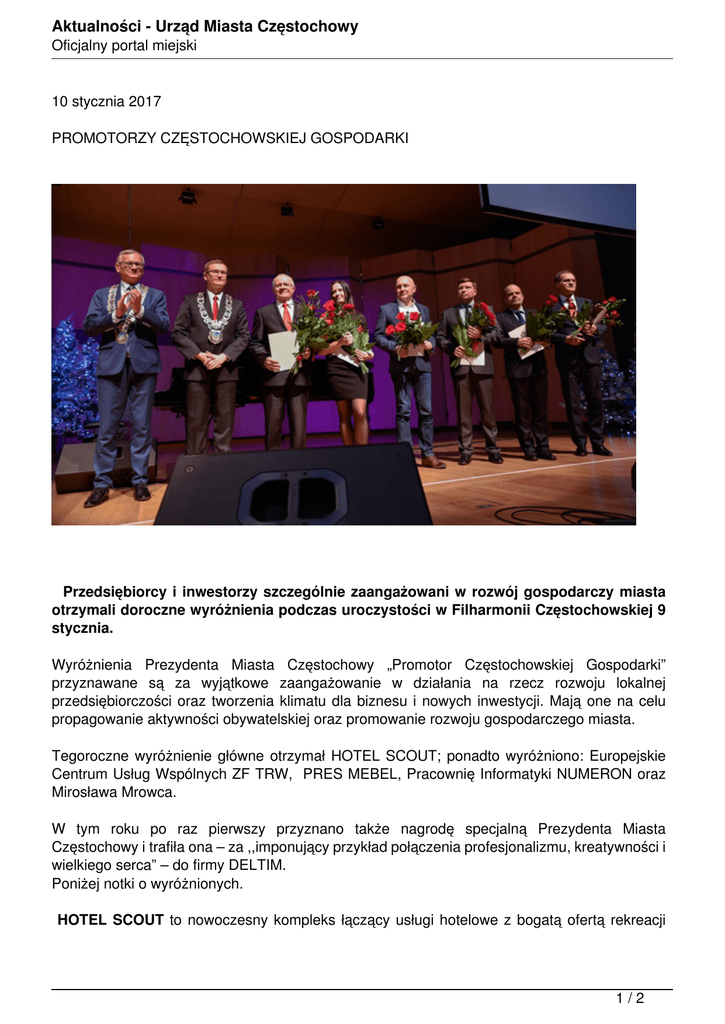 Aktualności - Urząd Miasta Częstochowy Oficjalny portal miejski 10 stycznia 2017 PROMOTORZY CZĘSTOCHOWSKIEJ GOSPODARKI Przedsiębiorcy i inwestorzy szczególnie zaangażowani w rozwój gospodarczy miasta otrzymali doroczne wyróżnienia podczas uroczystości w Filharmonii Częstochowskiej 9 stycznia. Wyróżnienia Prezydenta Miasta Częstochowy „Promotor Częstochowskiej Gospodarki” przyznawane są za wyjątkowe zaangażowanie w działania na rzecz rozwoju lokalnej przedsiębiorczości oraz tworzenia klimatu dla biznesu i nowych inwestycji. Mają one na celu propagowanie aktywności obywatelskiej oraz promowanie rozwoju gospodarczego miasta. Tegoroczne wyróżnienie główne otrzymał HOTEL SCOUT; ponadto wyróżniono: Europejskie Centrum Usług Wspólnych ZF TRW, PRES MEBEL, Pracownię Informatyki NUMERON oraz Mirosława Mrowca. W tym roku po raz pierwszy przyznano także nagrodę specjalną Prezydenta Miasta Częstochowy i trafiła ona – za ,,imponujący przykład połączenia profesjonalizmu, kreatywności i wielkiego serca” – do firmy DELTIM. Poniżej notki o wyróżnionych. HOTEL SCOUT to nowoczesny kompleks łączący usługi hotelowe z bogatą ofertą rekreacji 1/2 Aktualności - Urząd Miasta Częstochowy Oficjalny portal miejski ruchowej. Obiekt wypełnia wcześniej niezagospodarowaną na terenie Częstochowy niszę i ma przez to szczególne miejsce na rynku powierzchni komercyjnych. Inwestycja ta znacząco wzbogaciła także potencjał miasta w zakresie możliwości organizowania targów i konferencji. Europejskie Centrum Usług Wspólnych ZF TRW jest w rejonie Częstochowy liderem w obszarze obsługi finansowo-księgowej, oferując atrakcyjne miejsca pracy dla młodych, dobrze wykształconych osób. Firma TRW– znana jako producent części samochodowych – rozwija jednocześnie w Częstochowie swoje laboratoria badawcze. We wrześniu 2016 roku do użytku został oddany kolejny biurowiec wchodzący w skład Centrum. PRES MEBEL to jedna z najszybciej rozwijających się firm częstochowskich, dynamicznie zwiększająca zatrudnienie, budująca markę rozpoznawalną w kraju i na świecie. Jest jednym z najbardziej doświadczonych producentów funkcjonalnych mebli tapicerowanych o niebanalnym wzornictwie. Wyróżnia się także współpracą ze szkołami technicznymi i zawodowymi. Pracownia Informatyki NUMERON ma swoją siedzibę w Częstochowskim Parku Technologicznym. Zdobyła dobrą pozycję na trudnym rynku cyfryzacji tworząc rozwiązania na bazie najnowszych technologii oraz własnych autorskich koncepcji. Mirosław Mrowiec działa na rynku nieruchomości komercyjnych. Zainwestował w kilka projektów, które mogą stać się impulsem dla kolejnych inwestycji w zakresie powierzchni biurowych wysokiej jakości. Udowodnił, że na trudnym rynku nieruchomości warto inwestować w powierzchnie inne niż handlowe. Dowodem na to są jego inwestycje, które oprócz swojego znaczenia biznesowego przyczyniają się do zmieniania oblicza Częstochowy, jak budynki przy ul. Jasnogórskiej 79 i 96 oraz obecnie realizowany projekt na rogu ul. Racławickiej oraz Żwirki i Wigury. DELTIM – firma już od kilku dziesięcioleci buduje swą pozycję na rynku wózków i fotelików dla dzieci, zapewniając najwyższą jakość, ciekawe wzornictwo i innowacyjne rozwiązania techniczne. DELTIM bezinteresownie przekazuje swoje produkty w ramach częstochowskiego programu in vitro, dając tym samym przykład społecznej odpowiedzialności biznesu w praktyce. mb; foto: Łukasz Kolewiński Pozostałe aktualności 2/2 Powered by TCPDF (www.tcpdf.org)