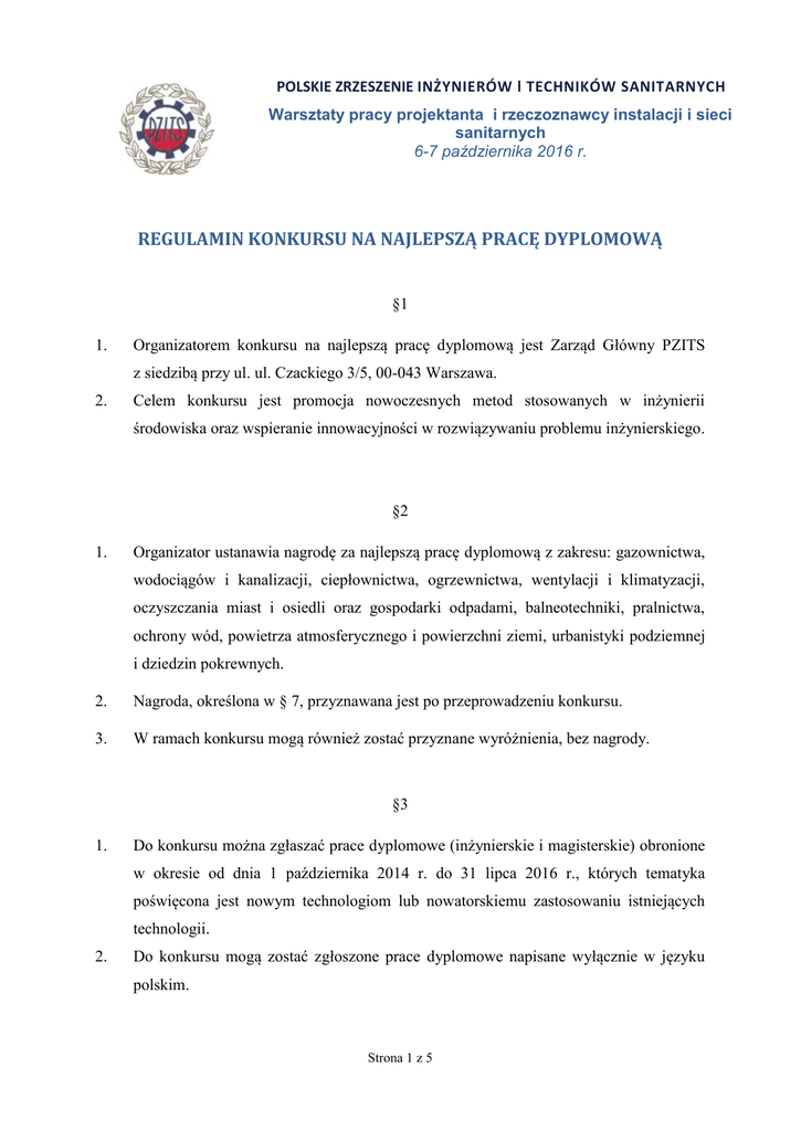 POLSKIE ZRZESZENIE INŻYNIERÓW l TECHNIKÓW SANITARNYCH Warsztaty pracy projektanta i rzeczoznawcy instalacji i sieci sanitarnych 6-7 października 2016 r. REGULAMIN KONKURSU NA NAJLEPSZĄ PRACĘ DYPLOMOWĄ §1 1. Organizatorem konkursu na najlepszą pracę dyplomową jest Zarząd Główny PZITS z siedzibą przy ul. ul. Czackiego 3/5, 00-043 Warszawa. 2. Celem konkursu jest promocja nowoczesnych metod stosowanych w inżynierii środowiska oraz wspieranie innowacyjności w rozwiązywaniu problemu inżynierskiego. §2 1. Organizator ustanawia nagrodę za najlepszą pracę dyplomową z zakresu: gazownictwa, wodociągów i kanalizacji, ciepłownictwa, ogrzewnictwa, wentylacji i klimatyzacji, oczyszczania miast i osiedli oraz gospodarki odpadami, balneotechniki, pralnictwa, ochrony wód, powietrza atmosferycznego i powierzchni ziemi, urbanistyki podziemnej i dziedzin pokrewnych. 2. Nagroda, określona w § 7, przyznawana jest po przeprowadzeniu konkursu. 3. W ramach konkursu mogą również zostać przyznane wyróżnienia, bez nagrody. §3 1. Do konkursu można zgłaszać prace dyplomowe (inżynierskie i magisterskie) obronione w okresie od dnia 1 października 2014 r. do 31 lipca 2016 r., których tematyka poświęcona jest nowym technologiom lub nowatorskiemu zastosowaniu istniejących technologii. 2. Do konkursu mogą zostać zgłoszone prace dyplomowe napisane wyłącznie w języku polskim. Strona 1 z 5 §4 1. Zgłoszenia pracy do konkursu może dokonać wyłącznie autor pracy. 2. Każdy autor może zgłosić do konkursu tylko jedną pracę dyplomową obronioną na ocenę co najmniej bardzo dobrą. 3. Uczelnia, na której praca została złożona i obroniona, powinna mieć swoją siedzibę na terytorium Rzeczypospolitej Polskiej. §5 1. Zgłoszenie powinno obejmować: jeden egzemplarz wydrukowanej pracy dyplomowej w miękkiej oprawie, jeden egzemplarz pracy dyplomowej w wersji elektronicznej (w formacie DOC lub PDF), formularz zgłoszeniowy i oświadczenie (zgodnie ze wzorem – załącznik nr 1) wraz ze zgodą autora pracy na przechowywanie i przetwarzanie danych osobowych dla potrzeb konkursu, publikację jego danych osobowych oraz akceptację warunków konkursu zawartych w Regulaminie, streszczenie pracy określające: cel pracy, główne jej założenia oraz ogólne wnioski. Streszczenie będzie brane pod uwagę przy ocenie pracy, zaświadczenie wydane przez władze uczelni, potwierdzające uzyskaną ocenę z pracy wraz z informacją o terminie obrony pracy. 2. Prace dyplomowe niespełniające kryteriów określonych w §3-6 nie będą oceniane. §6 1. Zgłoszenia konkursowe należy składać do dnia 31 lipca 2016r. za pośrednictwem poczty/firmy kurierskiej lub osobiście na adres Organizatora Konkursu: PZITS Zarząd Główny, ul. Czackiego 3/5, pok. 217, 00-043 Warszawa. 2. O terminie przesłania zgłoszenia do Konkursu decyduje data stempla pocztowego albo potwierdzona data nadania przesyłki. 3. Koszt przesyłki pokrywa autor pracy. 4. Wszystkie zgłoszenia przesłane po dniu 31 lipca 2016 r. nie będą oceniane. Strona 2 z 5 5. Osobami upoważnionymi do udzielania informacji o konkursie jest: dr inż. Piotr Bartkiewicz (Politechnika Warszawska), Mirosława Gębska oraz Justyna Fila (Biuro ZG PZITS), tel/fax: (22) 826 28 94, (22) 827 02 62, tel. 22 55 60 220, e-mail: [email protected] 6. Organizator nie zwraca zgłoszeń. §7 1. Nagrodą pieniężną za najlepszą pracę dyplomową jest kwota 3 000 zł brutto. 2. Wypłacona nagroda będzie pomniejszona o podatek dochodowy od osób fizycznych. §8 1. Nagrodę przyznaje Kapituła Konkursu. 2. W skład Kapituły Konkursu wchodzą: dr hab. Lidia Dąbek, prof. PŚk (Politechnika Świętokrzyska), dr hab. Grzegorz Kaczor (Uniwersytet Rolniczy w Krakowie), mgr inż. Krystyna Korniak – Figa (PZITS), prof. dr hab. inż. Andrzej Osiadacz (Politechnika Warszawska), dr hab. inż. Krzysztof Wojdyga, prof. PW (Politechnika Warszawska) oraz dr inż. Ewa Zaborowska (Politechnika Gdańska). 3. Zadaniem Kapituły Konkursu jest: ocena złożonych prac dyplomowych, wyłonienie najlepszej pracy dyplomowej, przekazanie do Organizatora protokołu z posiedzenia Kapituły Konkursu wraz z nominowaną do nagrody pracą dyplomową w nieprzekraczalnym terminie do 15 września 2016 r. §9 1. Przy wyłanianiu laureatów konkursu Kapituła Konkursu bierze pod uwagę w szczególności: twórcze, pomysłowe spojrzenie na wybrany problem, aspekt badawczy, wykorzystany w pracy dyplomowej, możliwość powszechnego zastosowania wniosków zawartych w pracy, Strona 3 z 5 jakość merytoryczną pracy, ocenę strony formalnej pracy. 2. Kapituła Konkursu wyłania laureatów konkursu na posiedzeniu tajnym. 3. Rozstrzygnięcie konkursu następuje zwykłą większością głosów przy obecności przynajmniej połowy składu Kapituły Konkursu. 4. Wyniki swych prac Kapituła Konkursu przedstawia Prezydium PZITS w formie protokołu. Protokół podpisują wszyscy członkowie Kapituły Konkursu. 5. Od decyzji Kapituły Konkursu nie przysługuje odwołanie. 6. Kapituła Konkursu może zdecydować o nieprzyznaniu nagrody w konkursie. 7. Kapituła Konkursu może zdecydować o przyznaniu dowolnej liczby wyróżnień. 8. Kapituła Konkursu nie może przedłużyć terminu składania zgłoszeń konkursowych oraz zmienić terminu rozstrzygnięcia konkursu 9. Członkowie Kapituły Konkursu pracują społecznie. §10 1. Konkurs zostanie rozstrzygnięty w terminie do dnia 30 września 2016 r. 2. Ogłoszenie wyników nastąpi nie później niż 7 dni po rozstrzygnięciu Konkursu na stronie internetowej Organizatora. 3. Autorzy nadesłanych prac oraz jednostka naukowo-dydaktyczna, w której została wykonana praca, otrzymają pisemne zawiadomienie o wynikach Konkursu 4. Wręczenie nagrody nastąpi podczas Warsztatów pracy projektanta i rzeczoznawcy instalacji i sieci sanitarnych, które odbędą się w dniach 6-7 października 2016 r. Strona 4 z 5 Załącznik nr 1 do Regulaminu konkurs