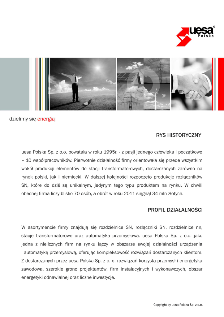 RYS HISTORYCZNY uesa Polska Sp. z o.o. powstała w roku 1995r. - z pasji jednego człowieka i początkowo – 10 współpracowników. Pierwotnie działalność firmy orientowała się przede wszystkim wokół produkcji elementów do stacji transformatorowych, dostarczanych zarówno na rynek polski, jak i niemiecki. W dalszej kolejności rozpoczęto produkcję rozłączników SN, które do dziś są unikalnym, jedynym tego typu produktem na rynku. W chwili obecnej firma liczy blisko 70 osób, a obrót w roku 2011 sięgnął 34 mln złotych. PROFIL DZIAŁALNOŚCI W asortymencie firmy znajdują się rozdzielnice SN, rozłączniki SN, rozdzielnice nn, stacje transformatorowe oraz automatyka przemysłowa. uesa Polska Sp. z o.o. jako jedna z nielicznych firm na rynku łączy w obszarze swojej działalności urządzenia i automatykę przemysłową, oferując kompleksowość rozwiązań dostarczanych klientom. Z dostarczanych przez uesa Polska Sp. z o. o. rozwiązań korzysta przemysł i energetyka zawodowa, szerokie grono projektantów, firm instalacyjnych i wykonawczych, obszar energetyki odnawialnej oraz liczne inwestycje. Copyright by uesa Polska Sp. z o.o.