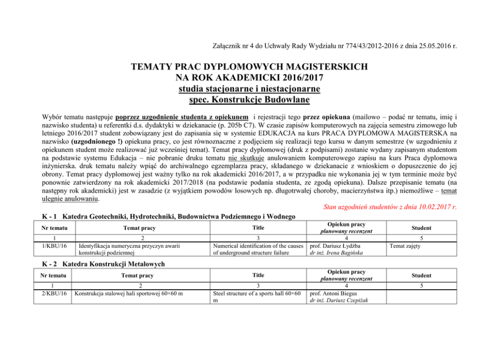 Załącznik nr 4 do Uchwały Rady Wydziału nr 774/43/2012-2016 z dnia 25.05.2016 r. TEMATY PRAC DYPLOMOWYCH MAGISTERSKICH NA ROK AKADEMICKI 2016/2017 studia stacjonarne i niestacjonarne spec. Konstrukcje Budowlane Wybór tematu następuje poprzez uzgodnienie studenta z opiekunem i rejestracji tego przez opiekuna (mailowo – podać nr tematu, imię i nazwisko studenta) u referentki d.s. dydaktyki w dziekanacie (p. 205b C7). W czasie zapisów komputerowych na zajęcia semestru zimowego lub letniego 2016/2017 student zobowiązany jest do zapisania się w systemie EDUKACJA na kurs PRACA DYPLOMOWA MAGISTERSKA na nazwisko (uzgodnionego !) opiekuna pracy, co jest równoznaczne z podjęciem się realizacji tego kursu w danym semestrze (w uzgodnieniu z opiekunem student może realizować już wcześniej temat). Temat pracy dyplomowej (druk z podpisami) zostanie wydany zapisanym studentom na podstawie systemu Edukacja – nie pobranie druku tematu nie skutkuje anulowaniem komputerowego zapisu na kurs Praca dyplomowa inżynierska. druk tematu należy wpiąć do archiwalnego egzemplarza pracy, składanego w dziekanacie z wnioskiem o dopuszczenie do jej obrony. Temat pracy dyplomowej jest ważny tylko na rok akademicki 2016/2017, a w przypadku nie wykonania jej w tym terminie może być ponownie zatwierdzony na rok akademicki 2017/2018 (na podstawie podania studenta, ze zgodą opiekuna). Dalsze przepisanie tematu (na następny rok akademicki) jest w zasadzie (z wyjątkiem powodów losowych np. długotrwałej choroby, macierzyństwa itp.) niemożliwe – temat ulegnie anulowaniu. Stan uzgodnień studentów z dnia 10.02.2017 r. K - 1 Katedra Geotechniki, Hydrotechniki, Budownictwa Podziemnego i Wodnego Nr tematu 1 1/KBU/16 Temat pracy 2 Identyfikacja numeryczna przyczyn awarii konstrukcji podziemnej Title 3 Numerical identification of the causes of underground structure failure Opiekun pracy planowany recenzent 4 prof. Dariusz Łydżba dr inż. Irena Bagińska Student 5 Temat zajęty K - 2 Katedra Konstrukcji Metalowych Nr tematu 1 2/KBU/16 Temat pracy 2 Konstrukcja stalowej hali sportowej 60×60 m Title 3 Steel structure of a sports hall 60×60 m Opiekun pracy planowany recenzent 4 prof. Antoni Biegus dr inż. Dariusz Czepiżak Student 5 3/KBU/16 Stalowe wieże oświetleniowe stadionu piłkarskiego 4/KBU/16 Konstrukcja stalowej hali sportowej 72 × 72 m 5/KBU/16 Konstrukcja stalowego dachu nad basenem 6/KBU/16 Konstrukcja stalowej hali magazynowej o rozpiętości 3×24 m i wysokości 18 m 7/KBU/16 Analiza systemów lekkiej obudowy z płyt warstwowych pod kątem ich przydatności do projektowania Dwupłaszczowe zbiorniki walcowe na paliwa płynne 18/KBU/16 Zadaszenie terminalu dworca lotniczego Steel structures of lighting towers for stadiums football Steel structure of a sports hall 72 × 72 m Steel structure of roof for a swimming pool Steel structure of the steel storage hall with span of 3×24 m and high 18 m An analysis of lightweight cladding made of sandwich panels due to their design usefulness Cylindrical double-shell tanks for liquid fuels Flat-bottomed silos for grain made of corrugated sheets Steel structures of conveyor trestles for coal in power plants Steel structures of observation towers in the forest areas Steel structures of observation decks placed on a steep slope Crossing for Animals over fast road using composite steel and concrete beams in frame system Pedestrian bridge using composite steel and concrete beams in continuous beam system The steel structure of belt conveyor wharf The steel tower with a height of 320 meters Service hangar for aircraft Antonov AN-225 Mriya The roof of the terminal air station 19/KBU/16 Optymalizacja zbiornika z dachem stałym na alkohol etylowy w Polmos Siedlce Optimizing the tank with a fixed roof on ethyl alcohol Polmos Siedlce 8/KBU/16 9/KBU/16 10/KBU/16 11/KBU/16 12/KBU/16 13/KBU/16 14/KBU/16 Płaskodenne silosy z blach falistych do magazynowania zboża Stalowe konstrukcje estakad przenośników węgla w elektrowniach Stalowe konstrukcje wież obserwacyjnych na terenach leśnych Stalowe konstrukcje tarasów widokowych na stromych zboczach górskich Przejście ekologiczne dla zwierząt nad drogą ekspresową w formie ramy o ryglu zespolonym stalowo-betonowym Kładka belkowa o konstrukcji zespolonej stalowobetonowej o schemacie statycznym belki ciągłej 15/KBU/16 Stalowa konstrukcja estakady pod przenośnik taśmowy 16/KBU/16 Wieża stalowa o wysokości 320 m 17/KBU/16 Hangar serwisowy samolotu Antonov AN-225 Mriya prof. Antoni Biegus dr inż. Dariusz Czepiżak prof. Antoni Biegus dr inż. Dawid Mądry prof. Antoni Biegus dr inż. Maciej Kożuch prof. Antoni Biegus dr inż. Dariusz Czepiżak prof. Bronisław Gosowski dr inż. Jan Gierczak prof. Bronisław Gosowski dr inż. Jan Rządkowski prof. Eugeniusz Hotała dr inż. Łukasz Skotny prof. Eugeniusz Hotała dr inż. Jan Rządkowski prof. Eugeniusz Hotała dr inż. Jacek Dudkiewicz prof. Eugeniusz Hotała dr inż. Rajmund Ignatowicz prof. Wojciech Lorenc dr inż. Maciej Kożuch Temat zajęty Temat zajęty Temat zajęty Temat zajęty prof. Wojciech Lorenc dr inż. Maciej Kożuch prof. Wojciech Lorenc dr inż. Jan Gierczak dr inż. Dariusz Czepiżak prof. Wojciech Lorenc dr inż. Dariusz Czepiżak prof. Antoni Biegus dr inż. Dariusz Czepiżak prof. Antoni Biegus dr inż. Jan Gierczak prof. Eugeniusz Hotała Temat zajęty Temat zajęty Temat zajęty Temat zajęty Temat zajęty 20/KBU/16 Hale przemysłowe z suwnicami natorowymi pracującymi na różnych poziomach 21/KBU/16 Zbiorniki aluminiowe naziemne z dachem stałym i pływającym 22/KBU/16 Analiza stalowej kratowej konstrukcji wsporczej dwutorowej linii elektroenergetycznej wysokiego napięcia w świetle obowiązujących norm 28/KBU/16 Walcowe naziemne zbiorniki na paliwa płynne Industrial halls with cranes retarders working at different levels Containers made of aluminum ground with a fixed and floating roof Analysis of a steel lattice towe