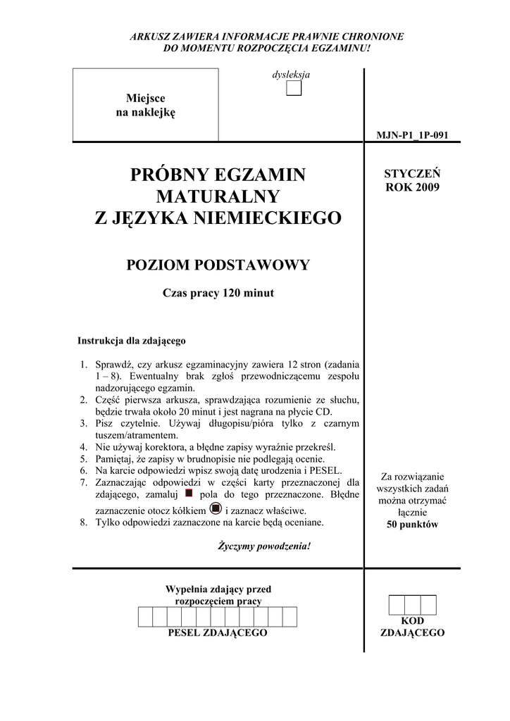 ARKUSZ ZAWIERA INFORMACJE PRAWNIE CHRONIONE DO MOMENTU ROZPOCZĘCIA EGZAMINU! dysleksja Miejsce na naklejkę MJN-P1_1P-091 PRÓBNY EGZAMIN MATURALNY Z JĘZYKA NIEMIECKIEGO STYCZEŃ ROK 2009 POZIOM PODSTAWOWY Czas pracy 120 minut Instrukcja dla zdającego 1. Sprawdź, czy arkusz egzaminacyjny zawiera 12 stron (zadania 1 – 8). Ewentualny brak zgłoś przewodniczącemu zespołu nadzorującego egzamin. 2. Część pierwsza arkusza, sprawdzająca rozumienie ze słuchu, będzie trwała około 20 minut i jest nagrana na płycie CD. 3. Pisz czytelnie. Używaj długopisu/pióra tylko z czarnym tuszem/atramentem. 4. Nie używaj korektora, a błędne zapisy wyraźnie przekreśl. 5. Pamiętaj, że zapisy w brudnopisie nie podlegają ocenie. 6. Na karcie odpowiedzi wpisz swoją datę urodzenia i PESEL. 7. Zaznaczając odpowiedzi w części karty przeznaczonej dla zdającego, zamaluj pola do tego przeznaczone. Błędne i zaznacz właściwe. zaznaczenie otocz kółkiem 8. Tylko odpowiedzi zaznaczone na karcie będą oceniane. Za rozwiązanie wszystkich zadań można otrzymać łącznie 50 punktów Życzymy powodzenia! Wypełnia zdający przed rozpoczęciem pracy PESEL ZDAJĄCEGO KOD ZDAJĄCEGO Próbny egzamin maturalny z języka niemieckiego Poziom podstawowy 2 ROZUMIENIE ZE SŁUCHU Zadanie 1. (5 pkt) Zapoznaj się z treścią zadania (1.1. – 1.5). Usłyszysz dwukrotnie tekst o panu King. Zaznacz znakiem X w tabeli, które z podanych informacji są zgodne z jego treścią (richtig – R), a które nie (falsch – F). Za każde poprawne rozwiązanie otrzymasz 1 punkt. R 1.1. Paul King besuchte seine Freunde auf dem Lande. 1.2. Paul King wurde das Auto gestohlen. 1.3. Am Anfang war die Polizei ratlos. 1.4. Er hat sein Auto über ein halbes Jahr lang gesucht. 1.5. Der Bericht betrifft die Probleme eines Polizisten. F PRZENIEŚ ROZWIĄZANIA NA KARTĘ ODPOWIEDZI! Zadanie 2. (5 pkt) Zapoznaj się z treścią zadania (2.1. – 2.5). Następnie wysłuchaj dwukrotnie tekstu, w którym troje ludzi opowiada o niemieckim mieście. Zaznacz znakiem X w tabeli, do kogo odnoszą się podane informacje. Za każde poprawne rozwiązanie otrzymasz 1 punkt. Alejandro 2.1. _____ war von einem früheren Aufenthalt in Hamburg begeistert. 2.2. _____ macht gern Einkäufe in dieser Stadt. 2.3. _____ möchte in Zukunft in Deutschland arbeiten. _____ ist vor Jahren zum Studium in Deutschland gewesen. _____ genießt die Wassersportmöglichkeiten dieser 2.5. Stadt. 2.4. PRZENIEŚ ROZWIĄZANIA NA KARTĘ ODPOWIEDZI! Erika Timothy Próbny egzamin maturalny z języka niemieckiego Poziom podstawowy 3 Zadanie 3. (5 pkt) Zapoznaj się z treścią zadania (3.1. – 3.5). Po dwukrotnym wysłuchaniu wywiadu z Mirko Fillbrunn, wybierz właściwe, zgodne z jego treścią odpowiedzi na pytania, zakreślając literę A, B lub C. Za każde poprawne rozwiązanie otrzymasz 1 punkt. Was sagt Mirko Fillbrunn ... 3.1. über seine Schulkarriere? A. Er lernt in der Schule und studiert zugleich. B. Er macht in vier Jahren das Abitur. C. Er studiert an einer Hochschule. 3.2. über das Studentenleben? A. Er besucht gern Partys. B. Er wohnt in einer Wohngemeinschaft. C. Er nimmt an einem Projekt teil. 3.3. über Sport? A. Er trainiert in einem Klub. B. Wegen des Sports hat er Probleme mit seinen Eltern. C. Er trainiert zweimal pro Woche. 3.4. über seine Leistungen? A. Früher hatte er nur sehr gute Noten. B. Er ist in einer Prüfung durchgefallen. C. Informatik ist sein Lieblingsfach. 3.5. über seine Zukunft? A. Mit 16 möchte er sein Diplom machen. B. Nach dem Studium möchte er eine Pause machen. C. Er möchte im Ausland studieren. PRZENIEŚ ROZWIĄZANIA NA KARTĘ ODPOWIEDZI! Próbny egzamin maturalny z języka niemieckiego Poziom podstawowy 4 ROZUMIENIE TEKSTU CZYTANEGO Zadanie 4. (7 pkt) Przeczytaj fragmenty tekstu (4.1. – 4.7.), a następnie zamieszczone poniżej tytuły. Dobierz do każdego fragmentu właściwy tytuł. Dwa tytuły nie pasują do żadnego fragmentu. Za każde poprawne rozwiązanie otrzymasz 1 punkt. DIE WEIHNACHTSGESCHICHTE 4.1. ___________ Als kleiner Junge hatte ich mir das ganze Jahr über immer wieder die Schaufenster des Eisenbahngeschäfts angeschaut. Dort standen bunte Lokomotiven, verschiedene Wagen und kleine Häuser. Jedes Mal, wenn ich mit meiner Mutter in die Stadt ging, blieb ich an diesem Laden stehen. Ein großes Schaufenster trennte mich von der erträumten Lokomotive. 4.2. ___________ Ich hatte sie so oft bei meinem Freund Ralf gesehen. Er hatte häufig damit gespielt und mich auch immer dazu eingeladen. Jedes Mal freute ich mich sehr, wenn das Gespräch darauf kam oder wir uns wieder mal gegenseitig die schönen Erlebnisse vergangener Weihnachtstage erzählten. Ich war aber auch neidisch auf ihn und andere Freunde. Sie konnten alles von ihren Eltern bekommen, was sie wollten. 4.3. ___________ Auch diesmal, als wir die schönen Schaufenster betrachteten, sah die Mutter meinen traurigen Blick. Sie umarmte mich und wir gingen schnell weiter. Ich wusste, dass sie, seit Papa nicht mehr lebte, sehr auf das Geld achten musste. Sie ging von früh bis spät arbeiten, aber es reichte manchmal einfach nicht. 4.4. ___________ Wir gingen dann auch bald wieder nach Hause. Spät abends klingelte das Telefon und während des Gesprächs sah ich meine Mutter zum ersten Mal nach langer Zeit wieder lächeln. Sie schien auch Tränen in den Augen zu haben. Als sie den Hörer auflegte, sagte sie mir, dass Ralf mich grüßen ließ. Ich sagte „danke“ und ging auf mein Zimmer. 4.5. ___________ In der Nacht konnte ich nicht ruhig schlafen. Ich war unglücklich. Als ich endlich eingeschlafen war, sah ich eine große schwarze Lokomotive, die auf meinem Teppich stand. Ich wollte sie berühren, aber sie verschwand schnell in der Dunkelheit. 4.6. ___________ Die letzten zwei Tage vergingen sehr schnell und, als ich an diesem Morgen auf den Kalender schaute, zeigte er den 24.12. an. Es war also Heiligabend. Die letzten Einkäufe. Meine Mut