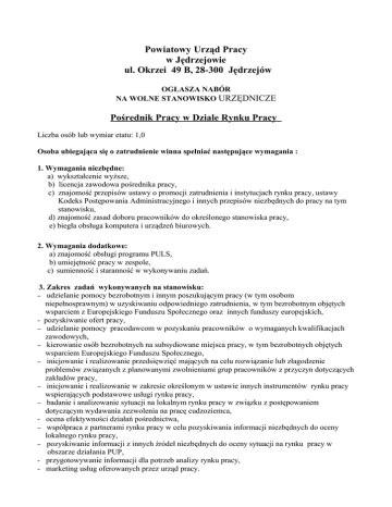Powiatowy Urząd Pracy w Jędrzejowie ul. Okrzei 49 B, 28-300 Jędrzejów OGŁASZA NABÓR NA WOLNE STANOWISKO URZĘDNICZE Pośrednik Pracy w Dziale Rynku Pracy Liczba osób lub wymiar etatu: 1,0 Osoba ubiegająca się o zatrudnienie winna spełniać następujące wymagania : 1. Wymagania niezbędne: a) wykształcenie wyższe, b) licencja zawodowa pośrednika pracy, c) znajomość przepisów ustawy o promocji zatrudnienia i instytucjach rynku pracy, ustawy Kodeks Postępowania Administracyjnego i innych przepisów niezbędnych do pracy na tym stanowisku, d) znajomość zasad doboru pracowników do określonego stanowiska pracy, e) biegła obsługa komputera i urządzeń biurowych. 2. Wymagania dodatkowe: a) znajomość obsługi programu PULS, b) umiejętność pracy w zespole, c) sumienność i staranność w wykonywaniu zadań. 3. Zakres zadań wykonywanych na stanowisku: udzielanie pomocy bezrobotnym i innym poszukującym pracy (w tym osobom niepełnosprawnym) w uzyskiwaniu odpowiedniego zatrudnienia, w tym bezrobotnym objętych wsparciem z Europejskiego Funduszu Społecznego oraz innych funduszy europejskich, - pozyskiwanie ofert pracy, – udzielanie pomocy pracodawcom w pozyskaniu pracowników o wymaganych kwalifikacjach zawodowych, – kierowanie osób bezrobotnych na subsydiowane miejsca pracy, w tym bezrobotnych objętych wsparciem Europejskiego Funduszu Społecznego, – inicjowanie i realizowanie przedsięwzięć mających na celu rozwiązanie lub złagodzenie problemów związanych z planowanymi zwolnieniami grup pracowników z przyczyn dotyczących zakładów pracy, – inicjowanie i realizowanie w zakresie określonym w ustawie innych instrumentów rynku pracy wspierających podstawowe usługi rynku pracy, – badanie i analizowanie sytuacji na lokalnym rynku pracy w związku z postępowaniem dotyczącym wydawania zezwolenia na pracę cudzoziemca, - ocena efektywności działań pośrednictwa, – współpraca z partnerami rynku pracy w celu pozyskiwania informacji niezbędnych do oceny lokalnego rynku pracy, – pozyskiwanie informacji z innych źródeł niezbędnych do oceny sytuacji na rynku pracy w obszarze działania PUP, - przygotowywanie informacji dla potrzeb analizy rynku pracy, - marketing usług oferowanych przez urząd pracy. – 4. Wymagane dokumenty: a) list motywacyjny, b) życiorys – curriculum vitae, c) licencja zawodowa pośrednika pracy, d) kserokopia dowodu osobistego, e) kserokopie świadectw pracy, ewentualnie zaświadczenie potwierdzające zatrudnienie i staż pracy w przypadku aktualnego świadczenia pracy przez kandydata, f) kserokopie dokumentów potwierdzających wykształcenie (świadectwa, dyplomy), g) kserokopie zaświadczeń o ukończonych kursach, szkoleniach, h) ewentualne referencje, i) kwestionariusz osobowy - wzór do pobrania ze strony Biuletynu Informacji Publicznej (www.jedrzejow.finn.pl), ze strony internetowej Powiatowego Urzędu Pracy (www.pupjedrzejow.enetia.pl), lub w siedzibie Urzędu Pracy – pokój nr.111 kadry - II piętro, j) zaświadczenie kandydata o nie karalności wydane przez Krajowy Rejestr Karny przy właściwym Sądzie Okręgowym, k) oświadczenie kandydata o korzystaniu z pełni praw publicznych, l) zaświadczenie lekarskie o stanie zdrowia (stwierdzające ogólny stan zdrowia). ł) oświadczenie kandydata o wyrażeniu zgody na przetwarzanie danych osobowych zawartych w ofercie pracy dla potrzeb niezbędnych do realizacji procesu rekrutacji zgodnie z ustawą z dnia 29 sierpnia 1997 r. o ochronie danych osobowych (Dz. U. z 2002r. Nr 101, poz. 926 z późn. zm.) oraz ustawą z dnia 22 marca 1990r. o pracownikach samorządowych ( Dz. U. z 2001r. Nr 142, poz. 1593 z późn. zm.). Kserokopie dokumentów winny być potwierdzone za zgodność z oryginałem przez osobę zainteresowaną ubiegającą się o zatrudnienie. 5. Miejsce i termin składania dokumentów Wymagane dokumenty aplikacyjne należy składać osobiście w sekretariacie urzędu, pokój nr 14 w godz. od 715 do 1515 lub pocztą na adres urzędu ul. Okrzei 49B, 28-300 Jędrzejów, w terminie do dnia 28 kwietnia 2008r.( za datę dostarczenia uważa się datę wpływu do PUP) z dopiskiem na kopercie : Dotyczy naboru na stanowisko Pośrednik Pracy w Dziale Rynku Pracy. Termin otwarcia ofert ustala się na dzień 29 kwietnia 2008r. Aplikacje, które wpłyną do urzędu po wyżej określonym terminie nie będą rozpatrywane. Informacja o wyniku naboru będzie umieszczana w Biuletynie Informacji Publicznej (www.jedrzejow.finn.pl), na stronie internetowej Urzędu (www.pupjedrzejow.enetia.pl) oraz na tablicy informacyjnej w Powiatowym Urzędzie Pracy w Jędrzejowie.