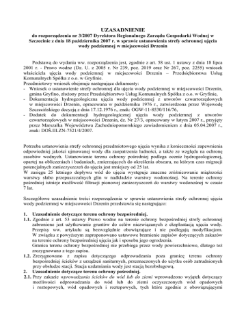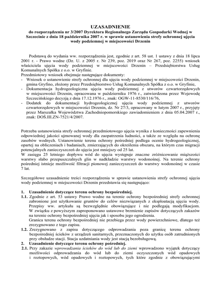 UZASADNIENIE do rozporządzenia nr 3/2007 Dyrektora Regionalnego Zarządu Gospodarki Wodnej w Szczecinie z dnia 18 października 2007 r. w sprawie ustanowienia strefy ochronnej ujęcia wody podziemnej w miejscowości Drzenin Podstawą do wydania ww. rozporządzenia jest, zgodnie z art. 58 ust. 1 ustawy z dnia 18 lipca 2001 r. - Prawo wodne (Dz. U. z 2005 r. Nr 239, poz. 2019 oraz Nr 267, poz. 2255) wniosek właściciela ujęcia wody podziemnej w miejscowości Drzenin – Przedsiębiorstwa Usług Komunalnych Spółka z o.o. w Gryfinie. Przedmiotowy wniosek obejmuje następujące dokumenty: - Wniosek o ustanowienie strefy ochronnej dla ujęcia wody podziemnej w miejscowości Drzenin, gmina Gryfino, złożony przez Przedsiębiorstwo Usług Komunalnych Spółka z o.o. w Gryfinie, - Dokumentacja hydrogeologiczna ujęcia wody podziemnej z utworów czwartorzędowych w miejscowości Drzenin, opracowana w październiku 1976 r., zatwierdzona przez Wojewodę Szczecińskiego decyzją z dnia 17.12.1976 r., znak: OGW-11-8530/116/76, - Dodatek do dokumentacji hydrogeologicznej ujęcia wody podziemnej z utworów czwartorzędowych w miejscowości Drzenin, dz. Nr 27/3, opracowany w lutym 2007 r., przyjęty przez Marszałka Województwa Zachodniopomorskiego zawiadomieniem z dnia 05.04.2007 r., znak: DOŚ.III.ZN-7521/4/2007. Potrzeba ustanowienia strefy ochronnej przedmiotowego ujęcia wynika z konieczności zapewnienia odpowiedniej jakości ujmowanej wody dla zaopatrzenia ludności, a także ze względu na ochronę zasobów wodnych. Ustanowienie terenu ochrony pośredniej podlega ocenie hydrogeologicznej, opartej na obliczeniach i badaniach, zmierzających do określenia obszaru, na którym czas migracji potencjalnych zanieczyszczeń do ujęcia jest mniejszy od 25 lat. W zasięgu 25 letniego dopływu wód do ujęcia występuje znaczne zróżnicowanie miąższości warstwy słabo przepuszczalnych glin w nadkładzie warstwy wodonośnej. Na terenie ochrony pośredniej istnieje możliwość filtracji pionowej zanieczyszczeń do warstwy wodonośnej w czasie 7 lat. Szczegółowe uzasadnienie treści rozporządzenia w sprawie ustanowienia strefy ochronnej ujęcia wody podziemnej w miejscowości Drzenin przedstawia się następująco: 1. Uzasadnienie dotyczące terenu ochrony bezpośredniej. 1.1. Zgodnie z art. 53 ustawy Prawo wodne na terenie ochrony bezpośredniej strefy ochronnej zabronione jest użytkowanie gruntów do celów niezwiązanych z eksploatacją ujęcia wody. Przepisy ww. artykułu są bezwzględnie obowiązujące i nie podlegają modyfikacjom. W związku z powyższym zaproponowano ustawowe brzmienie zapisów dotyczących zakazów na terenie ochrony bezpośredniej ujęcia jak i sposobu jego ogrodzenia. Granica terenu ochrony bezpośredniej nie przebiega przez wody powierzchniowe, dlatego też zrezygnowano z tego zapisu. 1.2. Zrezygnowano z zapisu dotyczącego odprowadzania poza granicę terenu ochrony bezpośredniej ścieków z urządzeń sanitarnych, przeznaczonych do użytku osób zatrudnionych przy obsłudze stacji. Stacja uzdatniania wody jest stacją bezobsługową. 2. Uzasadnienie dotyczące terenu ochrony pośredniej. 2.1. Przy zakazie wprowadzania ścieków do wód lub do ziemi wprowadzono wyjątek dotyczący możliwości odprowadzania do wód lub do ziemi oczyszczonych wód opadowych i roztopowych, wód opadowych i roztopowych, tych które zgodnie z obowiązującymi przepisami mogą być wprowadzone do wód lub do ziemi bez oczyszczenia oraz oczyszczonych ścieków pochodzących ze stacji uzdatniania wody. Zgodnie z §19 rozporządzenia Ministra Środowiska z dnia 24 lipca 2006 r. (Dz. U. Nr 137, poz. 984) w sprawie warunków jakie należy spełnić przy wprowadzaniu ścieków do wód lub do ziemi, oraz w sprawie substancji szczególnie szkodliwych dla środowiska wodnego, wody opadowe i roztopowe ujęte w szczelne, otwarte lub zamknięte systemy kanalizacyjne pochodzące z powierzchni innych niż z zanieczyszczonej powierzchni szczelnej terenów przemysłowych, składowych, baz transportowych, portów, lotnisk, miast, budowli kolejowych, dróg zaliczanych do kategorii dróg krajowych, wojewódzkich i powiatowych klasy G, z parkingów o powierzchni powyżej 0,1 ha oraz z powierzchni szczelnej obiektów magazynowania i dystrybucji paliw, mogą być wprowadzane do wód lub do ziemi bez oczyszczenia. Uwzględniając powyższe dopuszczono wprowadzenie tych wód na terenie ochrony pośredniej tego ujęcia. Dopuszczenie wymienionego wyjątku na terenie ochrony pośredniej nie będzie stanowić zagrożenia dla jakości ujmowanych wód oraz wpłynie na zwiększenie zasilania użytkowego poziomu wodonośnego. Złagodzenie zakazu dotyczącego wprowadzenia ścieków do wód lub do ziemi nie powinno spowodować nadmiernego obciążenia środowiska. 2.2. Zakaz odnośnie rolniczego wykorzystania ścieków jest konieczny dla zapewnienia odpowiedniej jakości wód podziemnych ujmowanych na ujęciu. Rolnicze wykorzystanie ścieków powoduje, iż na dużych obszarach wody podziemne, w wyniku infiltracji ścieków, zanieczyszczane są przede wszystkim przez azotany, siarczany, chlorki oraz inne substancje zawarte w ściekach. 2.3. Zakaz stosowania nawozów wynika z faktu zagrożenia zanieczyszczenia wód podziemnych związkami azotowymi i dotyczy nawozów mineralnych i naturalnych. Dopuszczono stosowanie nawozów organicznych, tj. nawozów wyprodukowanych z substancji organicznej lub z mieszanin substancji organicznych, w tym kompostów, także wyprodukowanych przy udziale dżdżownic, ponieważ skład tych nawozów nie powoduje znaczącego zagrożenia dla jakości wód podziemnych. 2.4. Zakaz stosowania środków ochrony roślin za wyjątkiem dopuszczonych do stosowania w strefach ochronnych ujęć wody wprowadzono uwzględniając występowanie na obszarze strefy ochronnej gruntów ornych, łąk i lasów. Zakaz ten ma na celu stosowanie tylko środków dopuszczonych do stosowania w strefach ochronnych ujęć